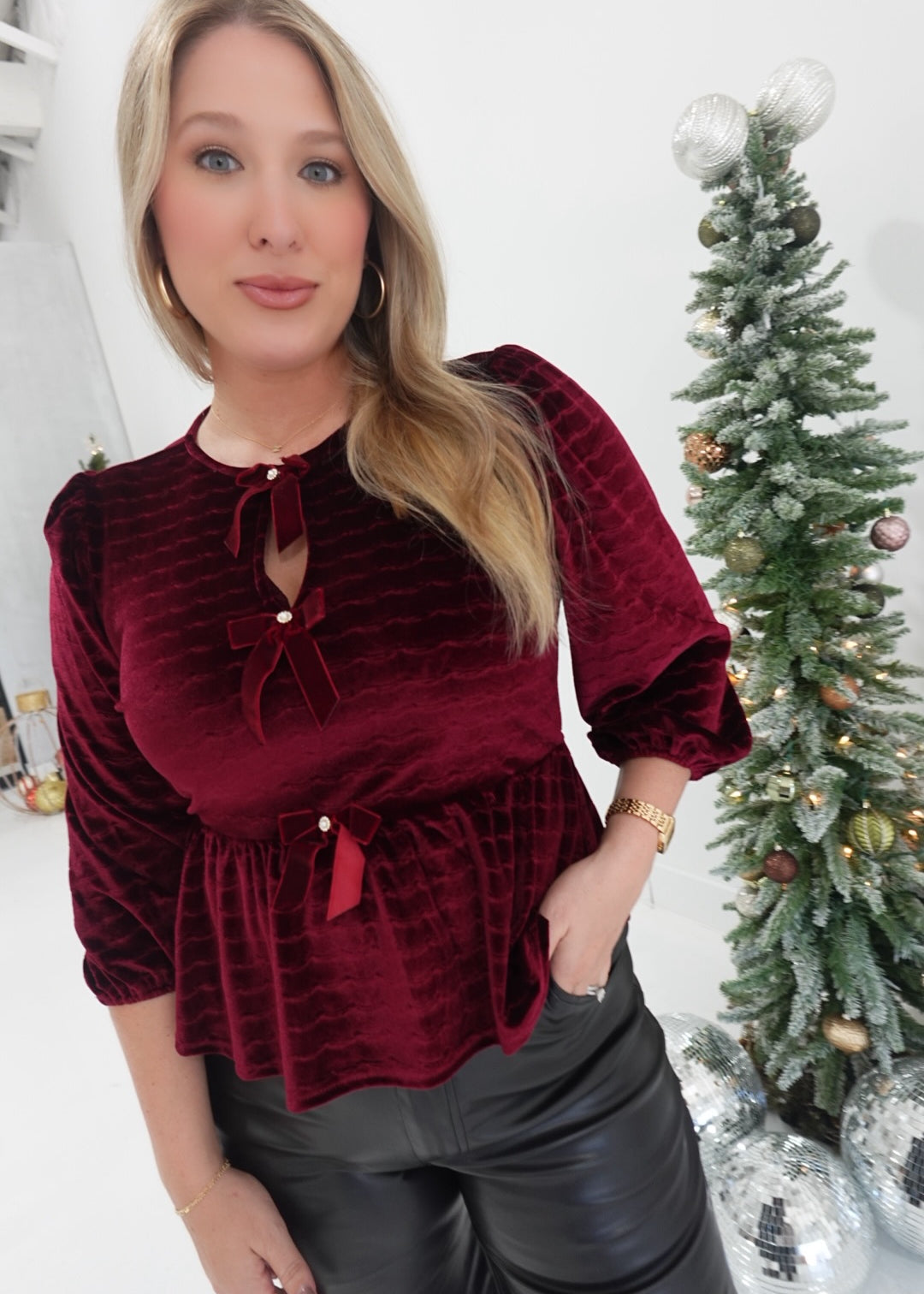 Seasonal Velvet Bow Top - Burgundy