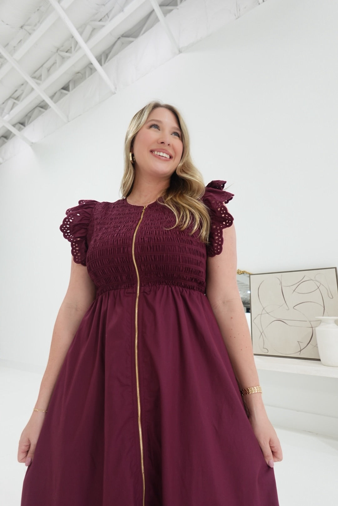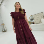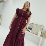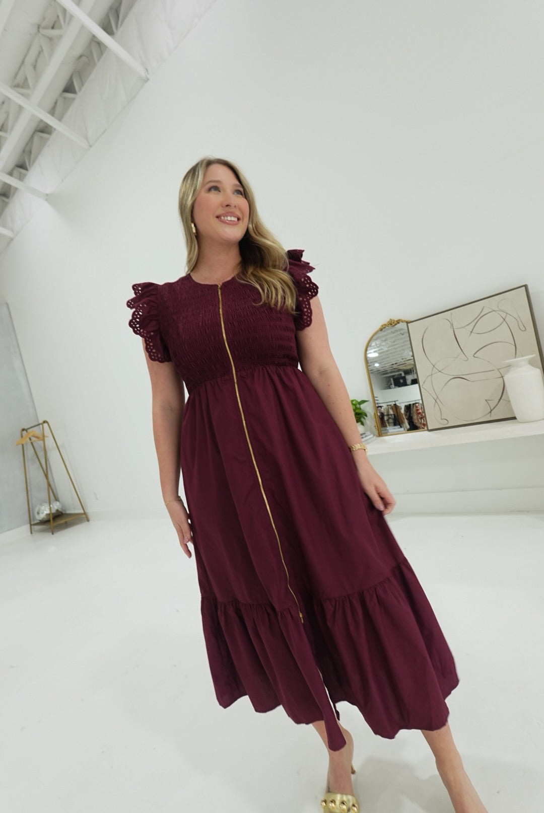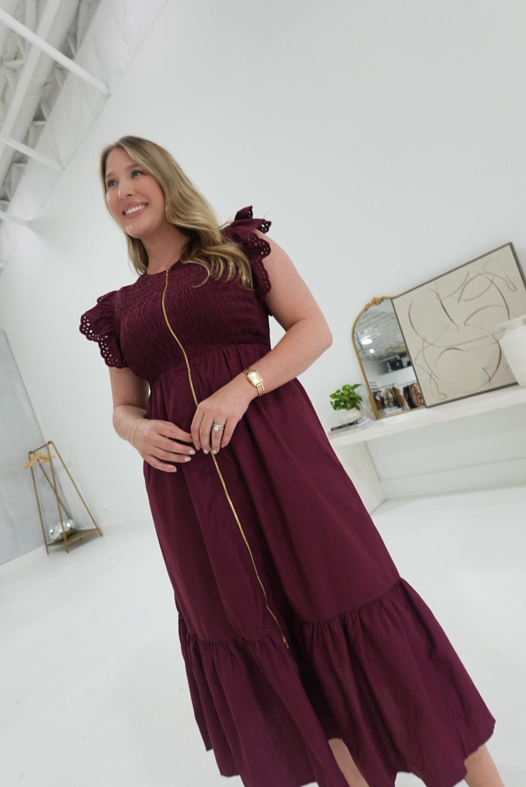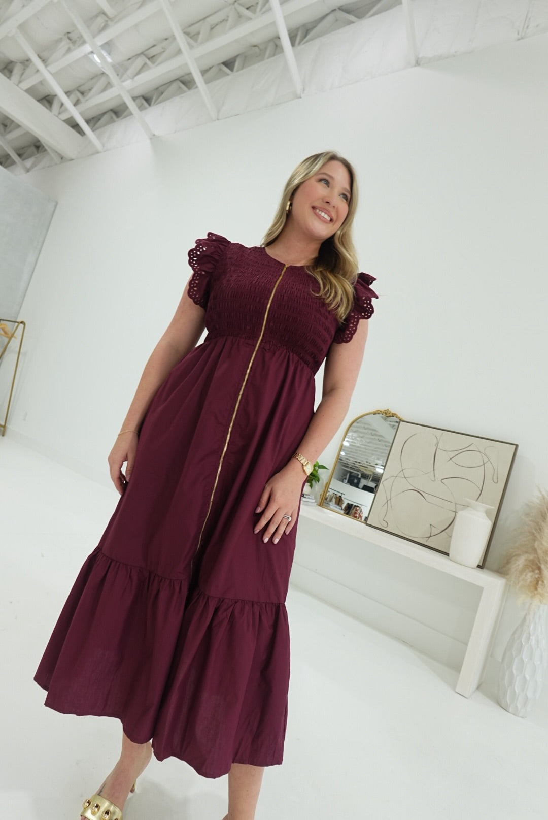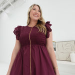 The Abaline Midi Dress in Burgundy features a comfortable smocked bodice that gently hugs your silhouette. Its eyelet flutter sleeves add a delicate, feminine touch, while the front zipper closure offers ease and convenience. Perfect for versatile styling, this dress combines effortless elegance with practical comfort.