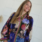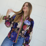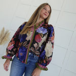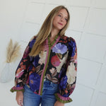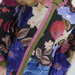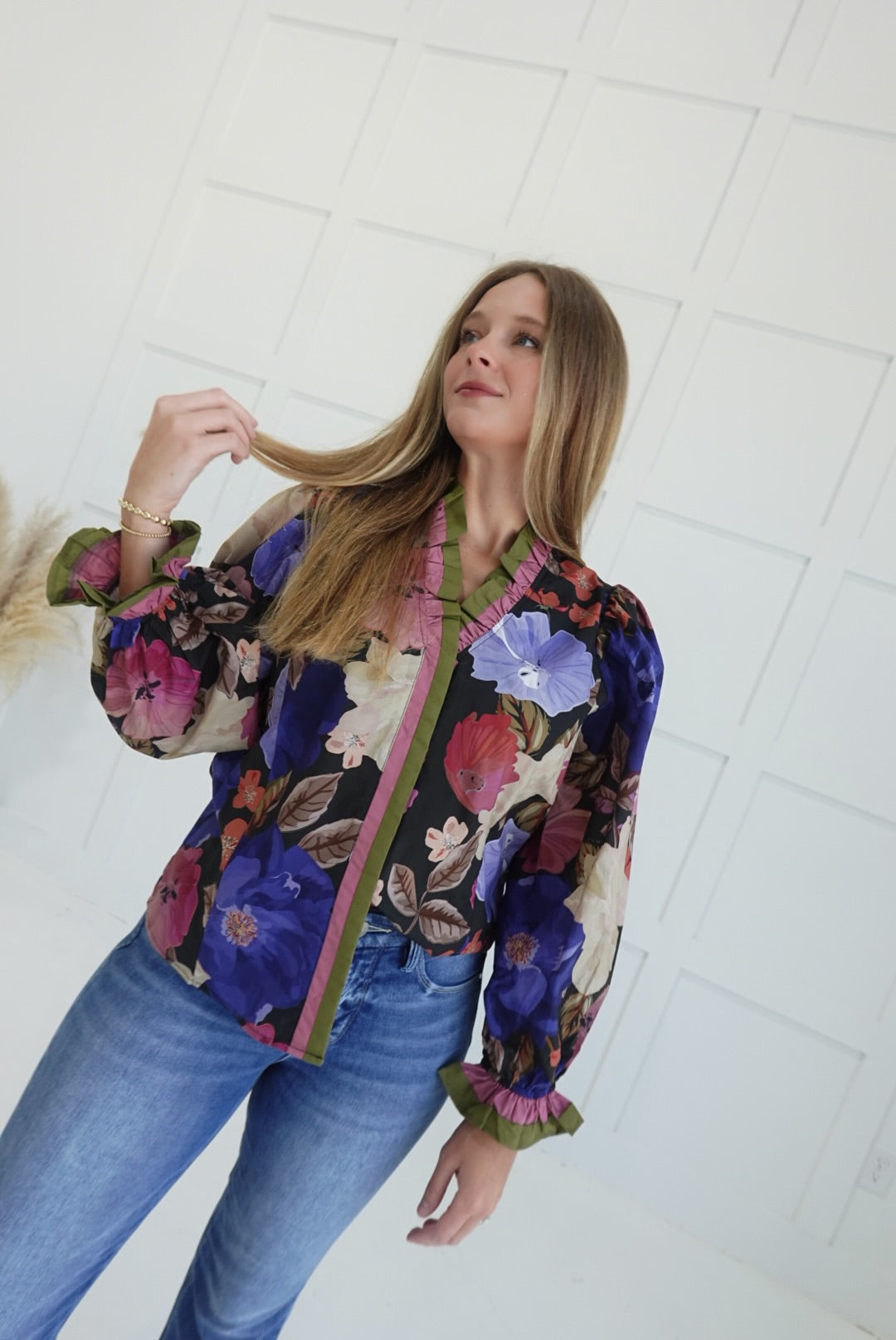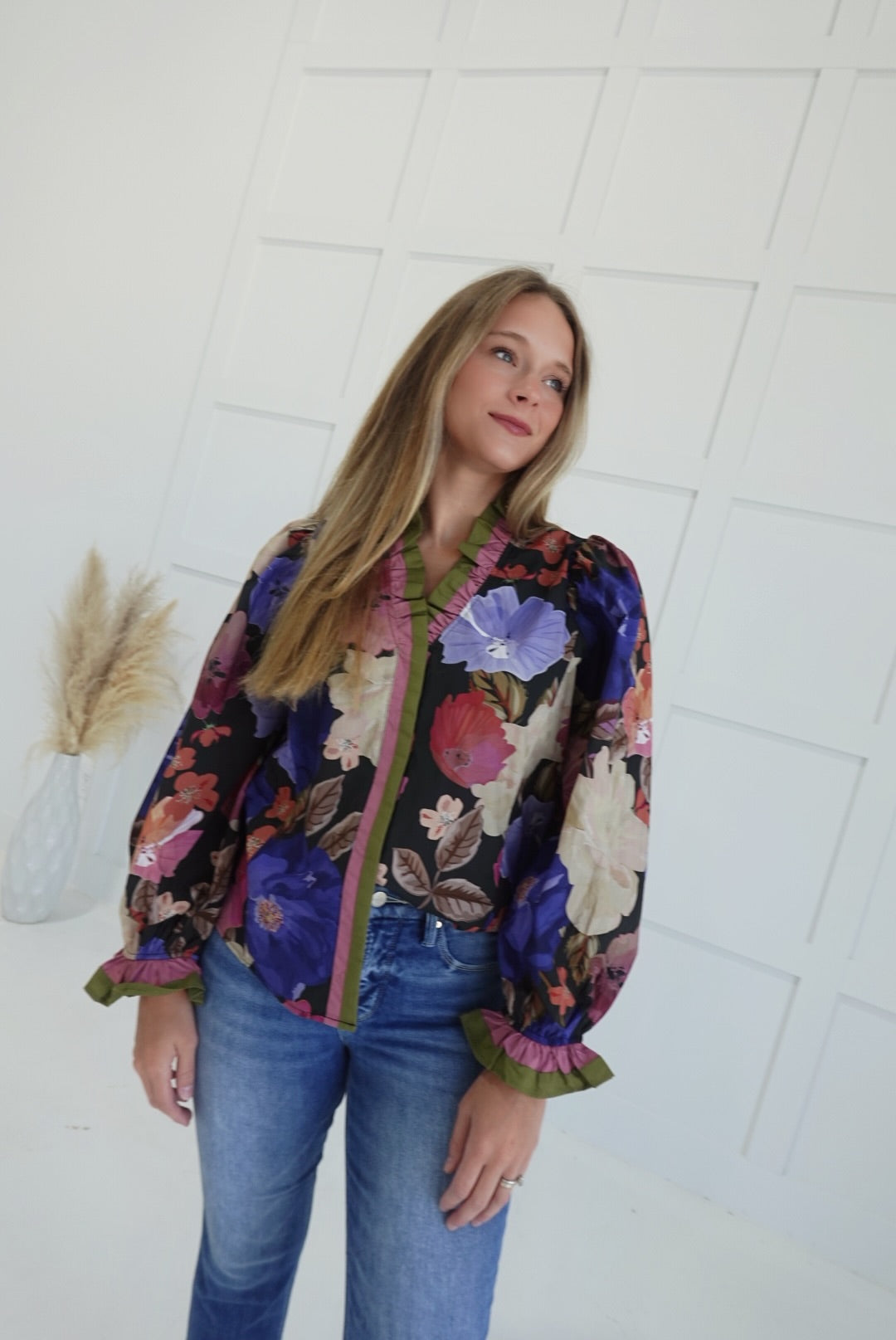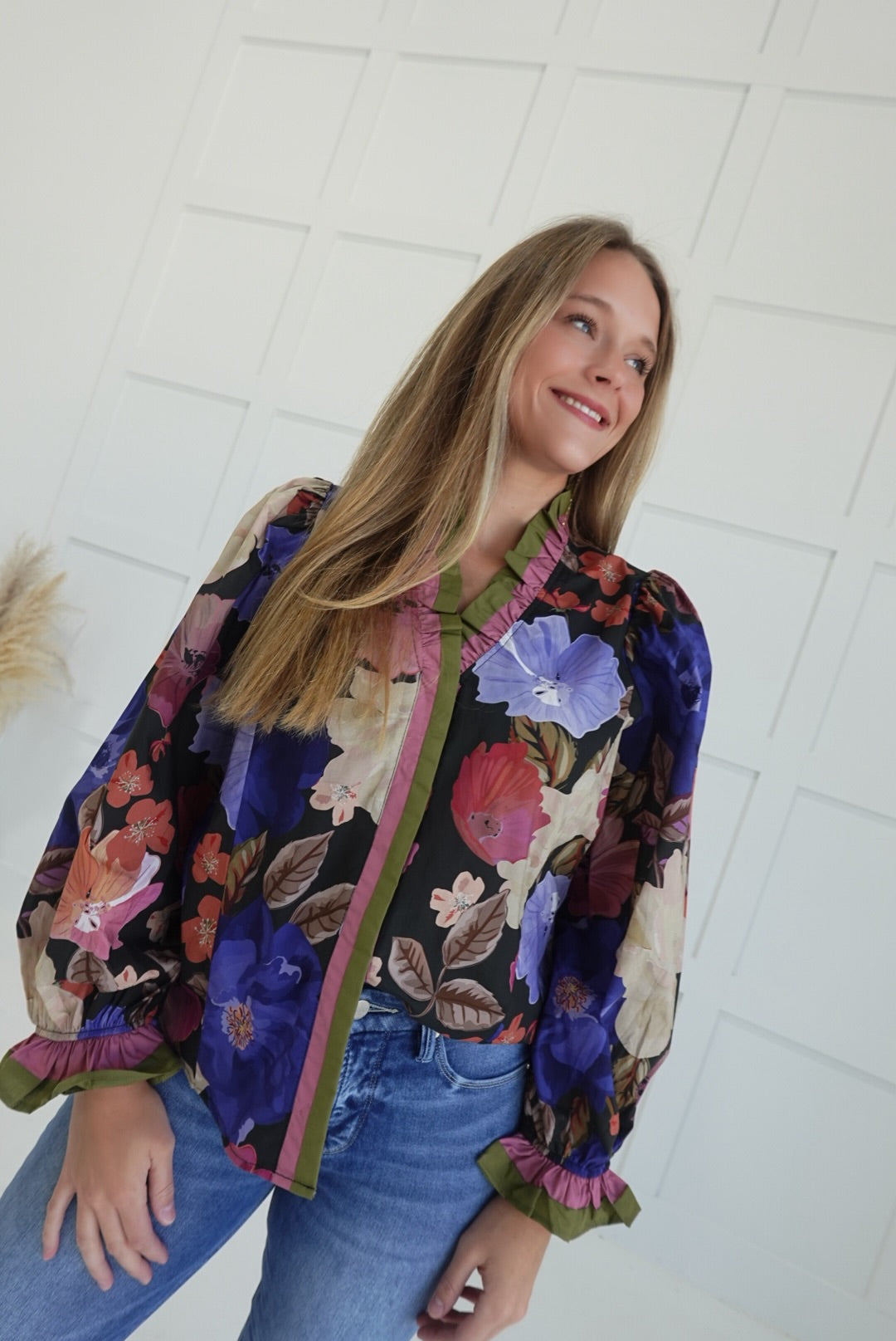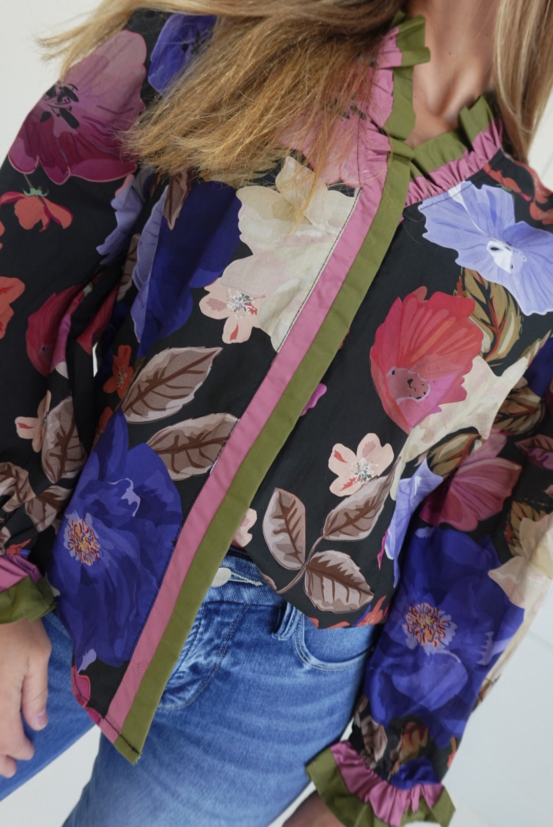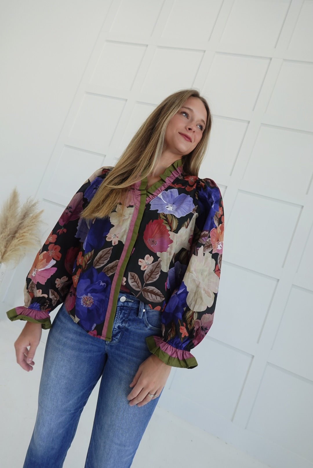 The Aberdeen Top in black offers a graceful floral print paired with a delicate pleated multicolor ruffle trim along the neckline and placket, adding a charming touch to your wardrobe. Crafted from lightweight woven fabric, this long sleeve top is non-sheer and unlined, providing comfortable wear without bulk. Its design combines elegance and ease, perfect for layering or wearing on its own throughout the seasons.