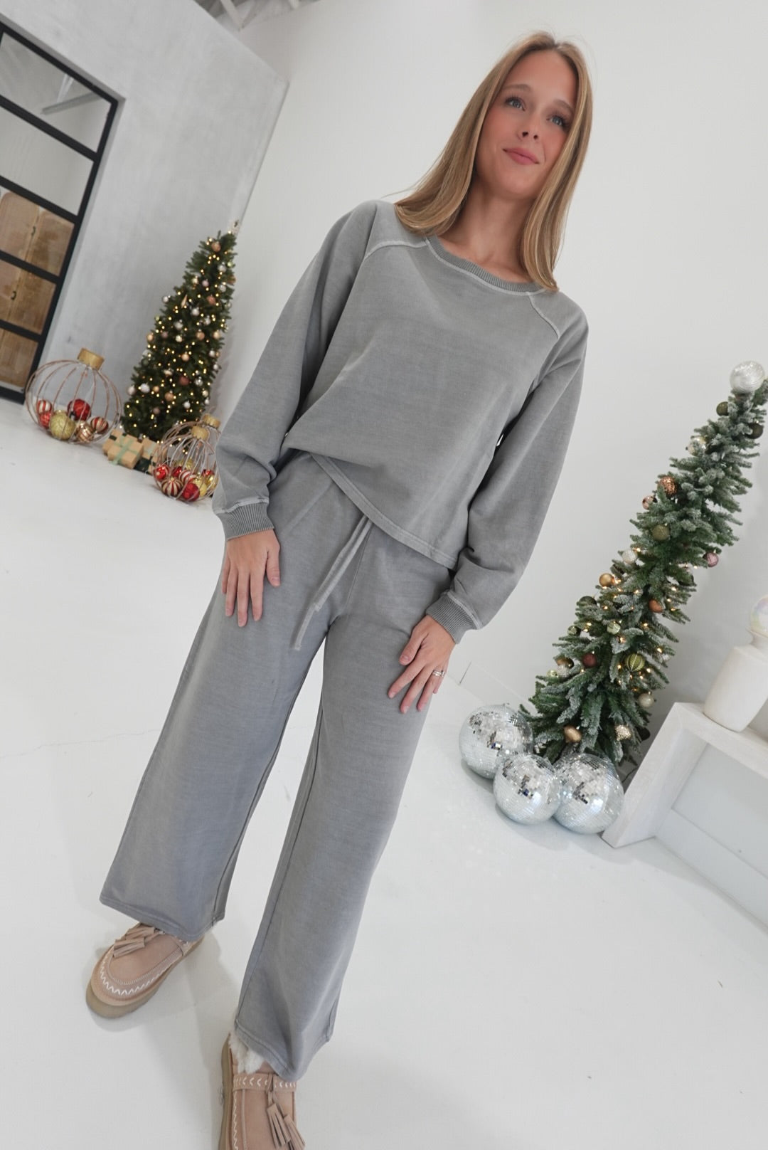 Introducing the Adina Lounge Set - Sleet! This cozy set features a washed french terry round neck pullover and pants, perfect for lounging in style. Experience ultimate comfort and effortless style with this must-have lounge set.