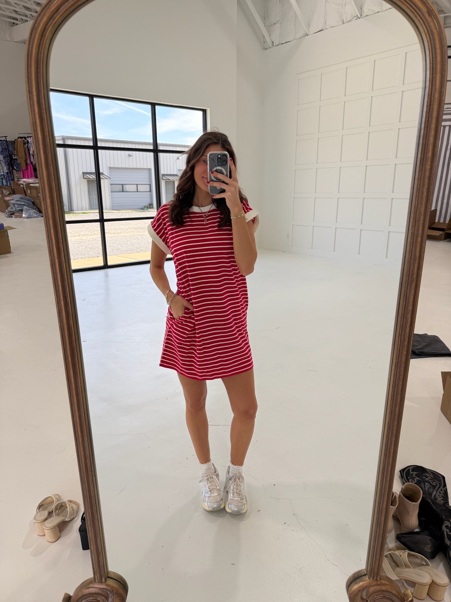 The Agenda Is Comfort Dress cuts through the ordinary with bold contrast trim and striking stripes that refuse to blend in. Designed for those who wear confidence like a second skin, this dress pairs effortless comfort with editorial edge—the kind of piece that works as hard as you do, whether you're commanding a room or commanding your own narrative. Relaxed fit, fearless style.