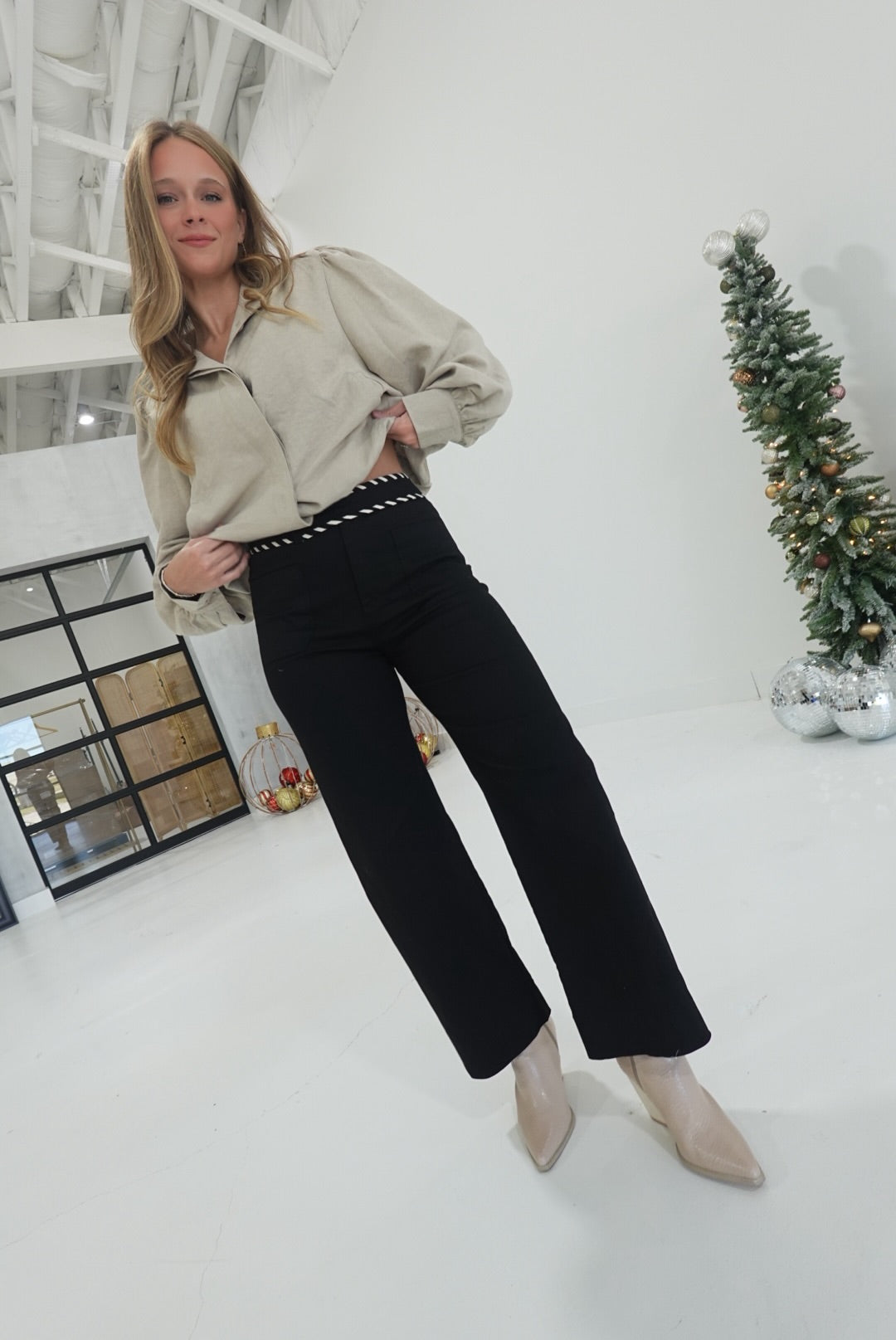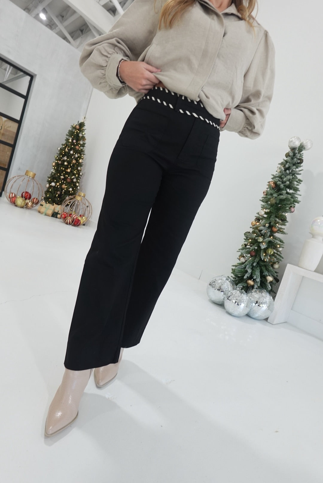Elevate your everyday wardrobe with the Alden Wide Leg Pants in classic black. These sophisticated pants feature a flattering wide leg silhouette that moves beautifully with you, paired with distinctive whipstitch trim detailing that adds a refined touch. Perfect for creating polished looks that transition seamlessly from office to evening, these trousers offer the comfort and versatility you deserve. A timeless piece that works harder in your closet.