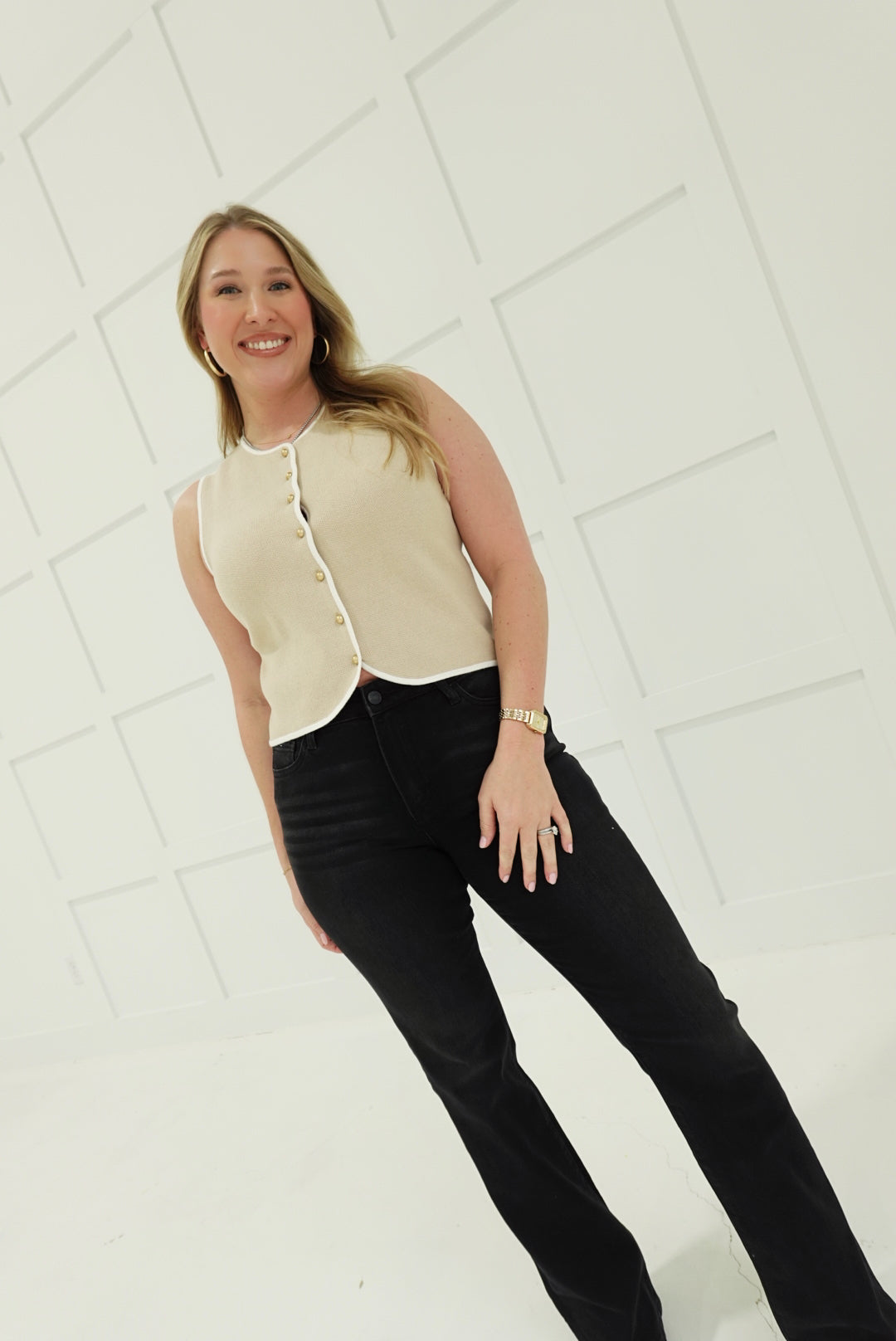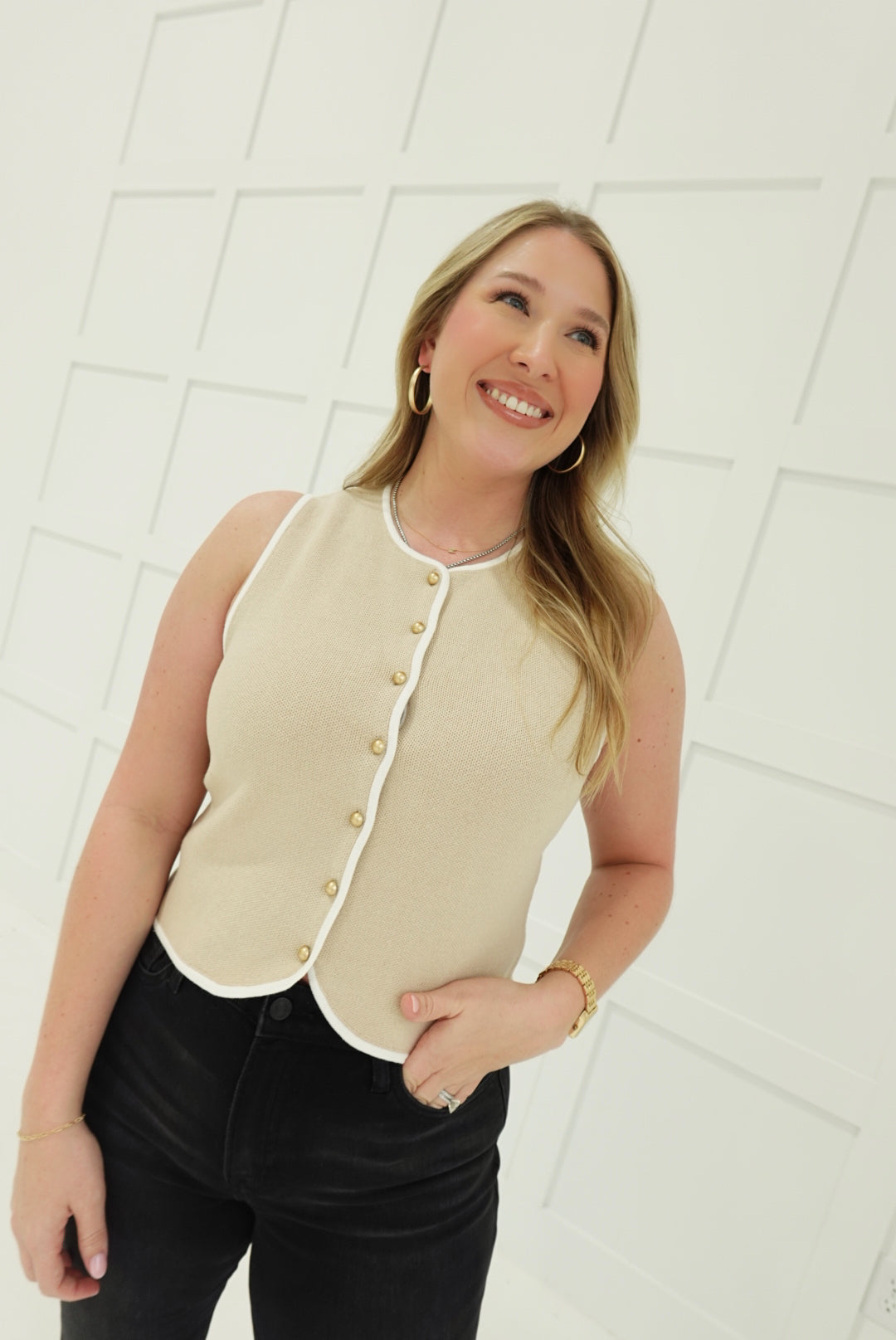Alexia Knit Vest - Beige/White Layer with attitude. This crew neck sleeveless knit vest commands attention with its bold button-down front and striking beige and white colorway. Perfect for stacking over fitted tees, crisp shirts, or bare shoulders—it's the piece that transforms a basic outfit into a statement. Crafted from quality knit fabric, it delivers structure without sacrifice. Versatile enough for casual days, confident enough for nights out.
