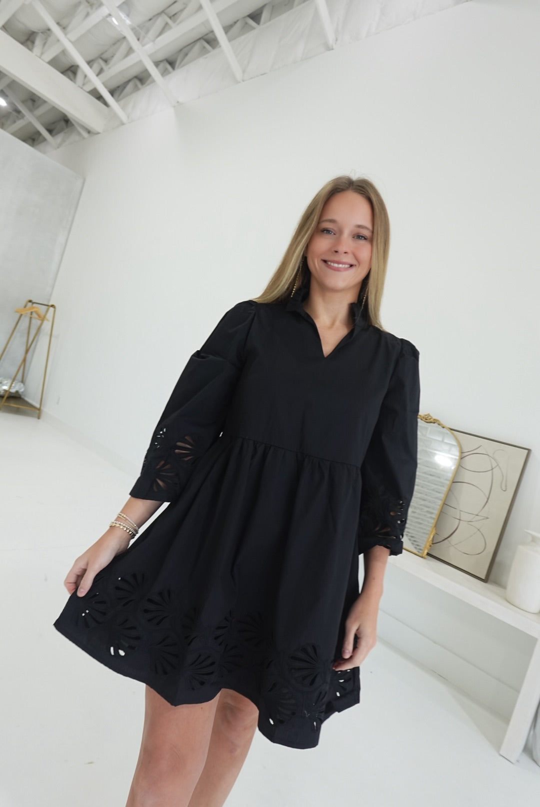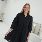 This black mini dress features elegant 3/4 ruffled sleeves and a high neck with delicate eyelet accents, adding a touch of charm to your look. Designed with side pockets, it combines style and practicality for everyday wear. Perfect for occasions when you want to feel both comfortable and confident.
