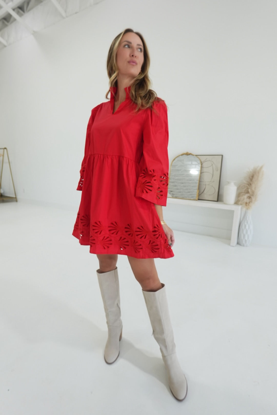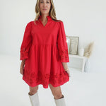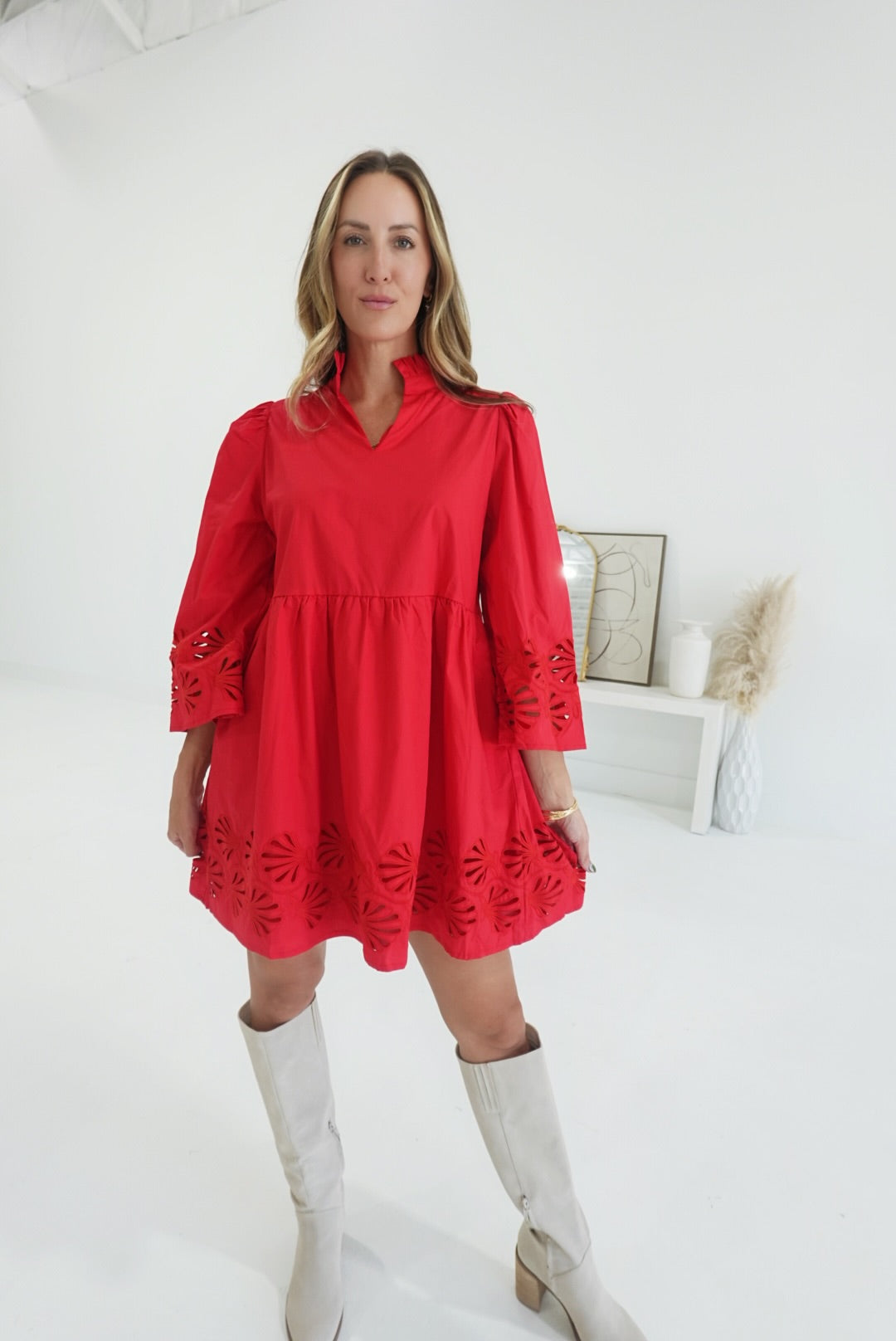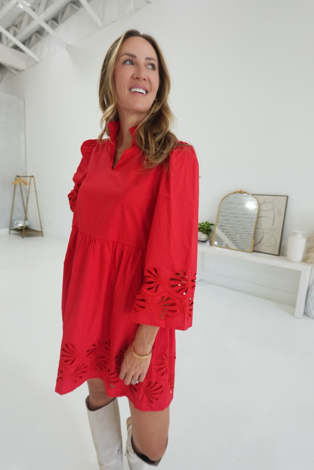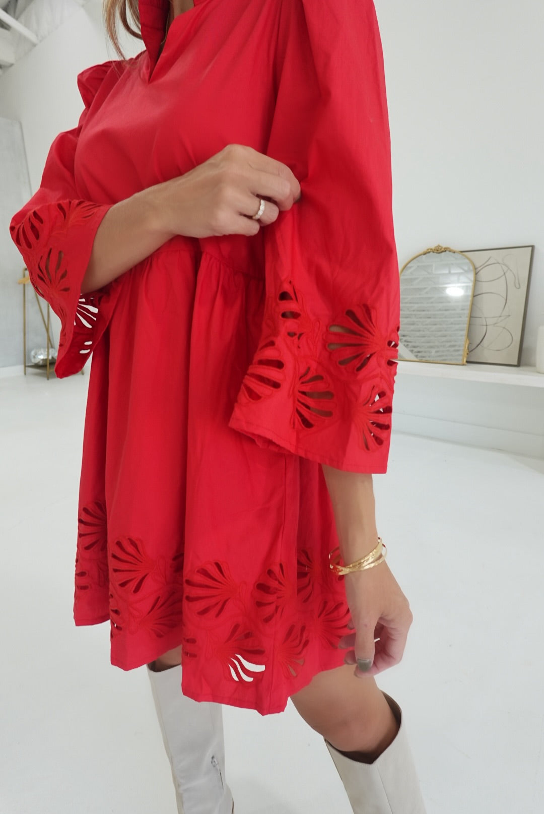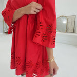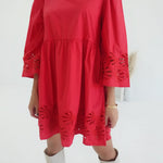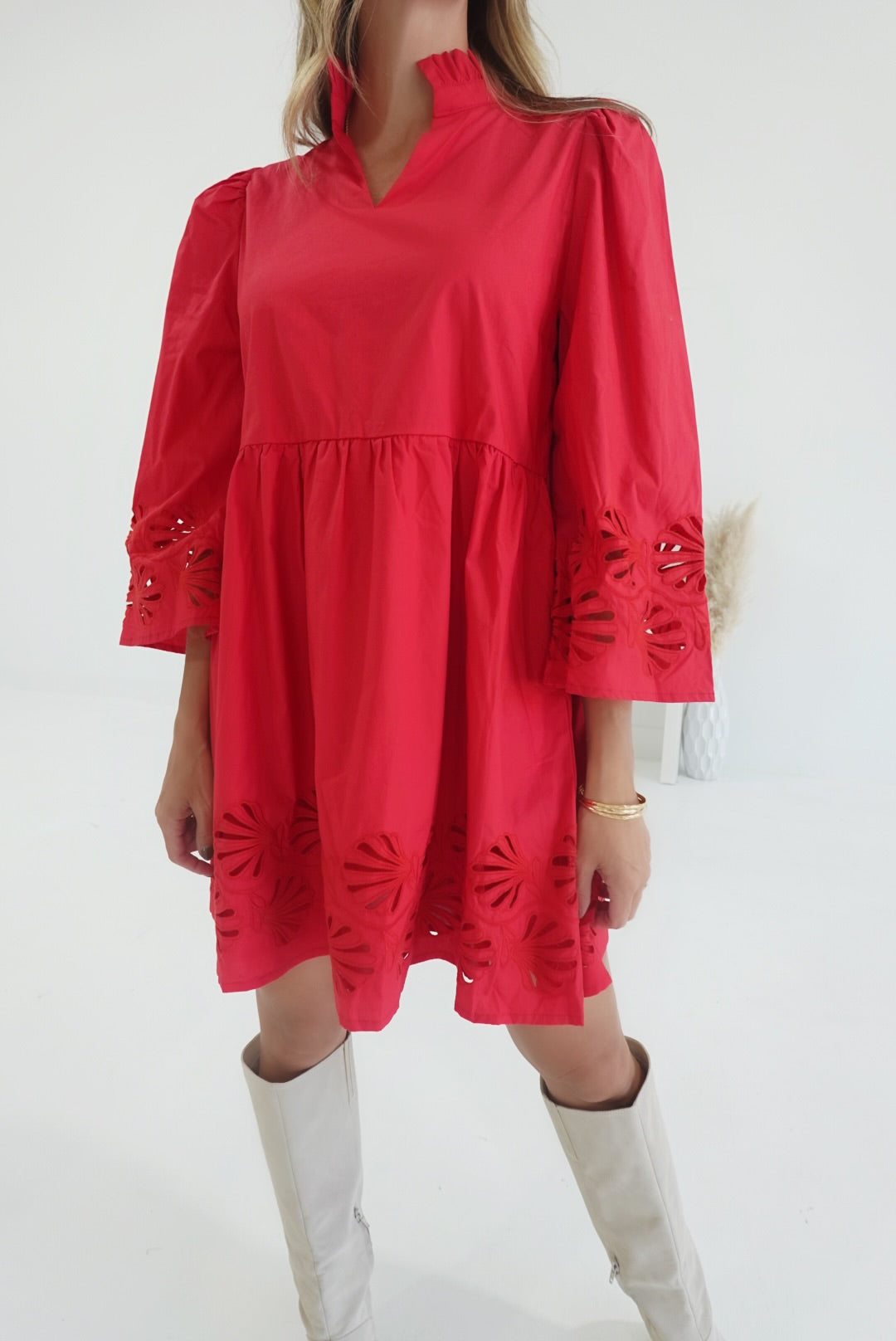 This mini dress features elegant 3/4 ruffled sleeves and a high neck with delicate eyelet accents, adding a touch of charm to your look. Designed with side pockets, it combines style and practicality for everyday wear. Perfect for occasions when you want to feel both comfortable and confident.