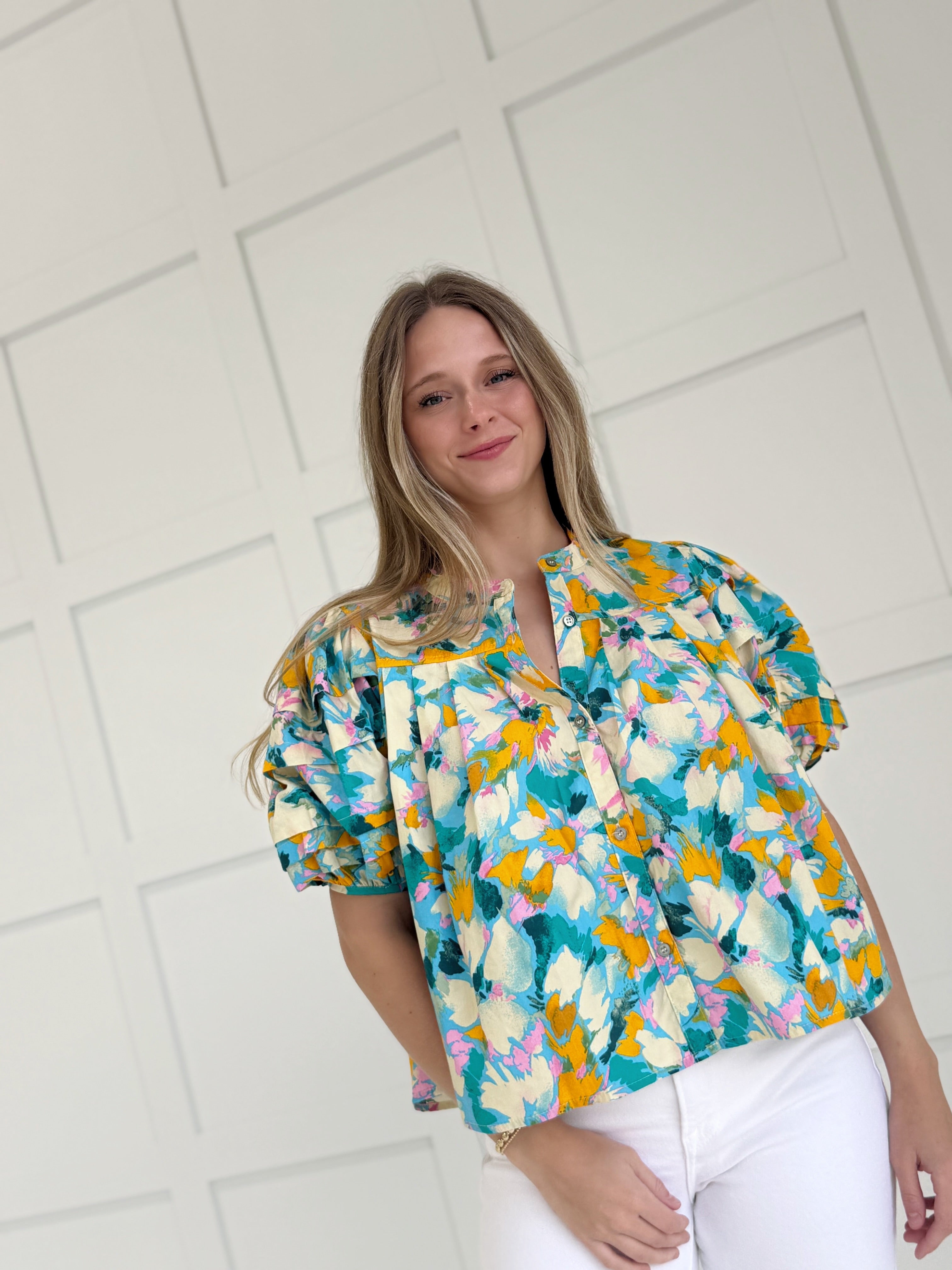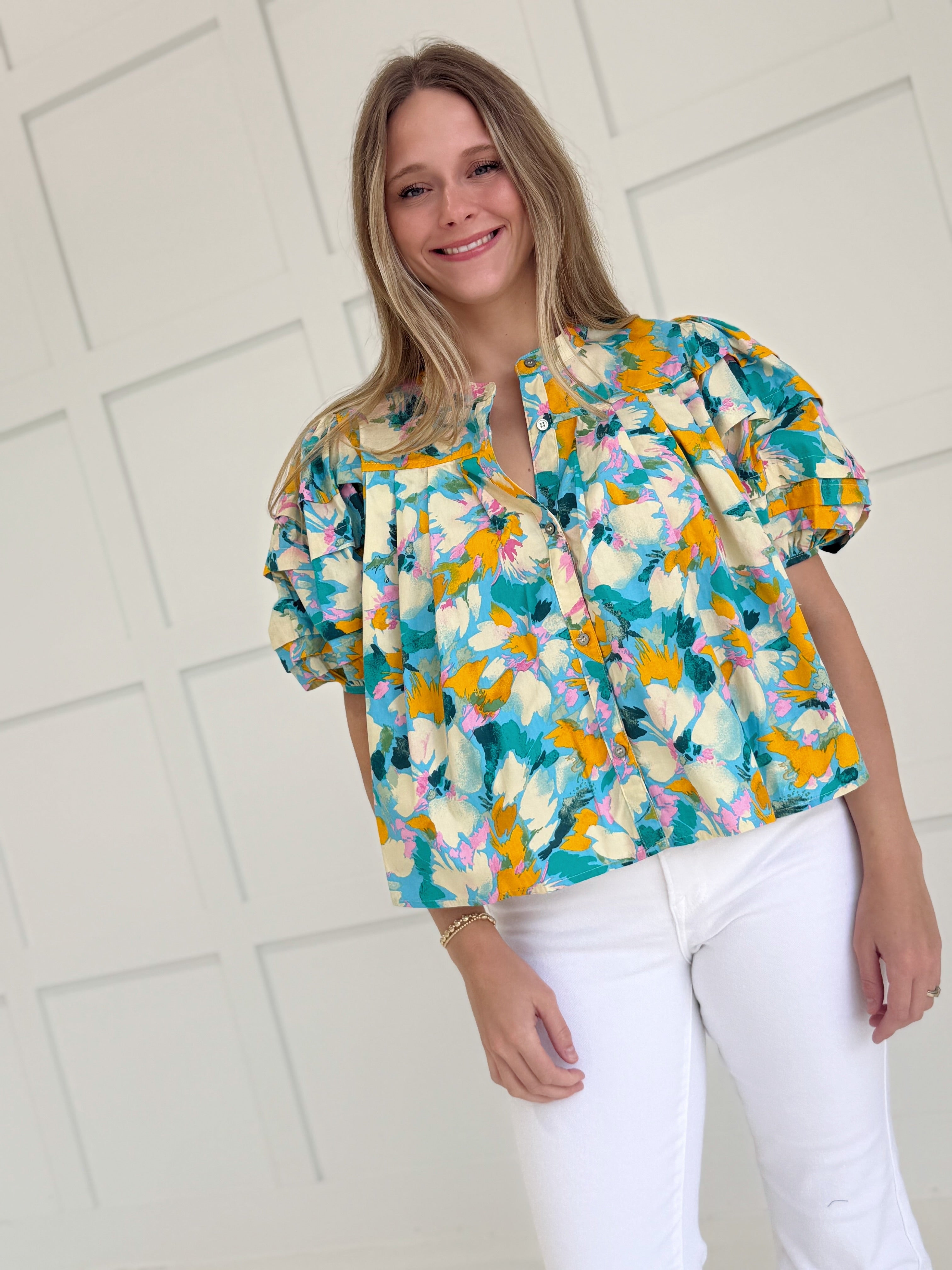 The Amalyn Blouse features a striking floral print on a button-up silhouette, enhanced by fashionable puff sleeves. This expertly designed piece combines vibrant summer colors with a playful aesthetic, making it an essential addition to any warm-weather wardrobe. The bold pattern and cute details create a versatile statement piece that transitions effortlessly from casual to semi-formal occasions.