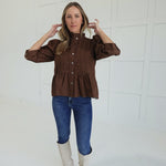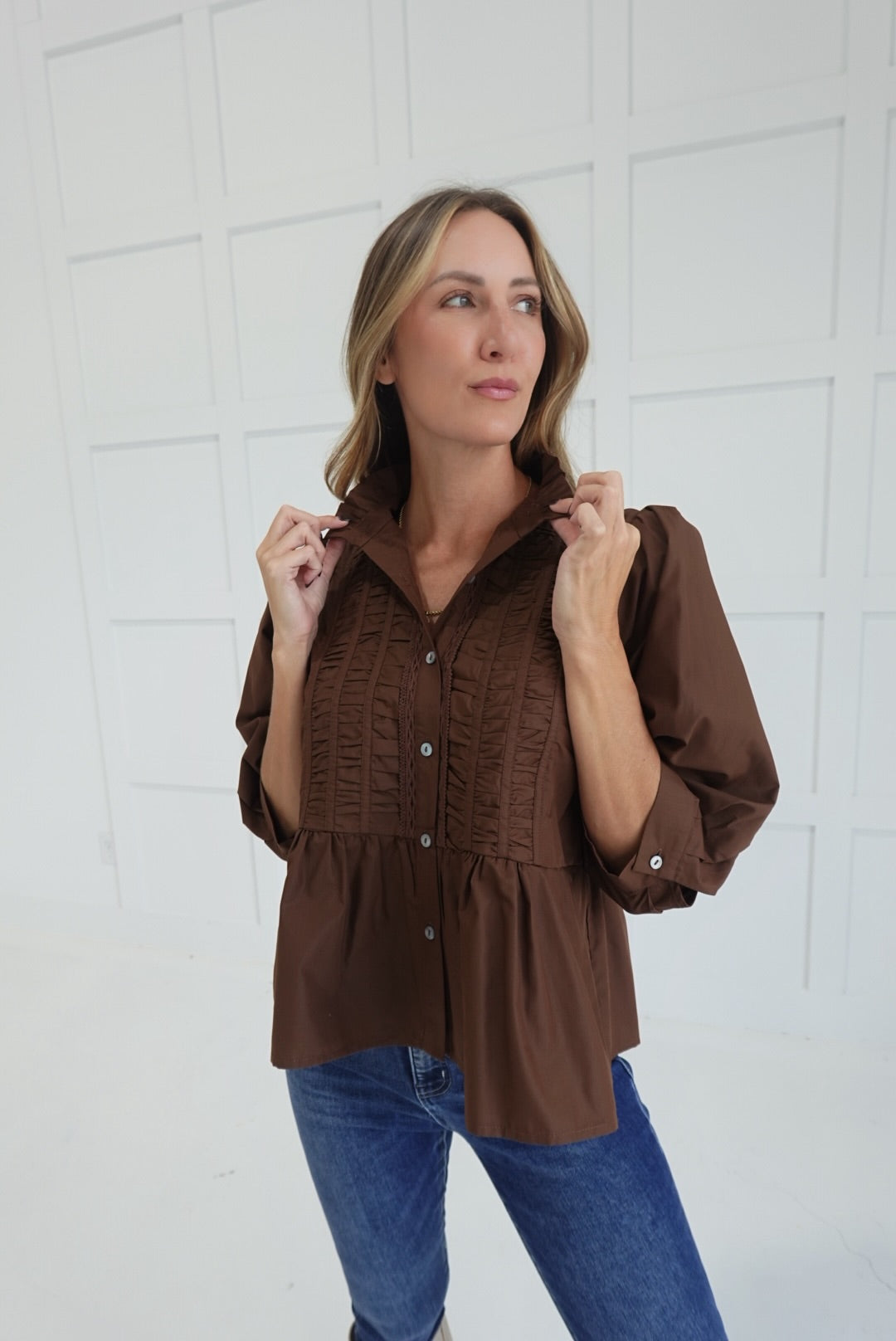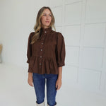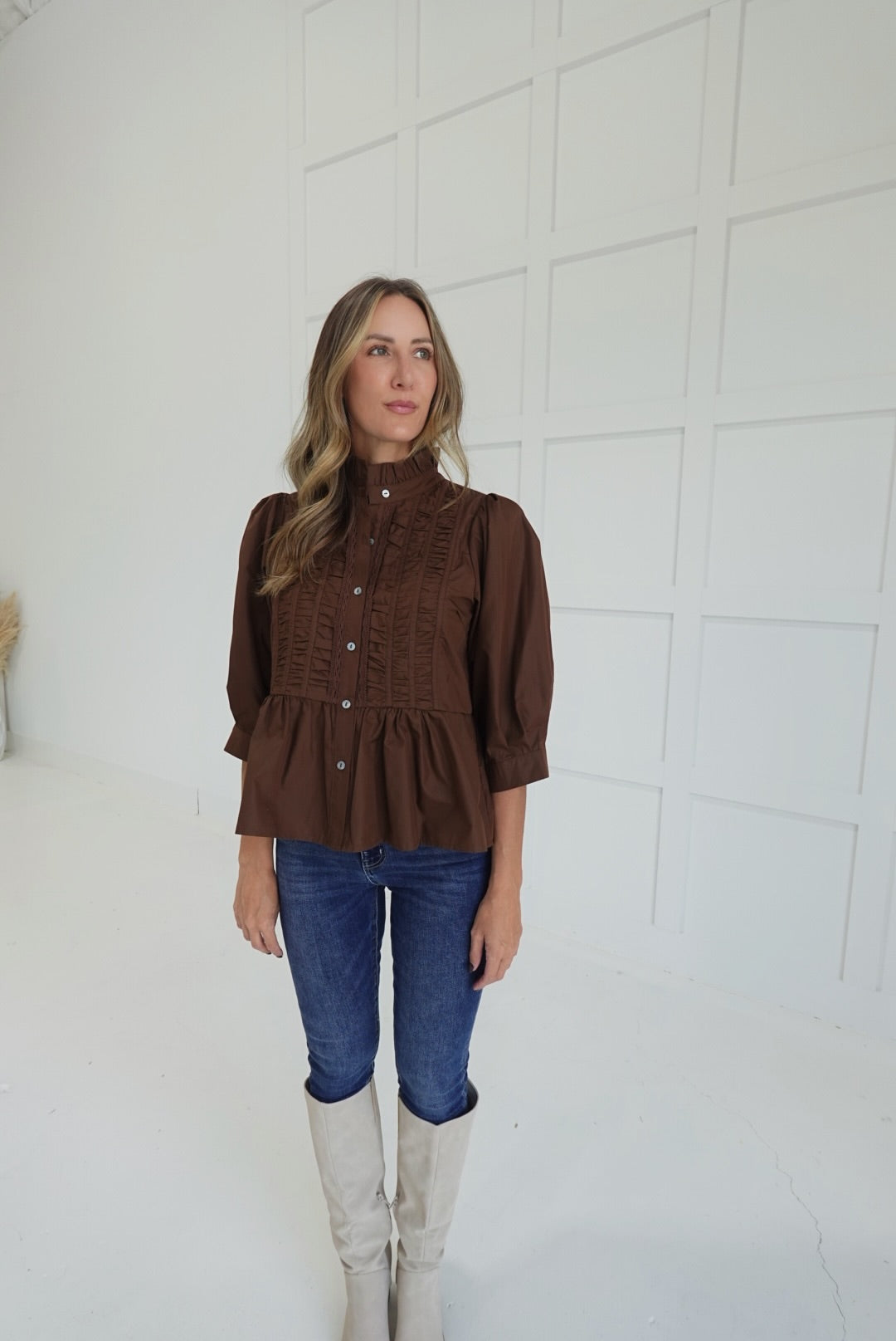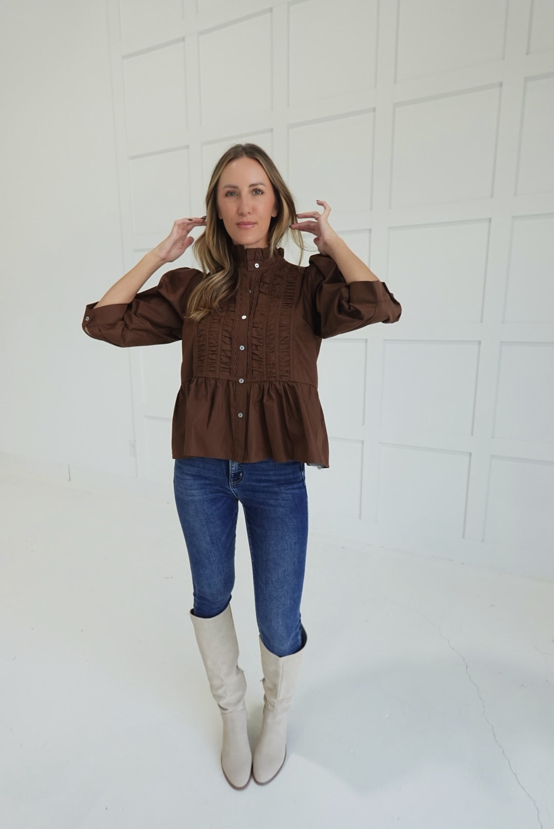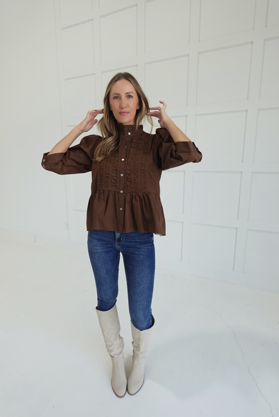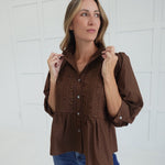 The Amber Top features a flattering button-down design with a peplum silhouette that enhances your shape. Its 3/4 length sleeves and ruching detail add subtle texture, while the ruffled neckline brings a touch of feminine charm. Perfect for both casual and dressier occasions, this top combines comfort with style effortlessly.