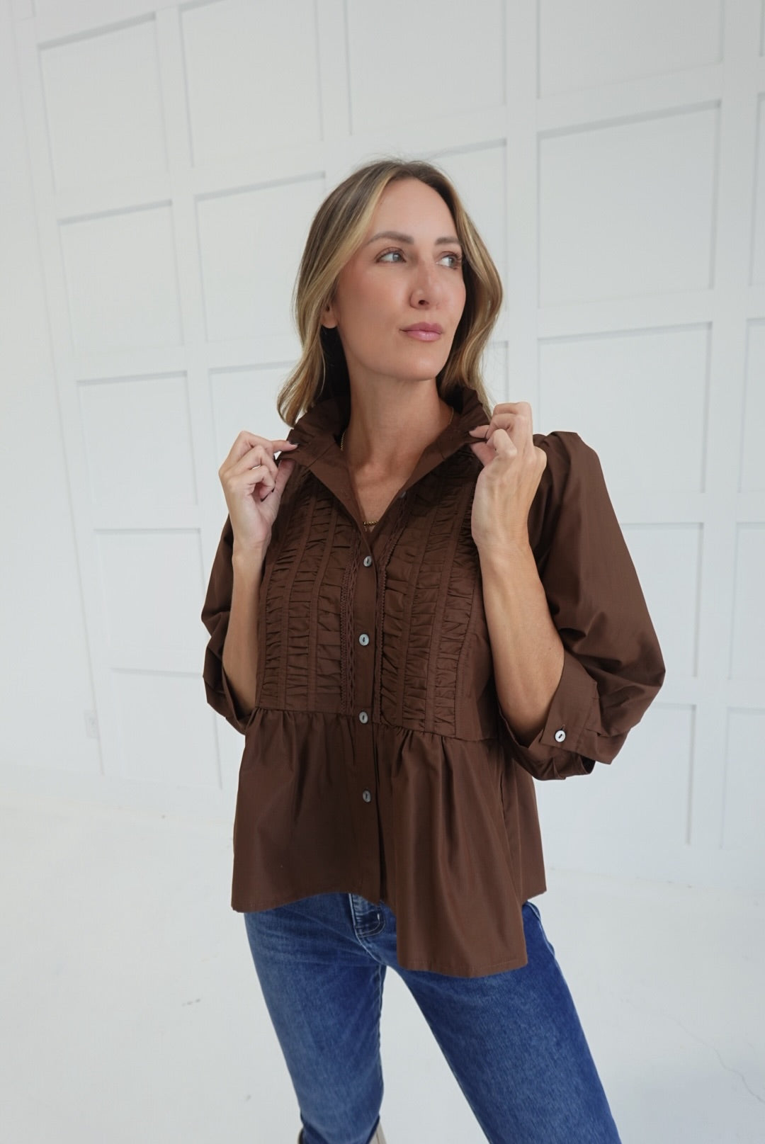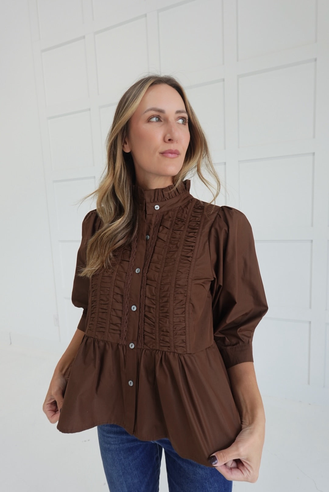 - Peplum Style Button Down Top With 3/4 Sleeves, Ruching Detail, and Ruffled Neckline