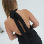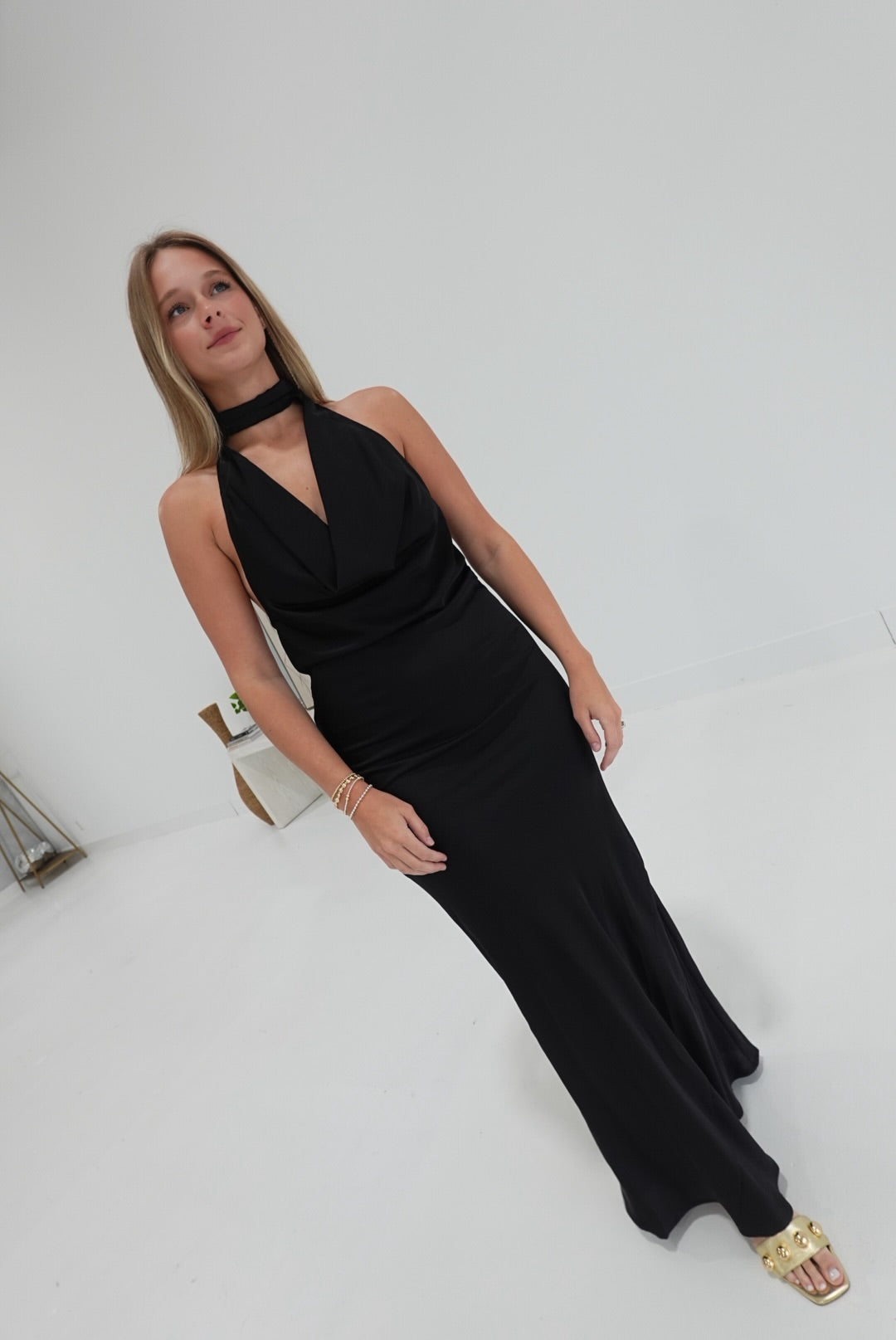 The Anastasia Maxi Dress in black features an elegant scarf-effect neckline that gracefully complements the open back design. Its flowing drape silhouette offers comfort and movement, perfect for making a subtle yet striking statement. This dress combines stylish details with a flattering fit, ensuring you feel confident and effortlessly chic at any occasion.