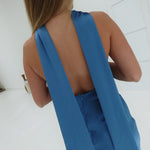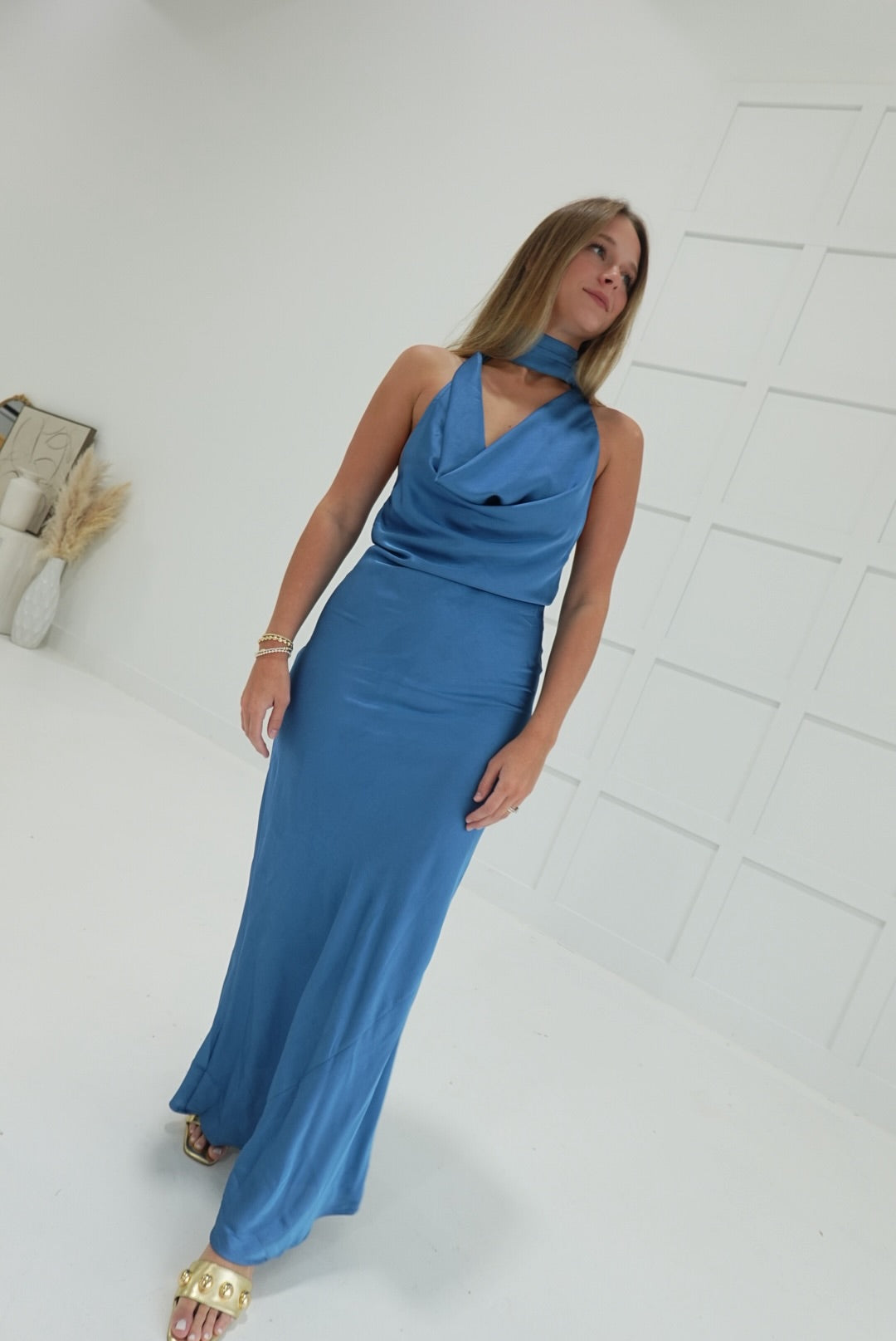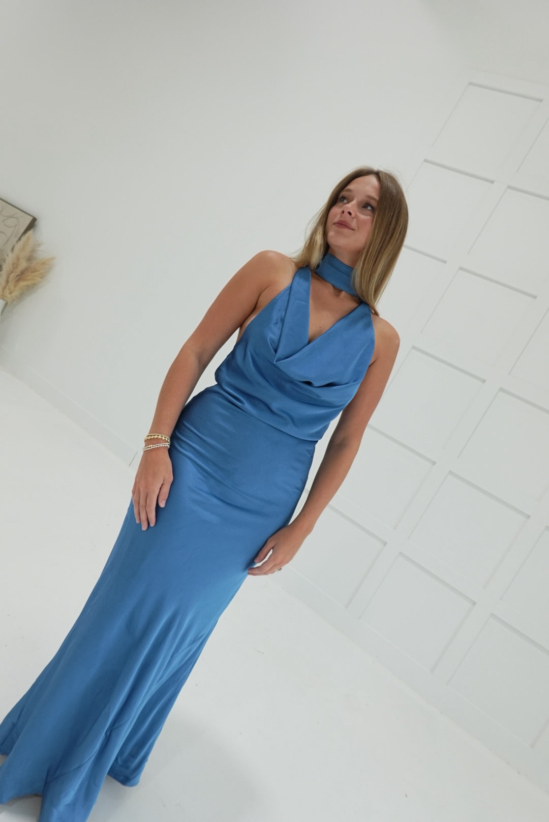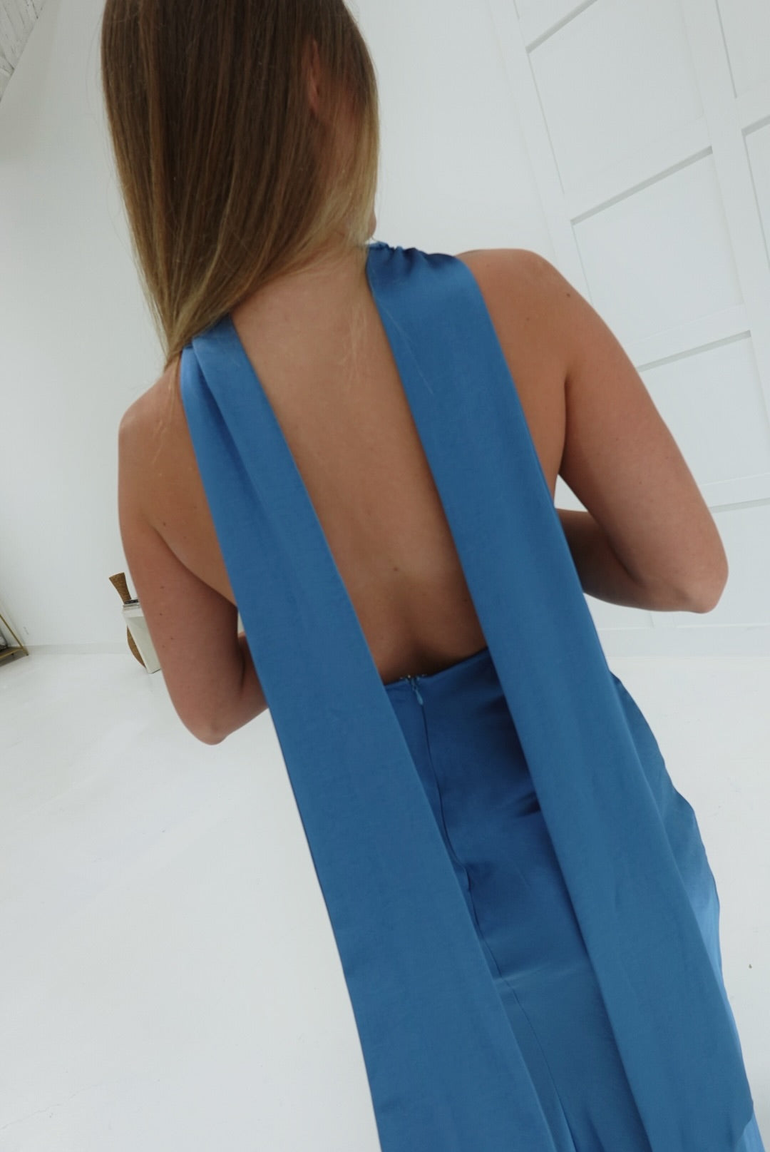 The Anastasia Maxi Dress in blue features an elegant scarf-effect neckline that gracefully complements the open back design. Its flowing drape silhouette offers comfort and movement, perfect for making a subtle yet striking statement. This dress combines stylish details with a flattering fit, ensuring you feel confident and effortlessly chic at any occasion.