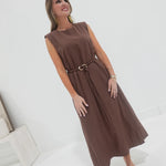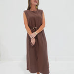 The Anastelle Midi Dress combines elegant design with thoughtful details for a polished look. Crafted from lightweight woven fabric, this solid muscle shoulder dress features a stylish slit hem and is fully lined for comfort. The gold-accent fastener belt adds a touch of sophistication, while the single button keyhole closure at the back neckline ensures a secure fit. Perfect for occasions where you want to feel poised and confident.