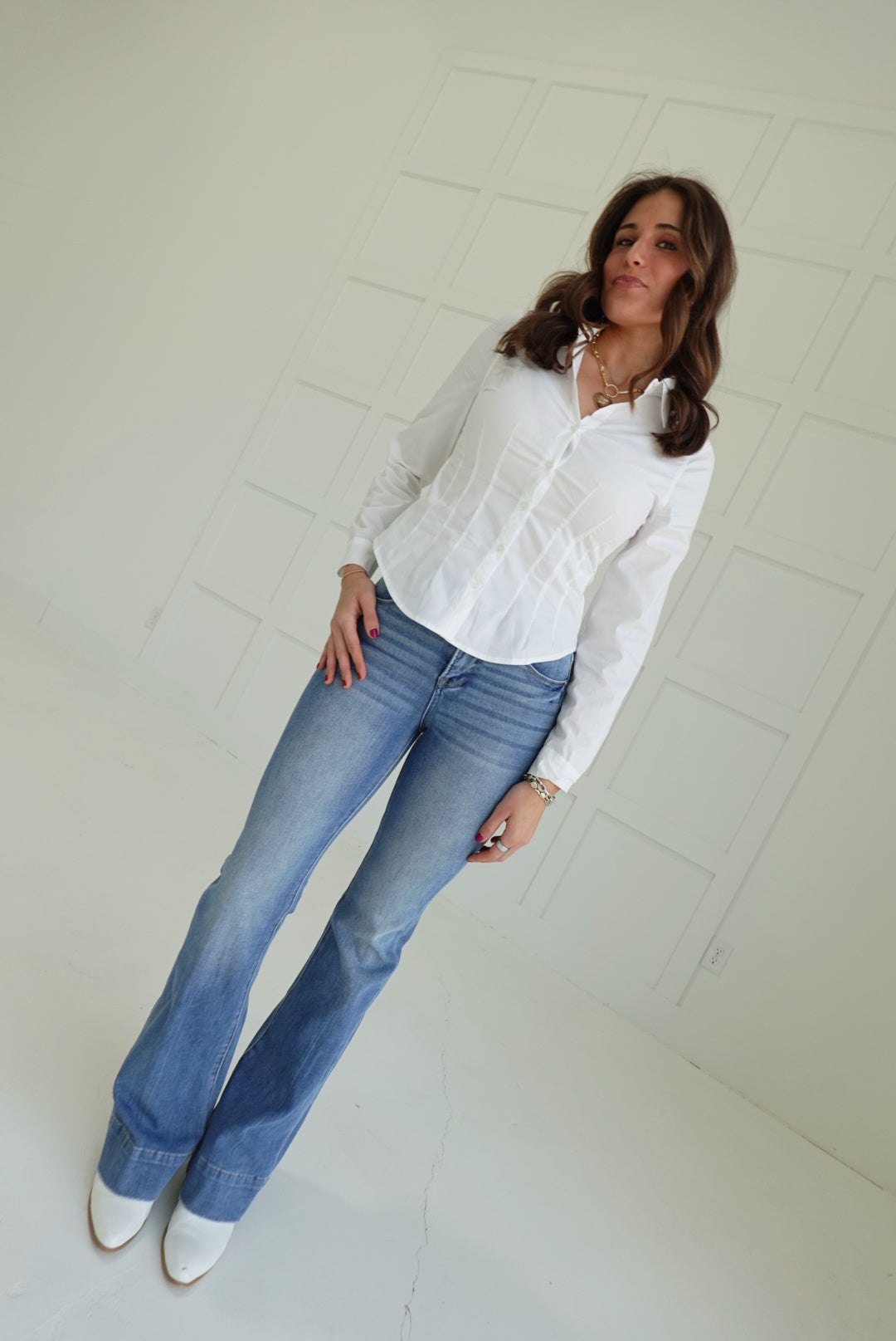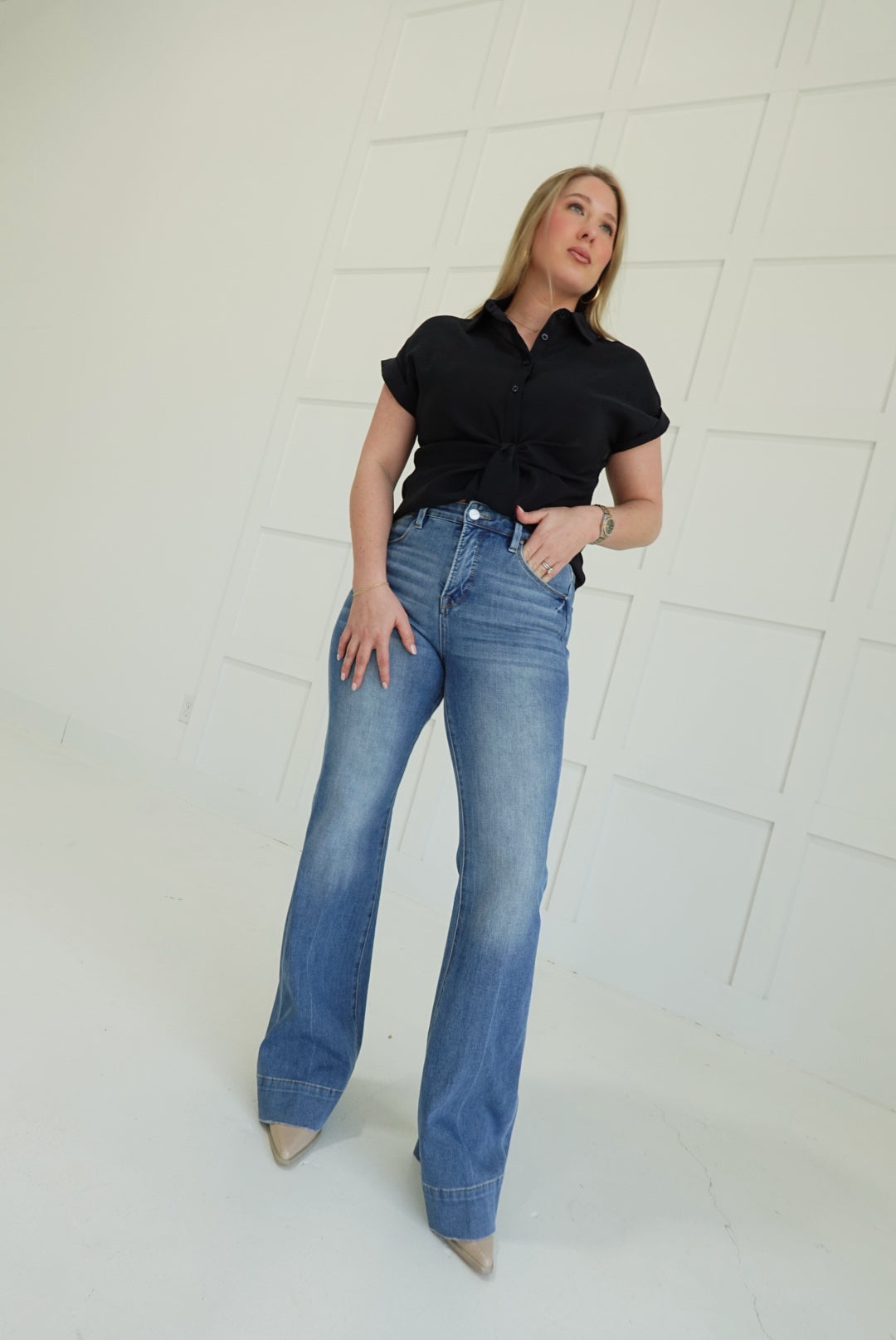 Angela Mid Rise Jeans deliver bold, confident style with a flattering four-way stretch that moves with you. The mid-rise cut balances modern edge with timeless appeal, while the flare silhouette elongates your legs and commands attention. Crafted for all-day comfort, these jeans transition seamlessly from casual to statement-making looks. Perfect for anyone ready to own their style with attitude and ease.