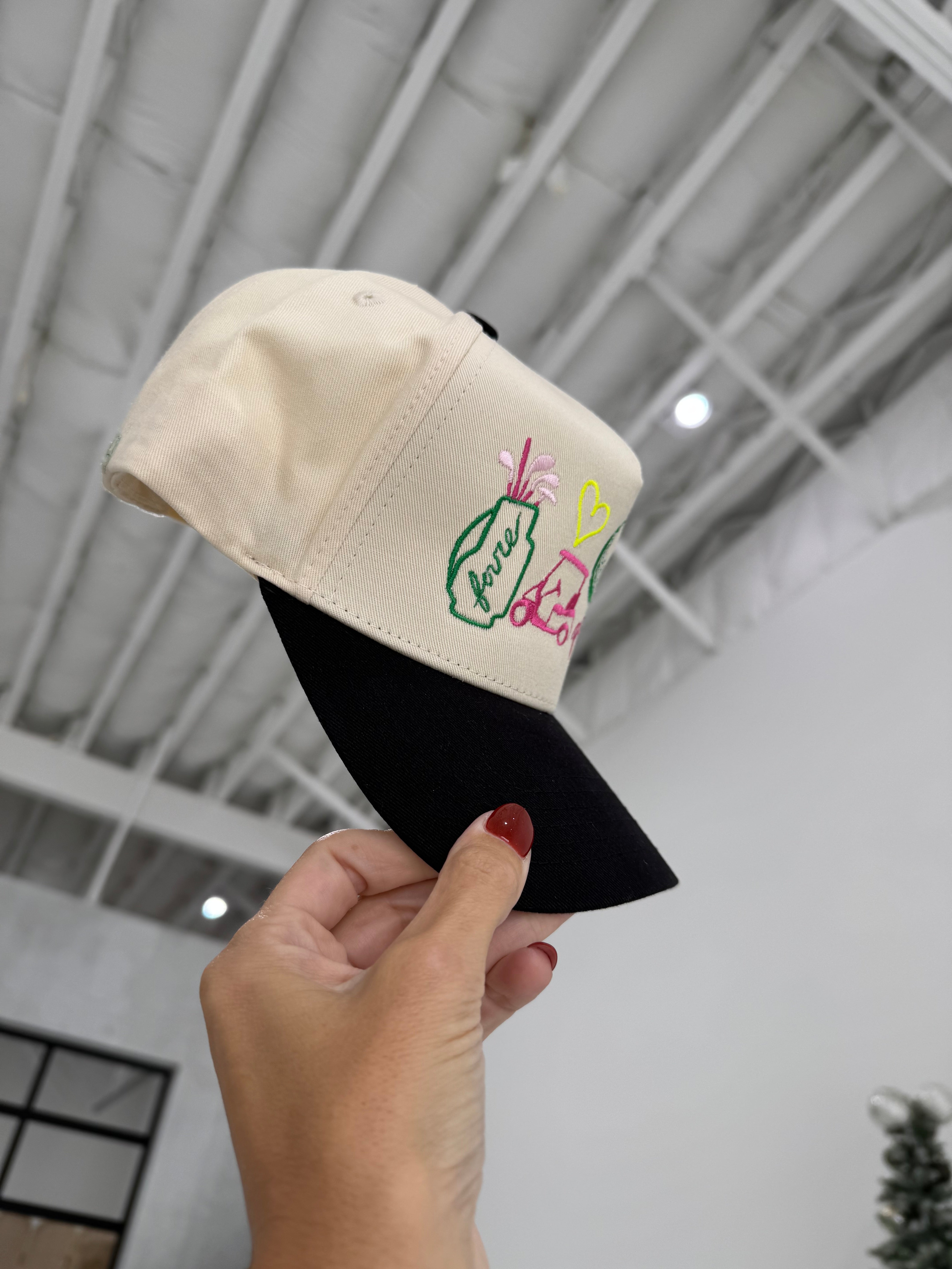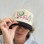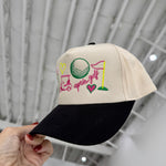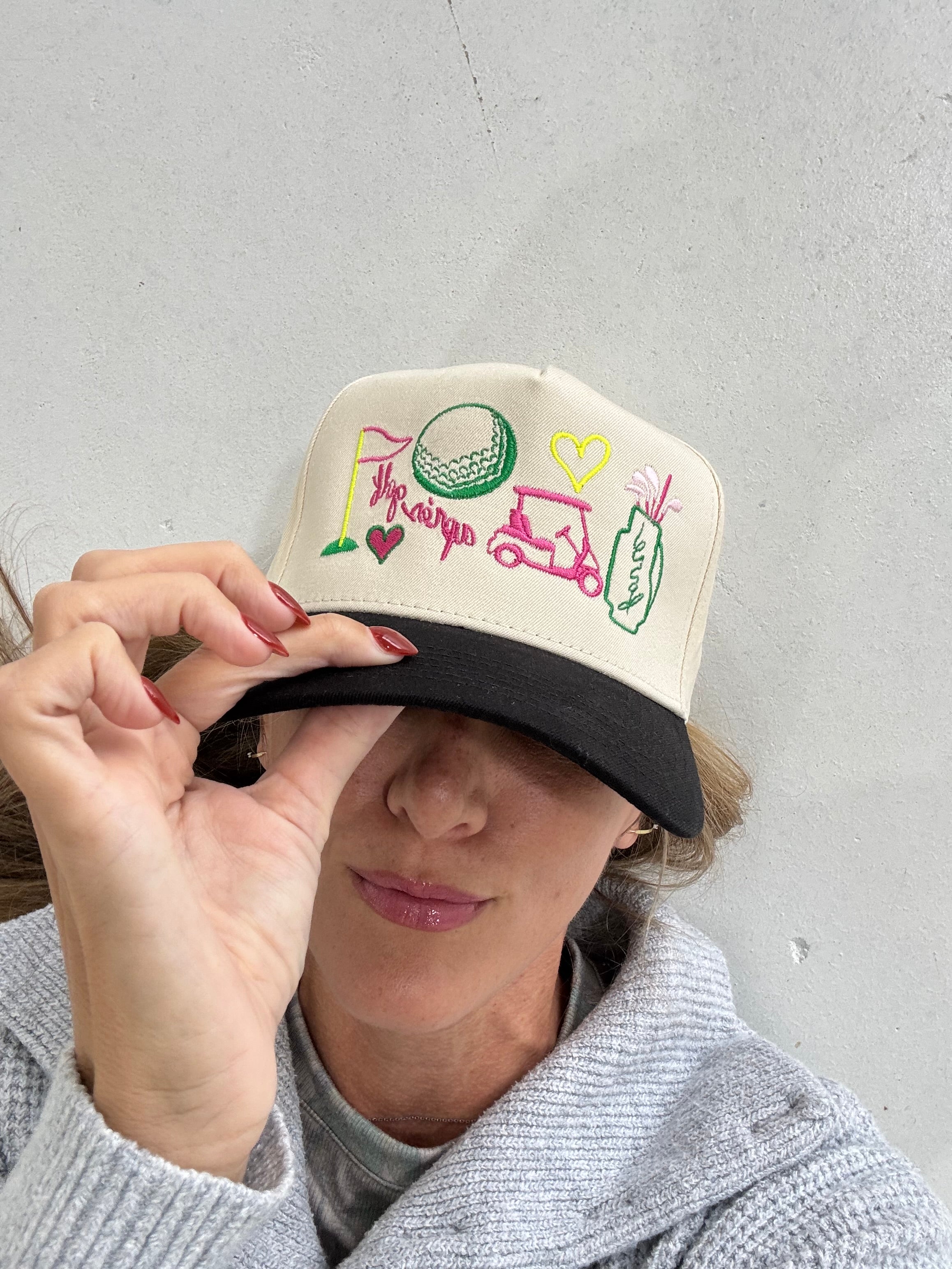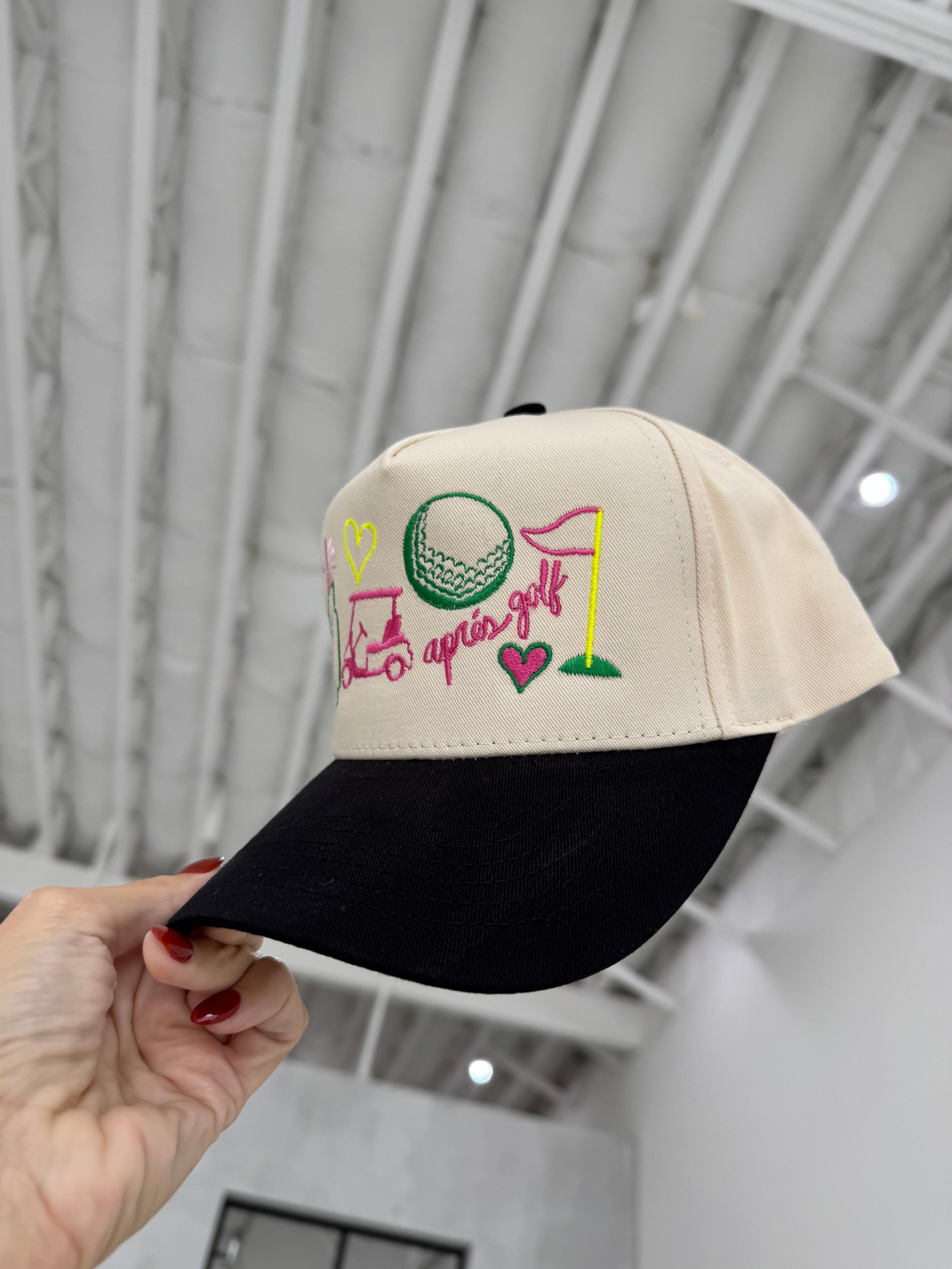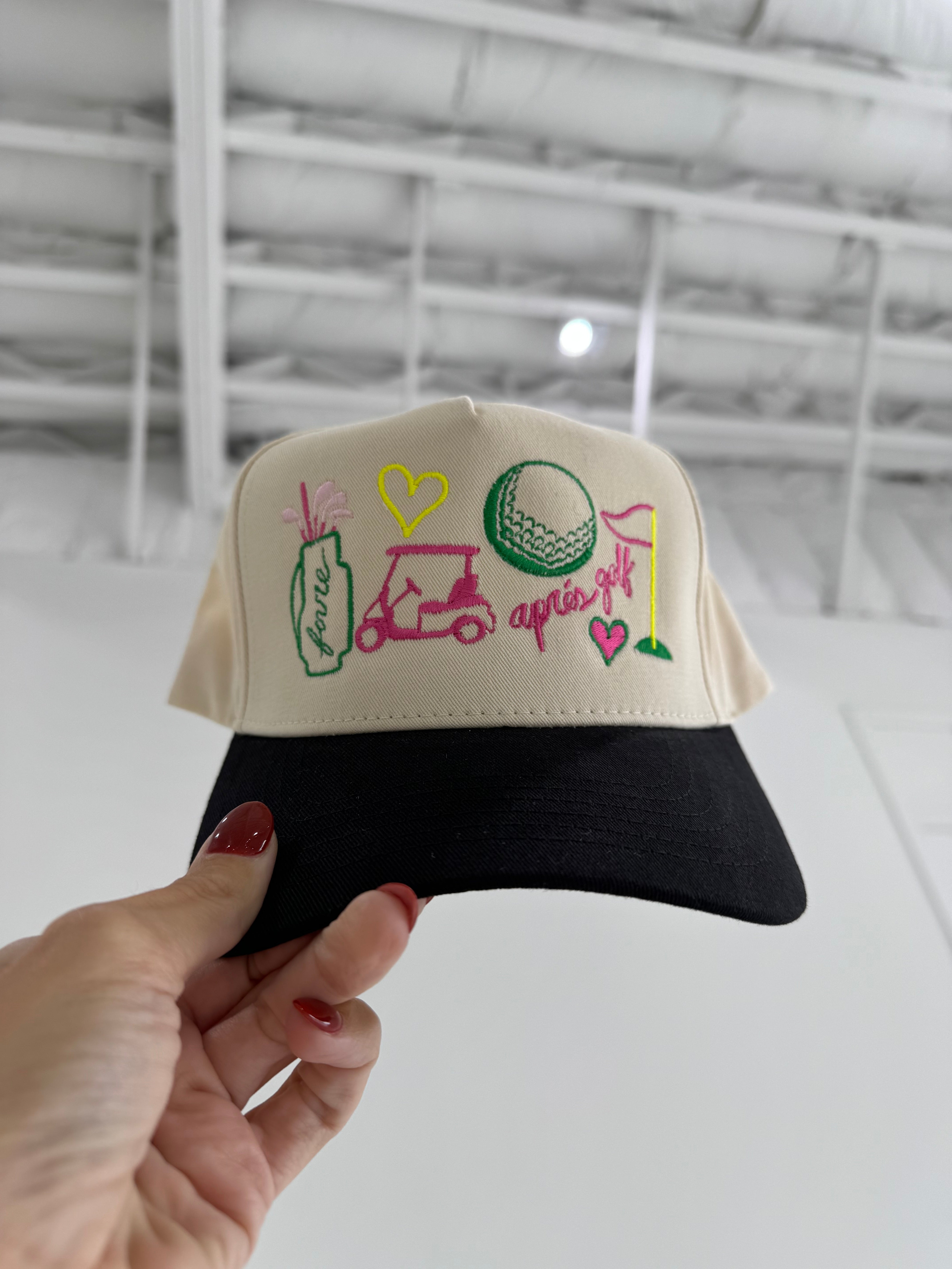 Aprés Golf Hat - Show your dedication to the game with this vibrant golf collage hat. Combining multiple golf-inspired graphics and patterns, it's designed for players who want to wear their passion proudly. The supportive construction ensures a comfortable fit throughout your day, whether you're on the course, at the clubhouse, or anywhere else. Perfect for golfers seeking a unique accessory that stands out from the crowd, this hat brings together style and spirit in one distinctive piece. Embrace your love of golf with every wear.