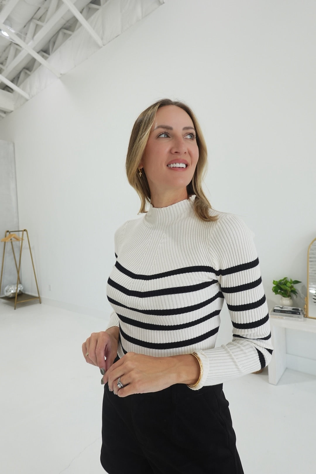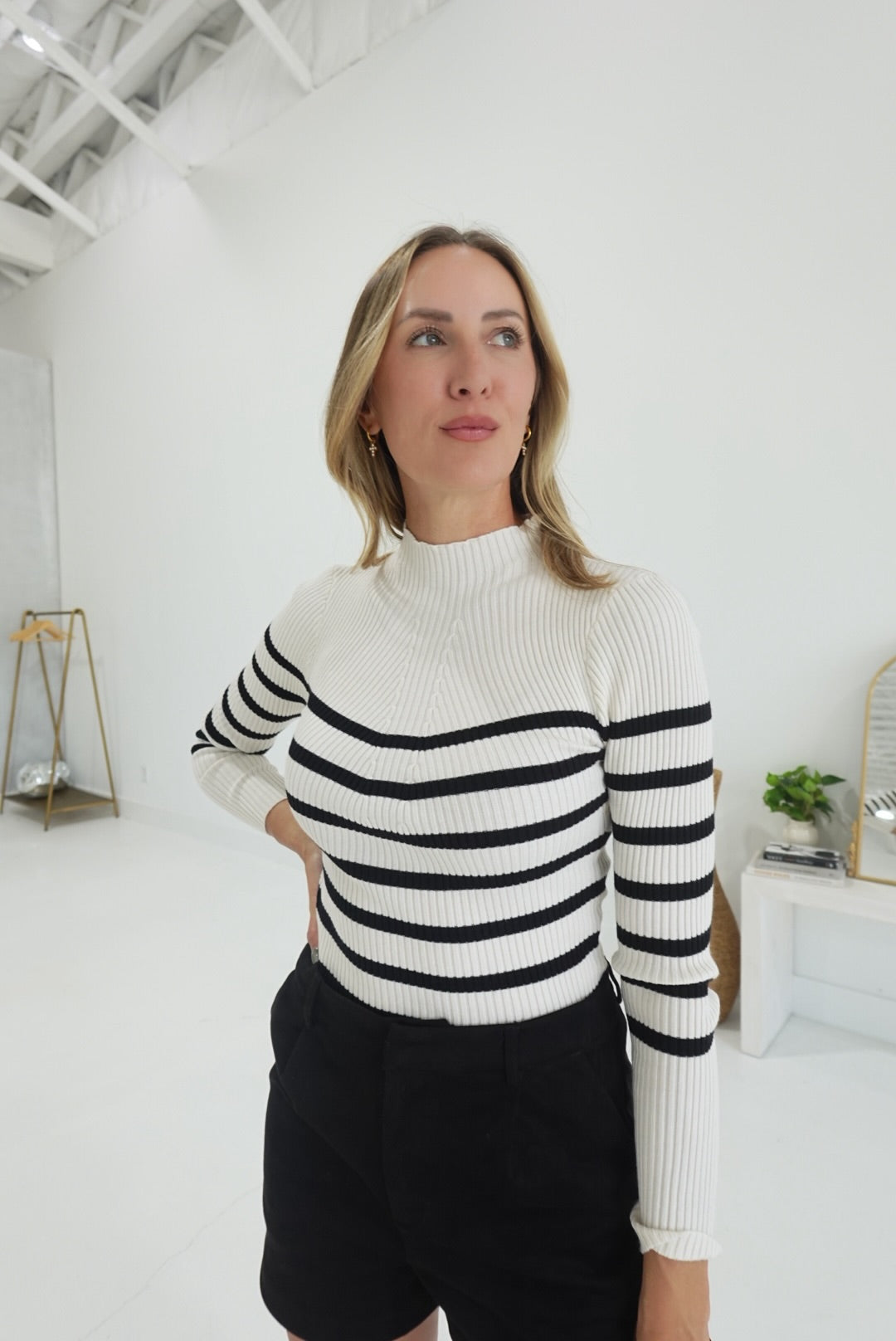 The Around Town Top offers a comfortable fit with its mock neck and long sleeves, perfect for cooler days. Crafted from a soft knit fabric, this pullover features subtle stripes that add a touch of style without overpowering your look. Its versatile design makes it an easy choice for layering or wearing on its own, ensuring you stay cozy and polished throughout your day.