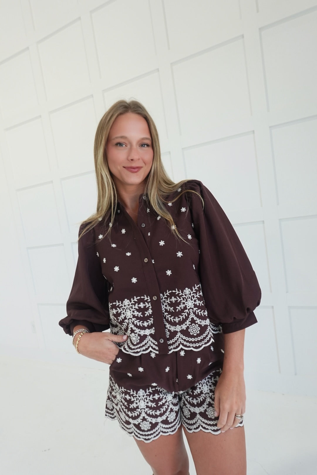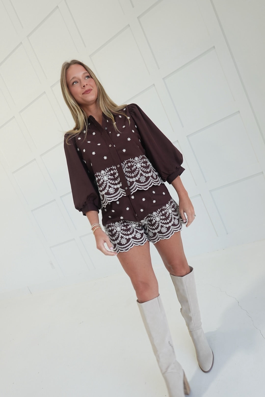 - Embroidered Set - Shorts + Long Sleeve Button Down