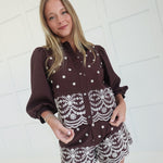 The Aster Embroidered Set features a beautifully detailed button-down top paired with matching shorts, both crafted with delicate embroidery and finished with a charming scallop hem. This cohesive set offers a stylish yet comfortable look, perfect for warm days when you want to feel effortlessly put together. Designed to provide ease and elegance, it’s an ideal choice for casual outings or relaxed gatherings.