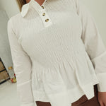 Make a bold statement with the Augustine Peplum Top, where classic tailoring meets contemporary edge. This collared blouse features intricate smocking across the bodice, creating dimensional texture and flattering structure. The dramatic peplum hem adds an unexpected twist that commands attention without apology. Perfect for those ready to elevate their everyday style with a piece that's equal parts sophisticated and daring.