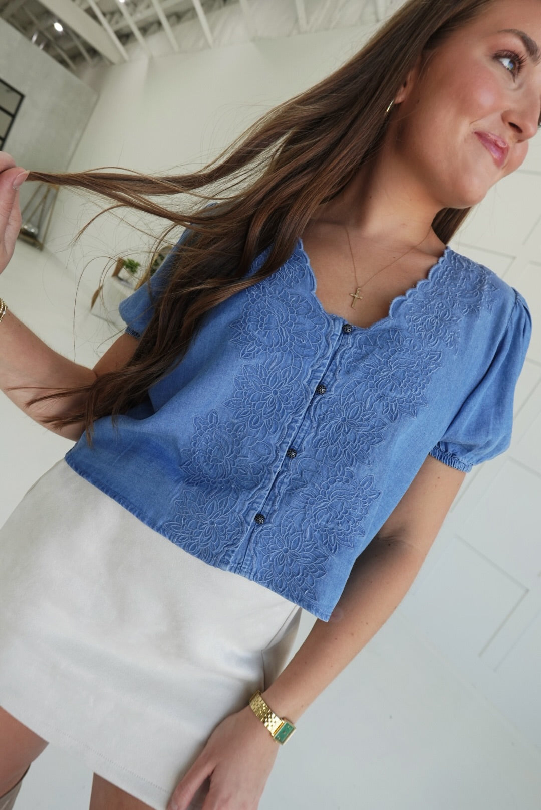 This button-down top features delicate scallop trim and intricate embroidery details, adding a touch of elegance to your everyday wardrobe. Its classic design offers a comfortable fit while elevating your look with subtle, refined accents. Perfect for both casual and dressier occasions, this top combines style and comfort effortlessly.