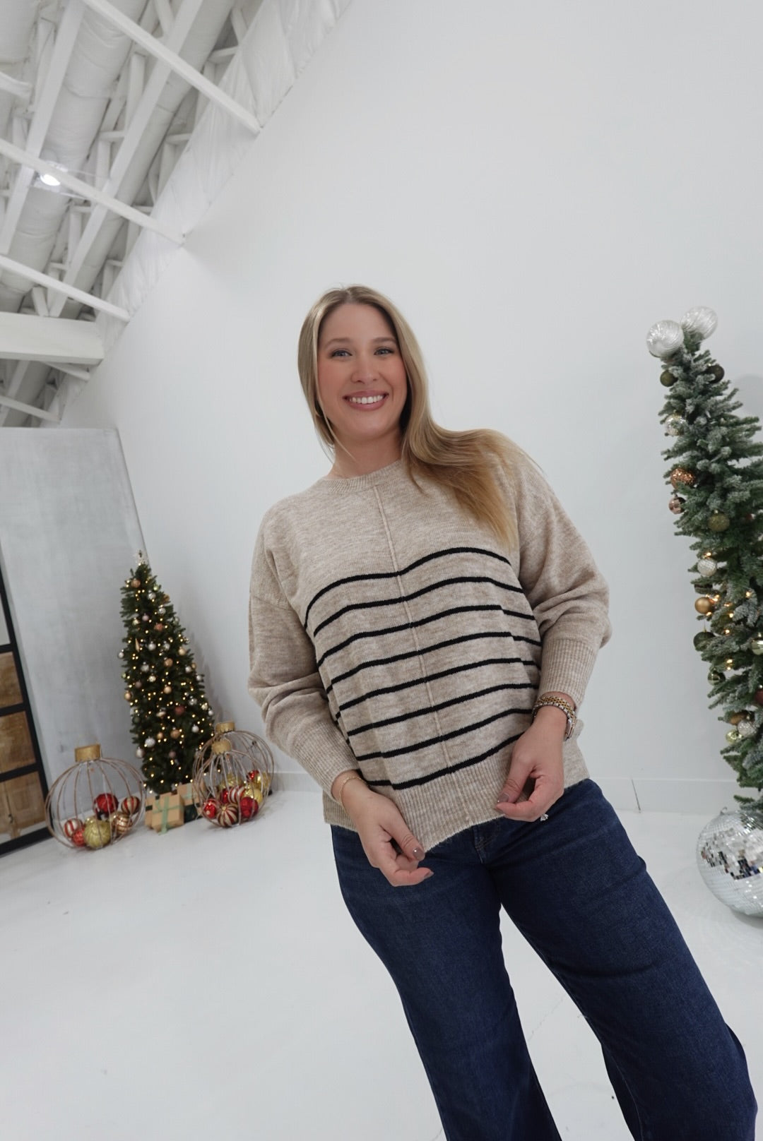 Experience cozy comfort with the Back at It Sweater featuring a unique stripe front seam detail that adds subtle style to your everyday look. The long sleeves provide warmth, making it perfect for layering on cooler days. This sweater combines a relaxed fit with thoughtful design to keep you comfortable and confident throughout your day.