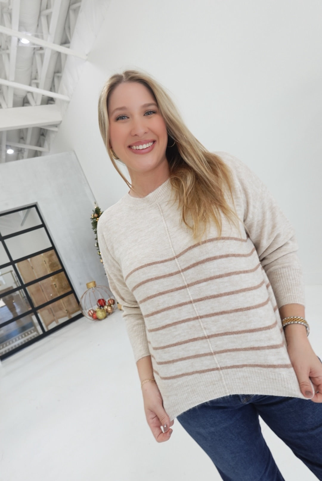 Experience cozy comfort with the Back at It Sweater featuring a unique stripe front seam detail that adds subtle style to your everyday look. The long sleeves provide warmth, making it perfect for layering on cooler days. This sweater combines a relaxed fit with thoughtful design to keep you comfortable and confident throughout your day.
