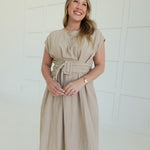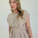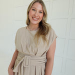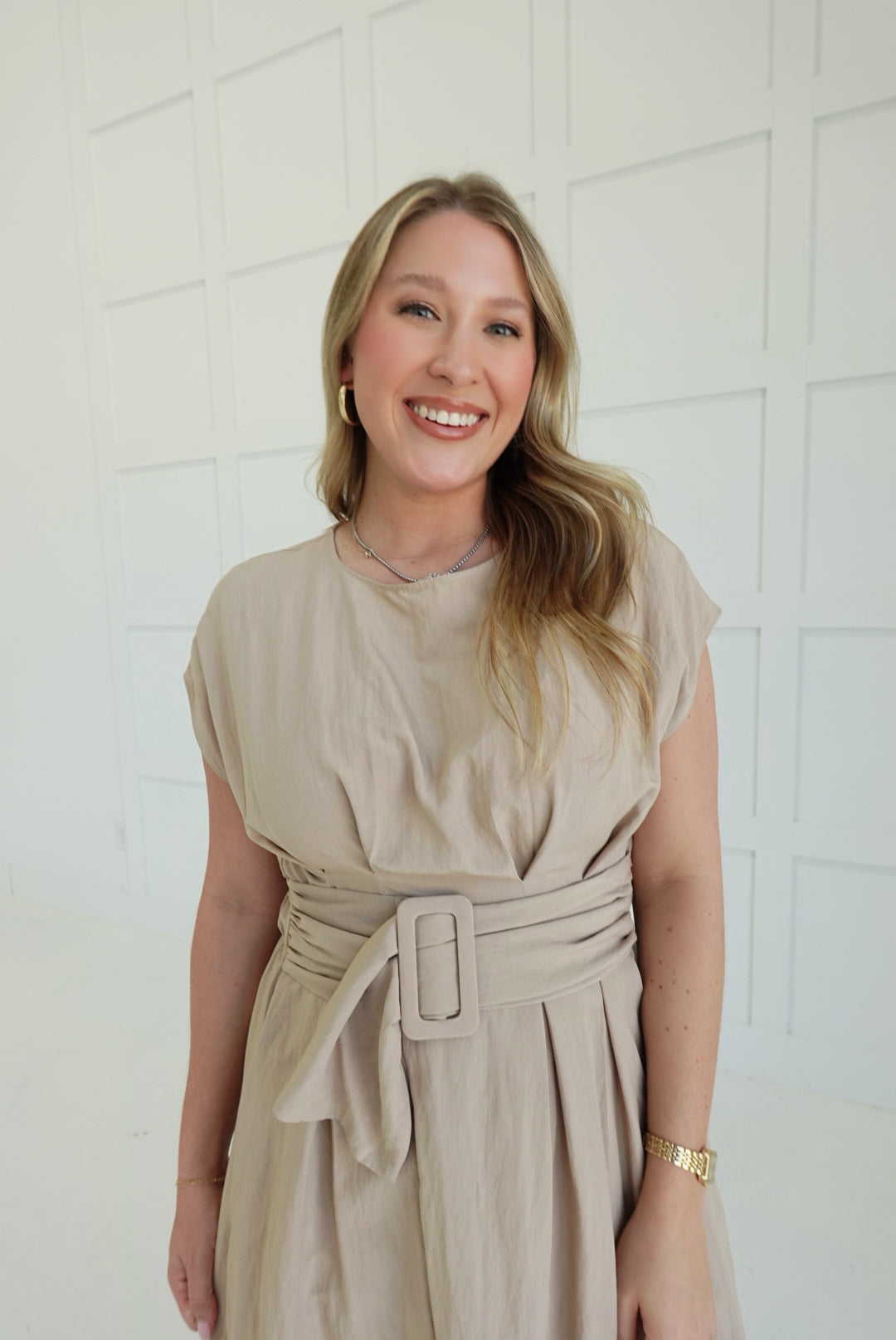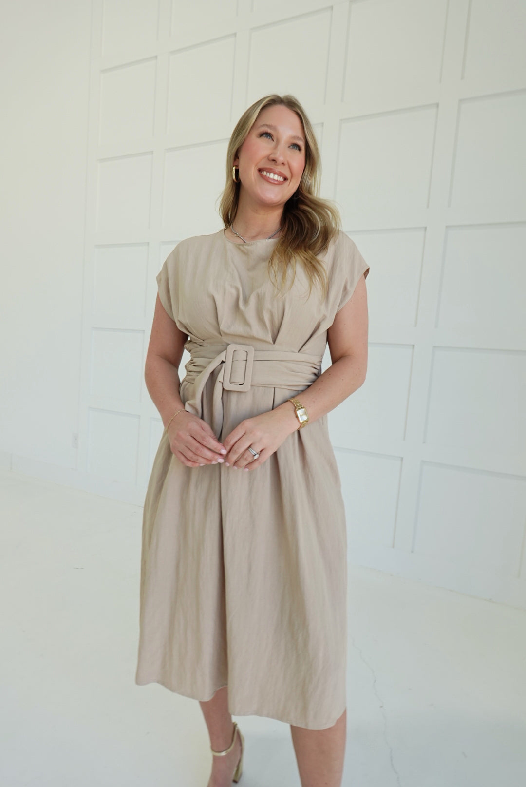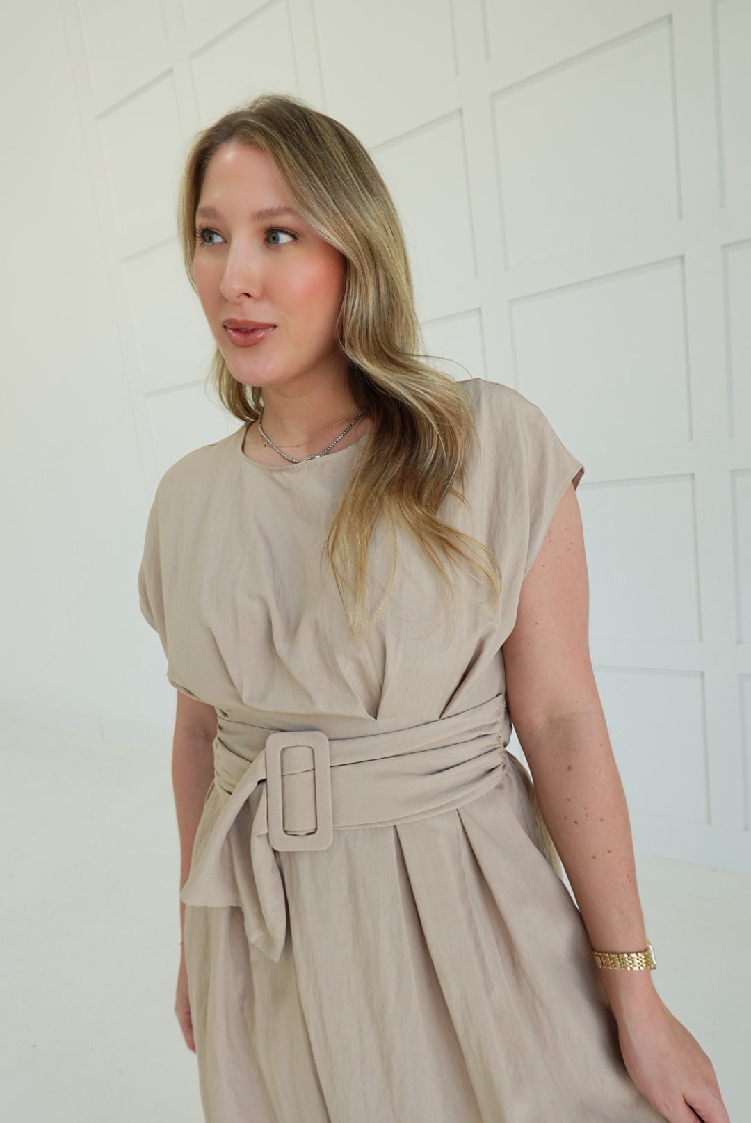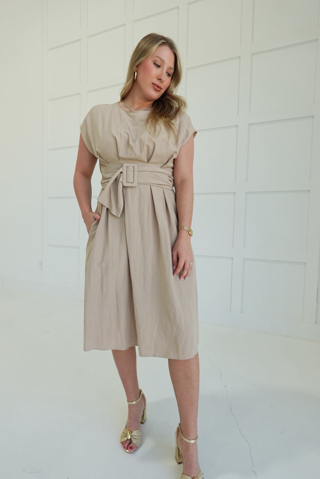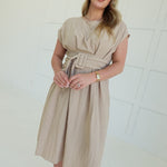 The Bailey Midi Dress commands attention with its bold buckle detail—a modern statement piece that refuses to blend in. Crafted from lightweight woven fabric with a polished drape, it moves with confidence and grace. Soft cap sleeves add an unexpected feminine contrast to the edgy hardware, while the midi length keeps you grounded and in control. Versatile enough for a power lunch or evening out, this dress proves that refined doesn't mean playing it safe.