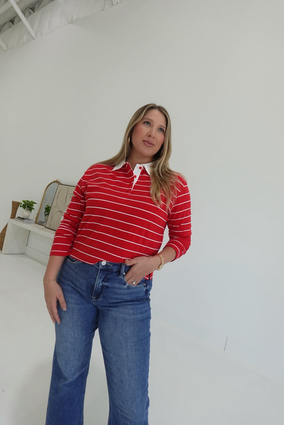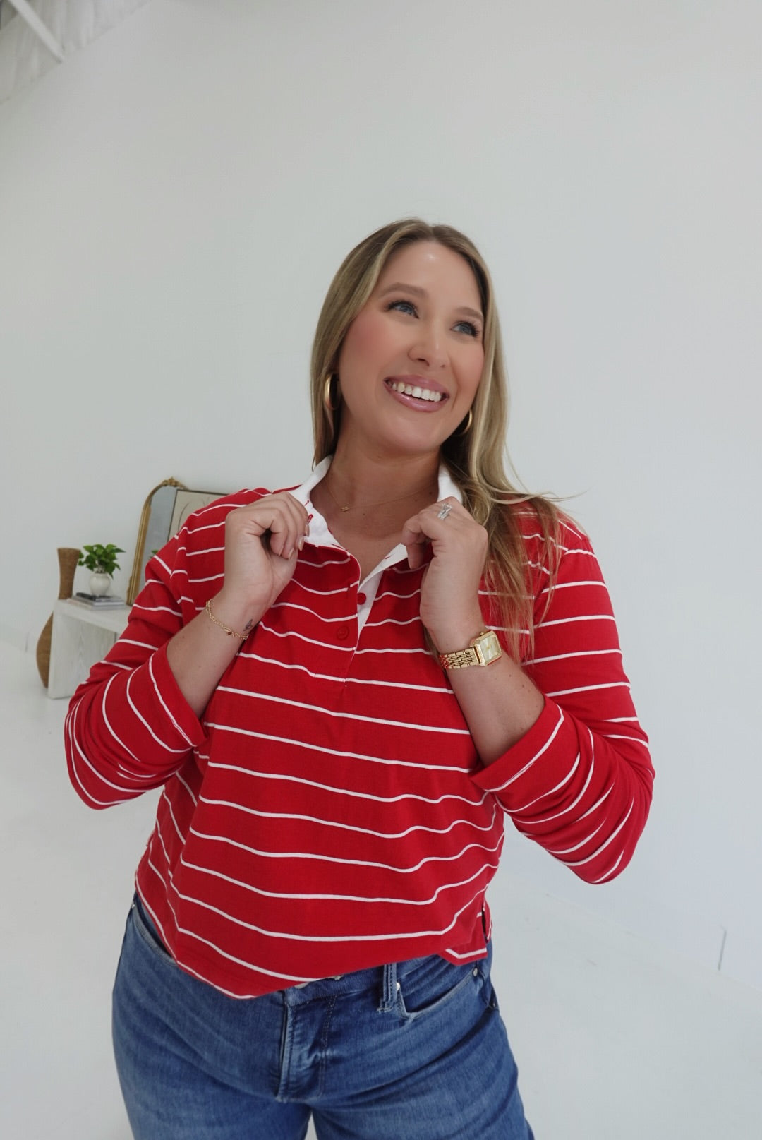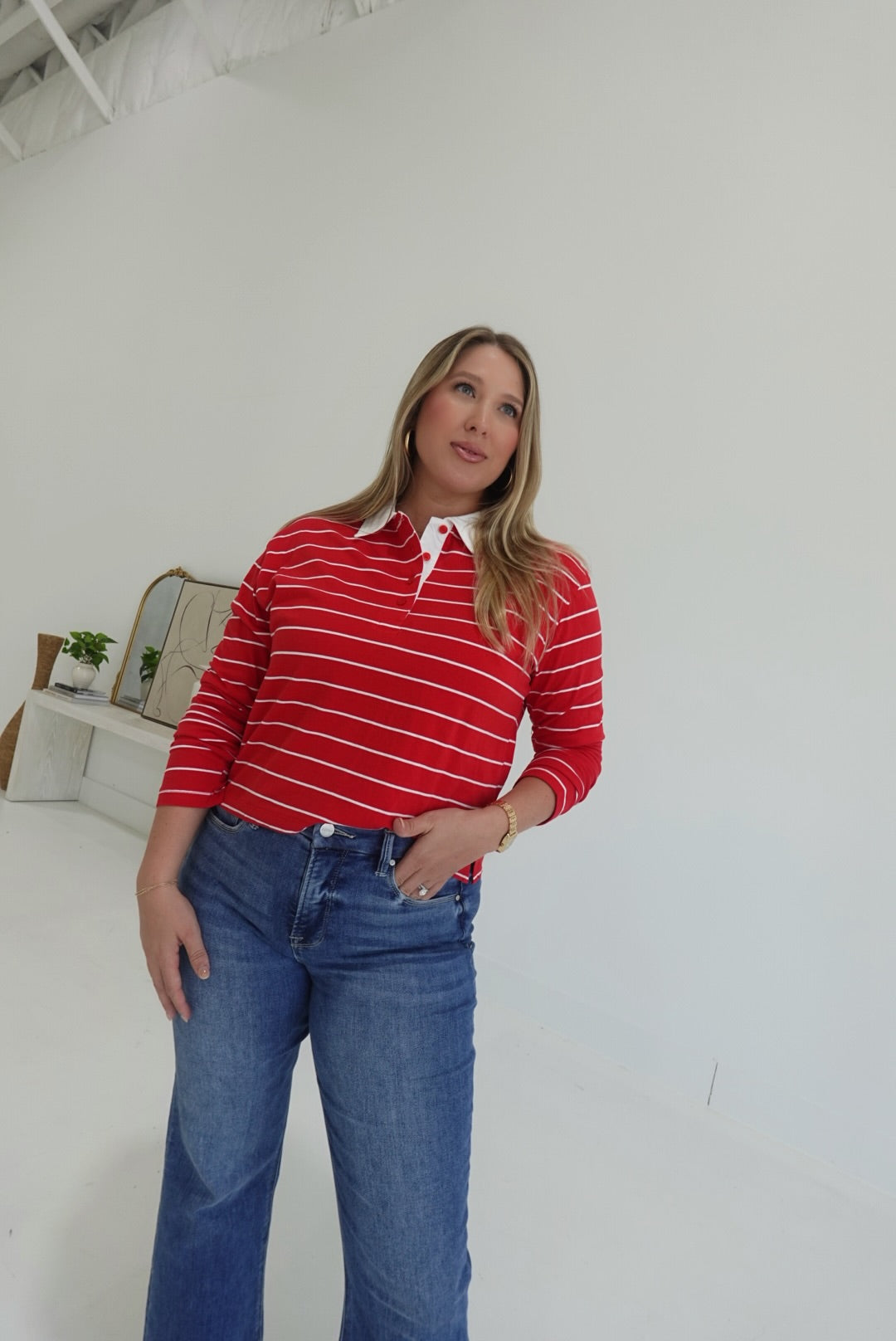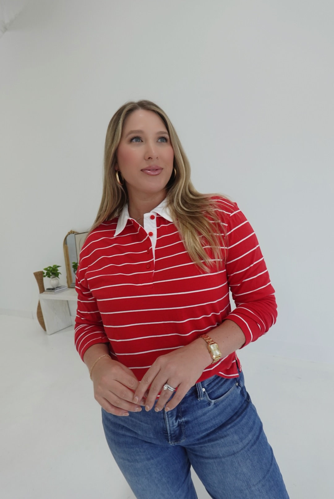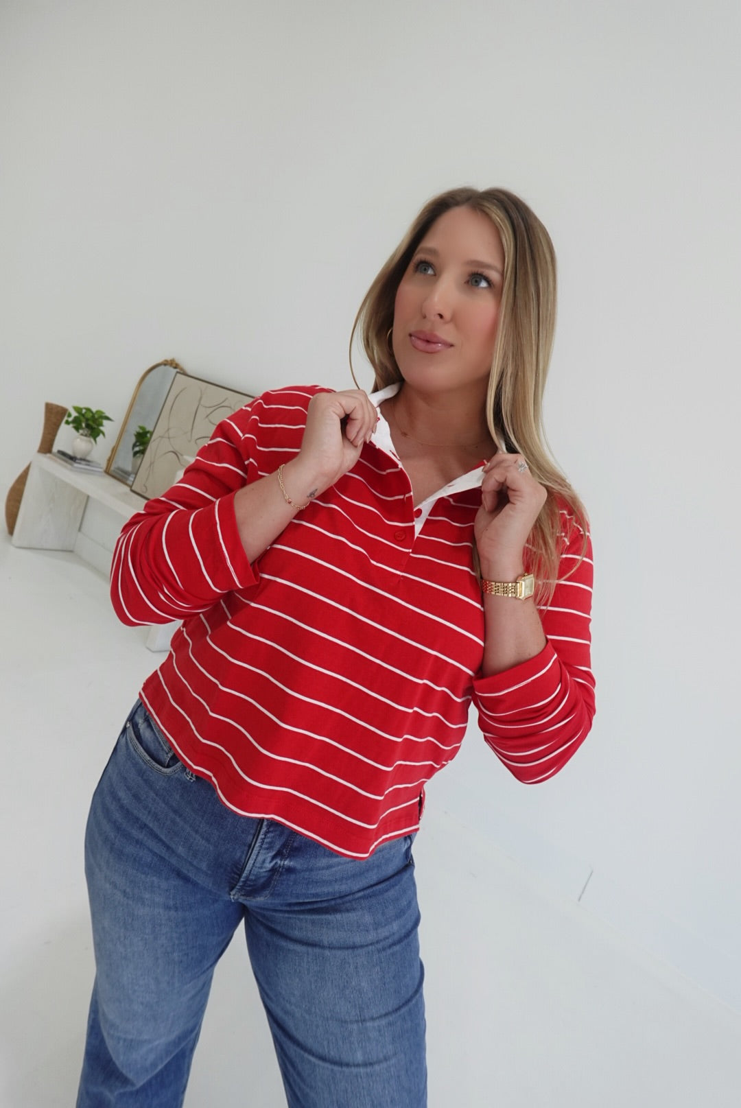 The Bastian Collared Top in red and white features a classic striped collar and a stylish half-button design, combining comfort with a polished look. Its breathable fabric ensures all-day ease, making it perfect for both casual outings and relaxed workdays. This top is an effortless way to add a touch of sophistication to your everyday wardrobe.