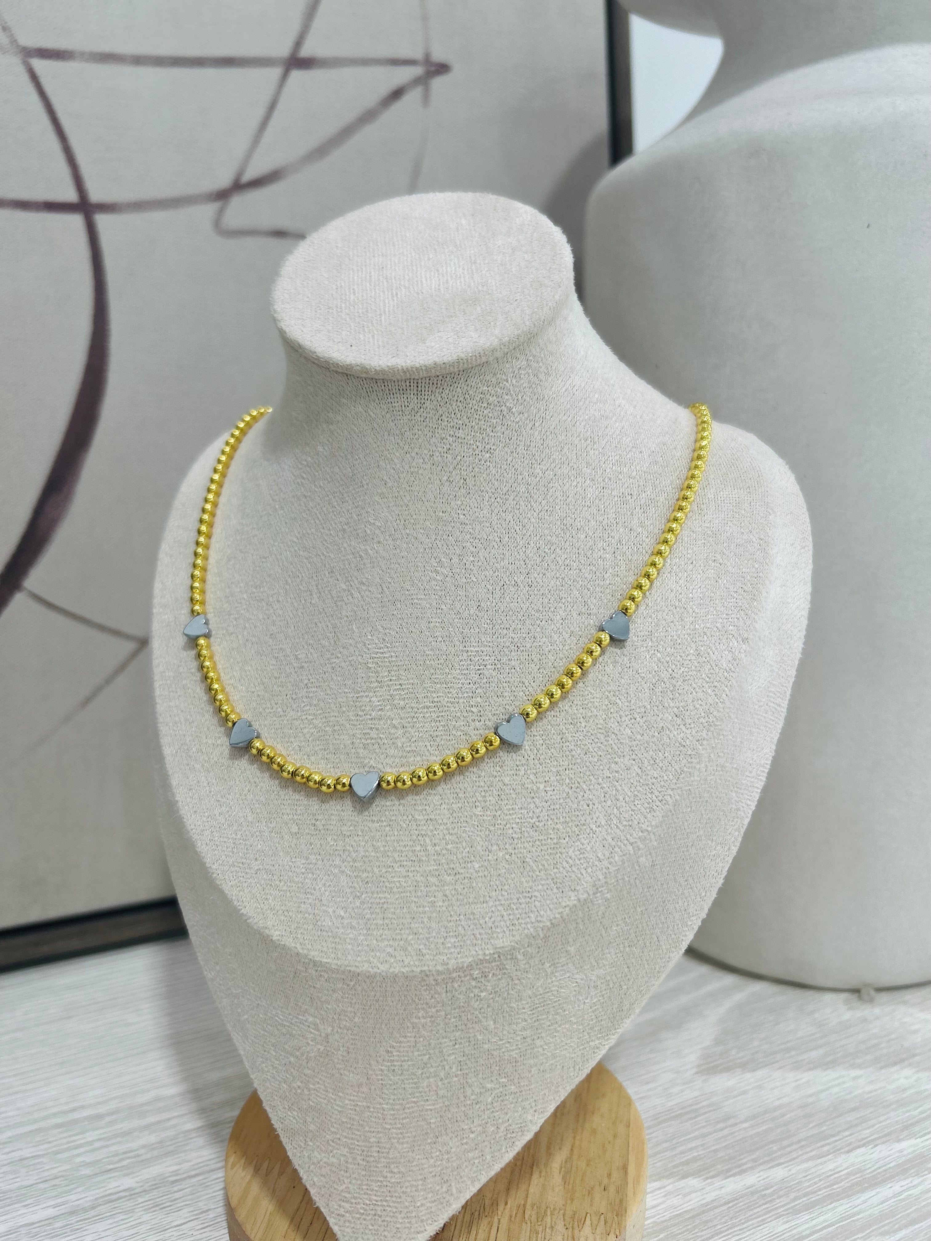 Dare to make a statement with this bold choker that commands attention. Delicate gold beads frame striking silver heart accents, creating an edgy contrast that refuses to blend in. Wear it close to the neck for maximum impact—perfect for layering or standing solo as your signature piece. Fearless, feminine, unforgettable.