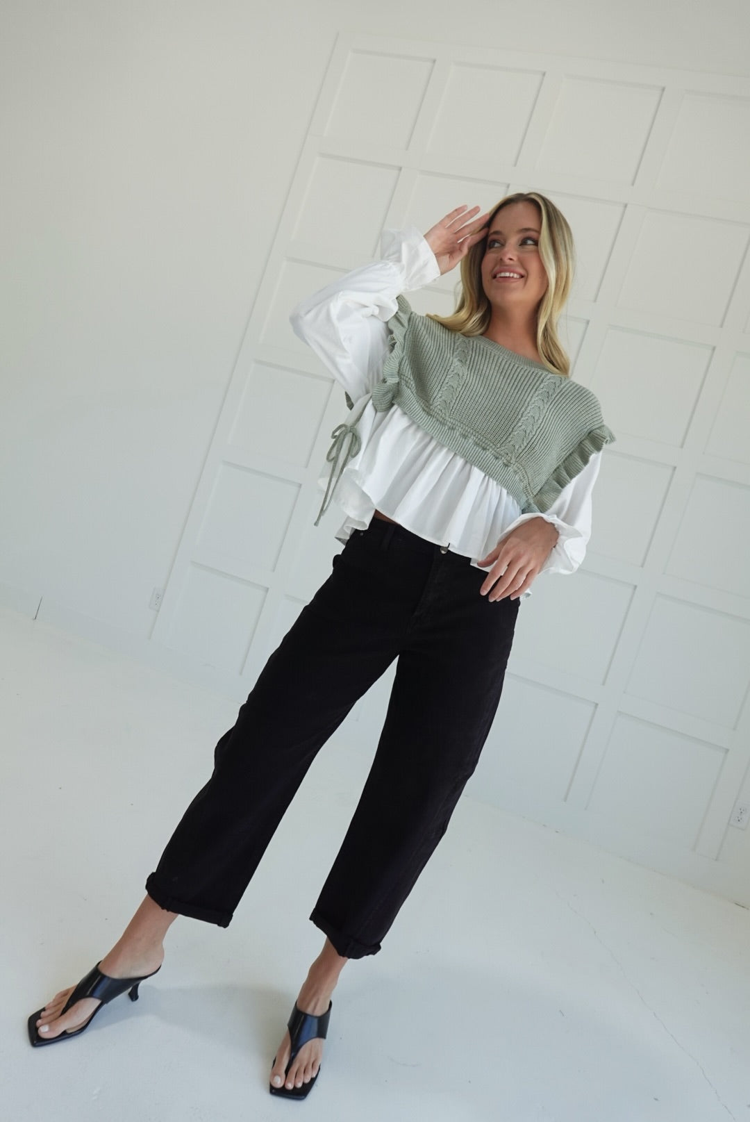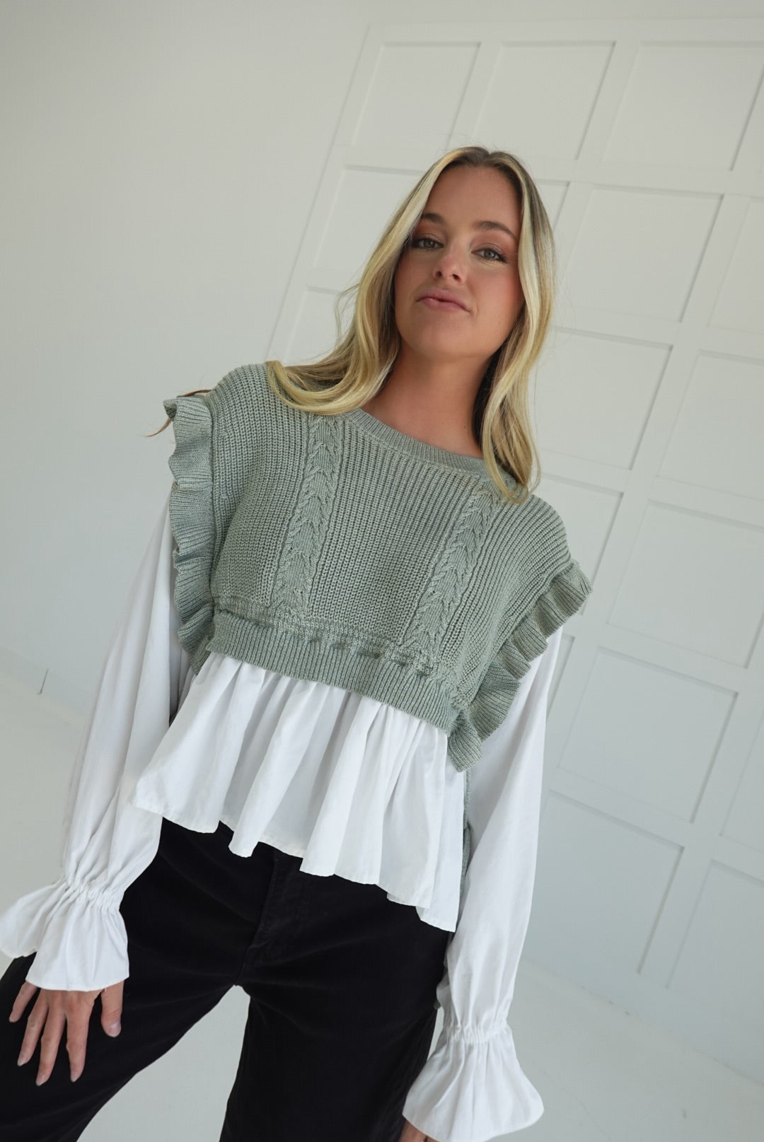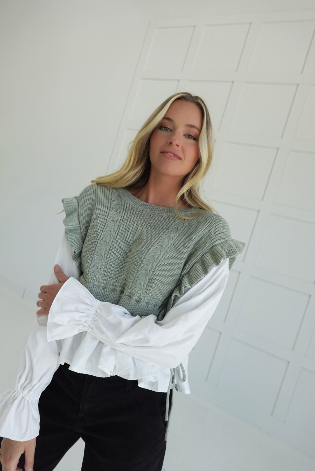The Beatrice Knitted Vest Blouse combines the cozy texture of a knit vest with a delicate ruffle top for a stylish layered look. Perfect for adding warmth and feminine flair to your outfit, this versatile piece pairs easily with jeans or skirts. Its soft fabric and unique design offer comfort while elevating your everyday wardrobe with subtle elegance.