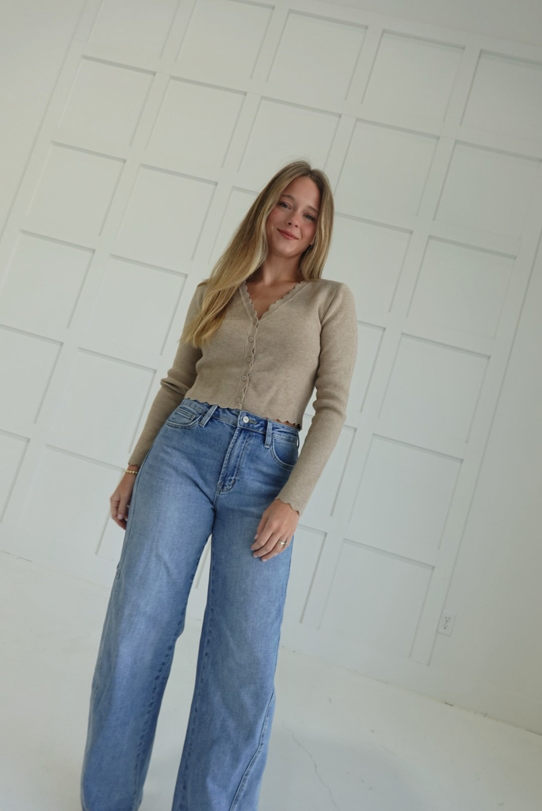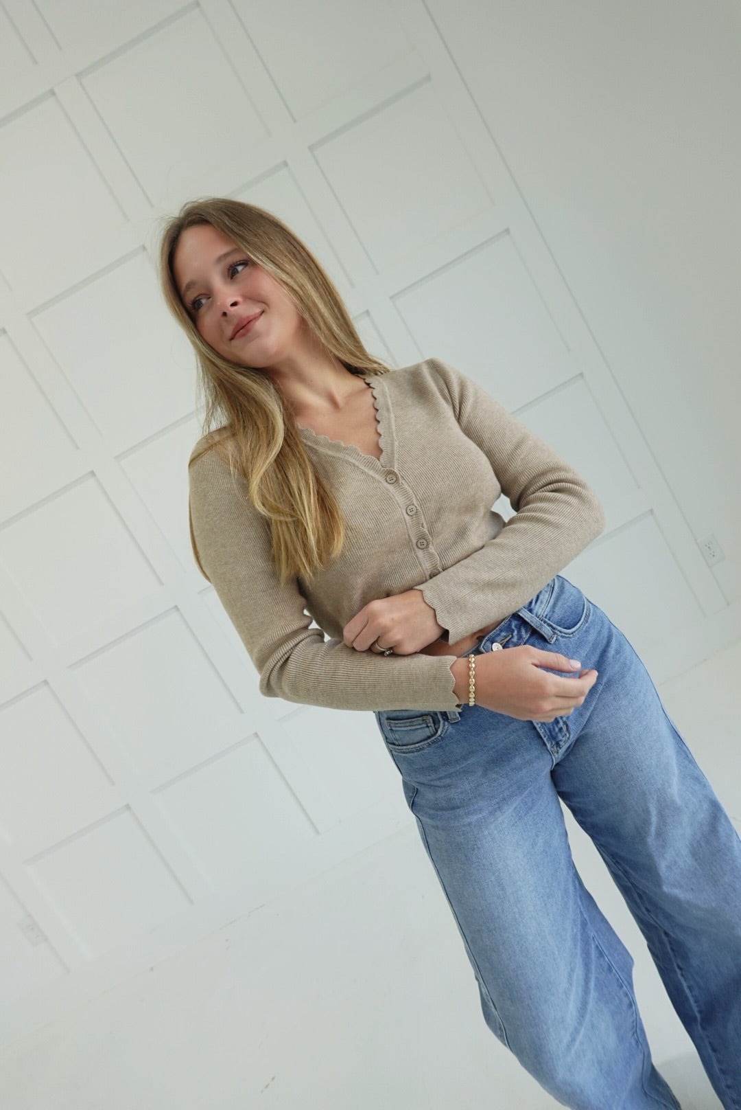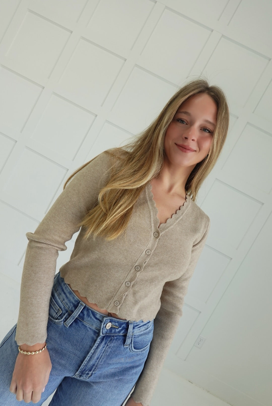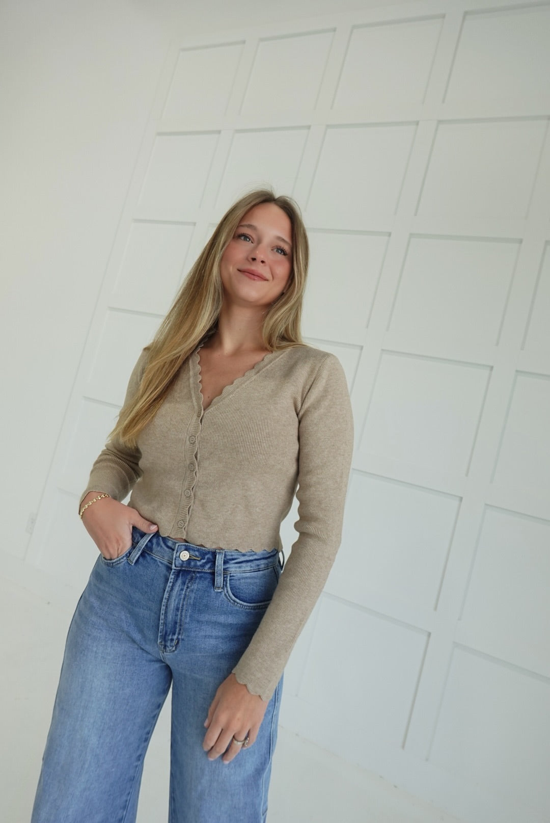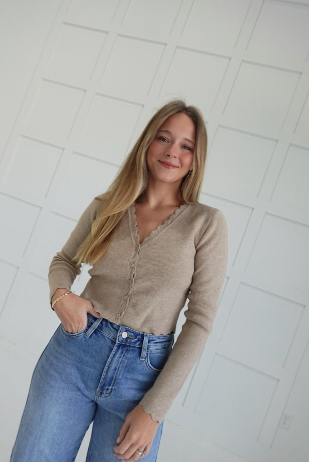 The Beg For You Cardi Top features a delicate scallop-edged V-neckline that adds a feminine touch to your look. This lightweight cardigan top offers comfortable layering with a flattering fit, perfect for any occasion. Its soft fabric ensures all-day ease, making it a versatile addition to your wardrobe you can rely on.