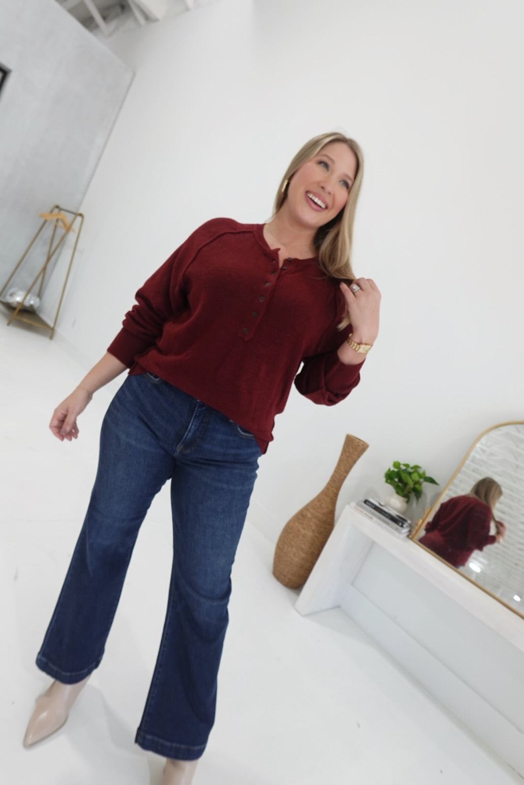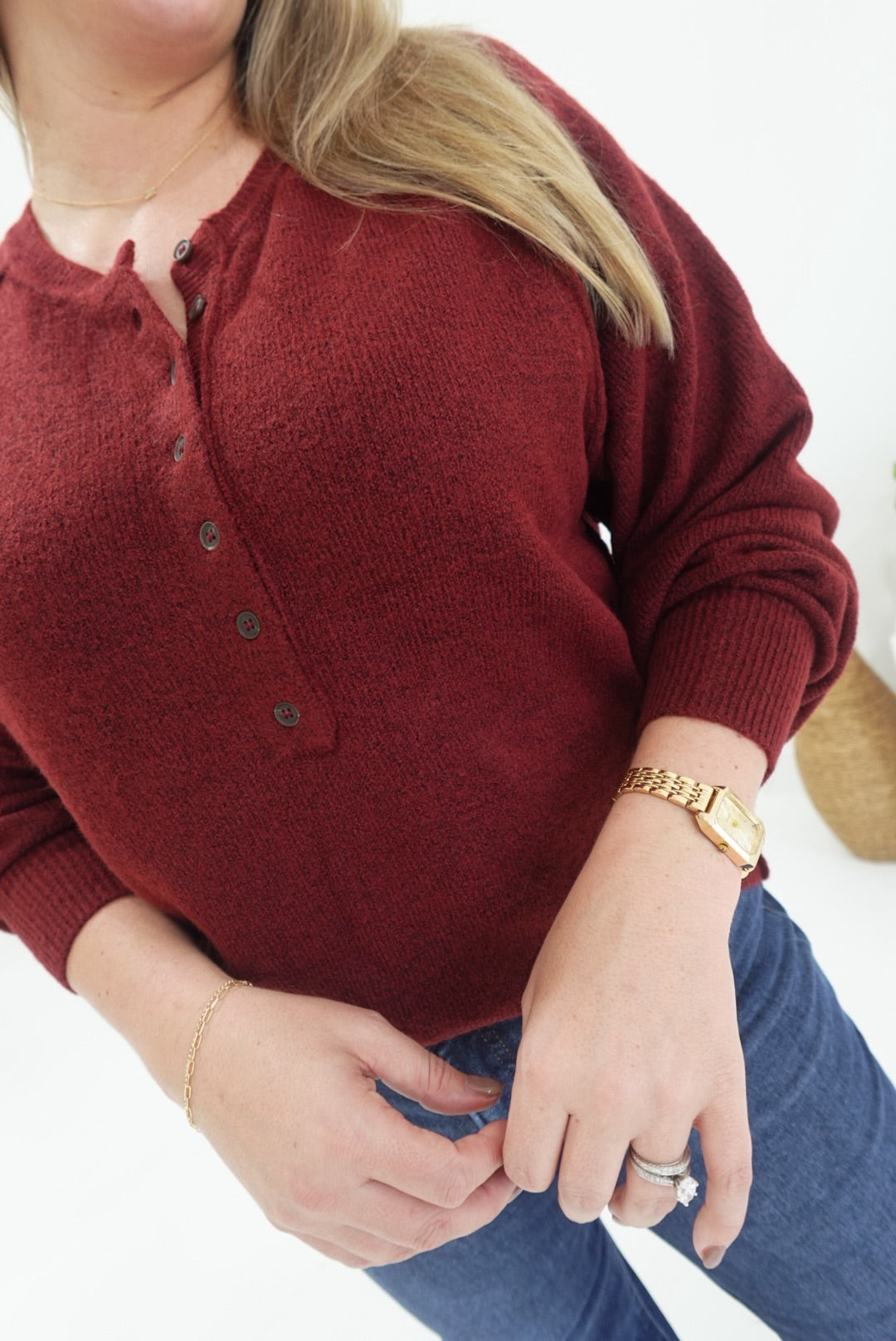 The 'Ber' Months Sweater in brown offers cozy comfort with its raglan long sleeves and classic henley knit design. Perfect for layering, it provides warmth without feeling bulky, ideal for transitioning through cooler seasons. Its relaxed fit and soft knit fabric ensure you stay comfortable all day, whether you're out and about or relaxing at home.