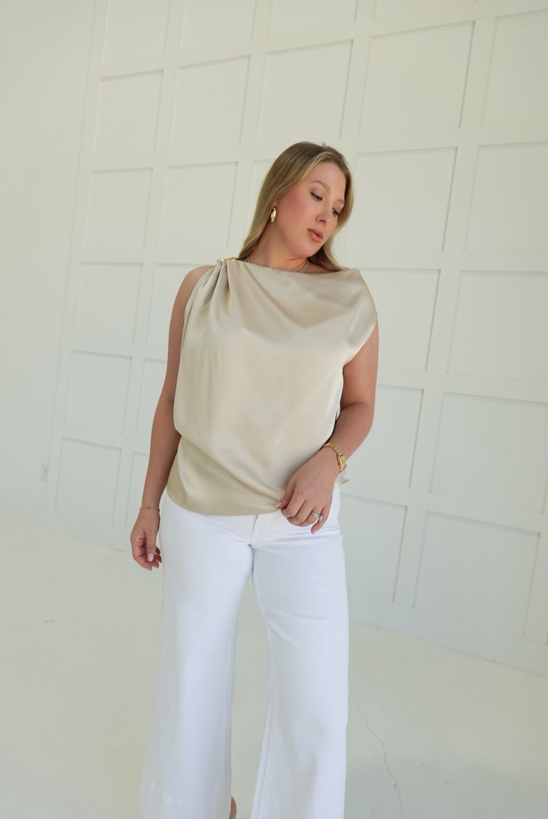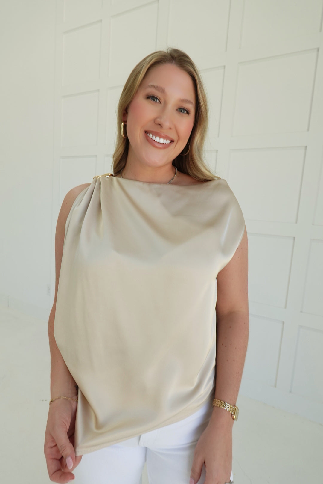 The Berkley Blouse commands attention with its bold asymmetric cut and luxurious satin finish. Sharp shoulder trim creates an edgy silhouette that refuses to blend in, while the fluid fabric drapes with understated elegance. Perfect for those who dare to stand out—wear it solo for maximum impact or layer it under tailored pieces for a modern edge.