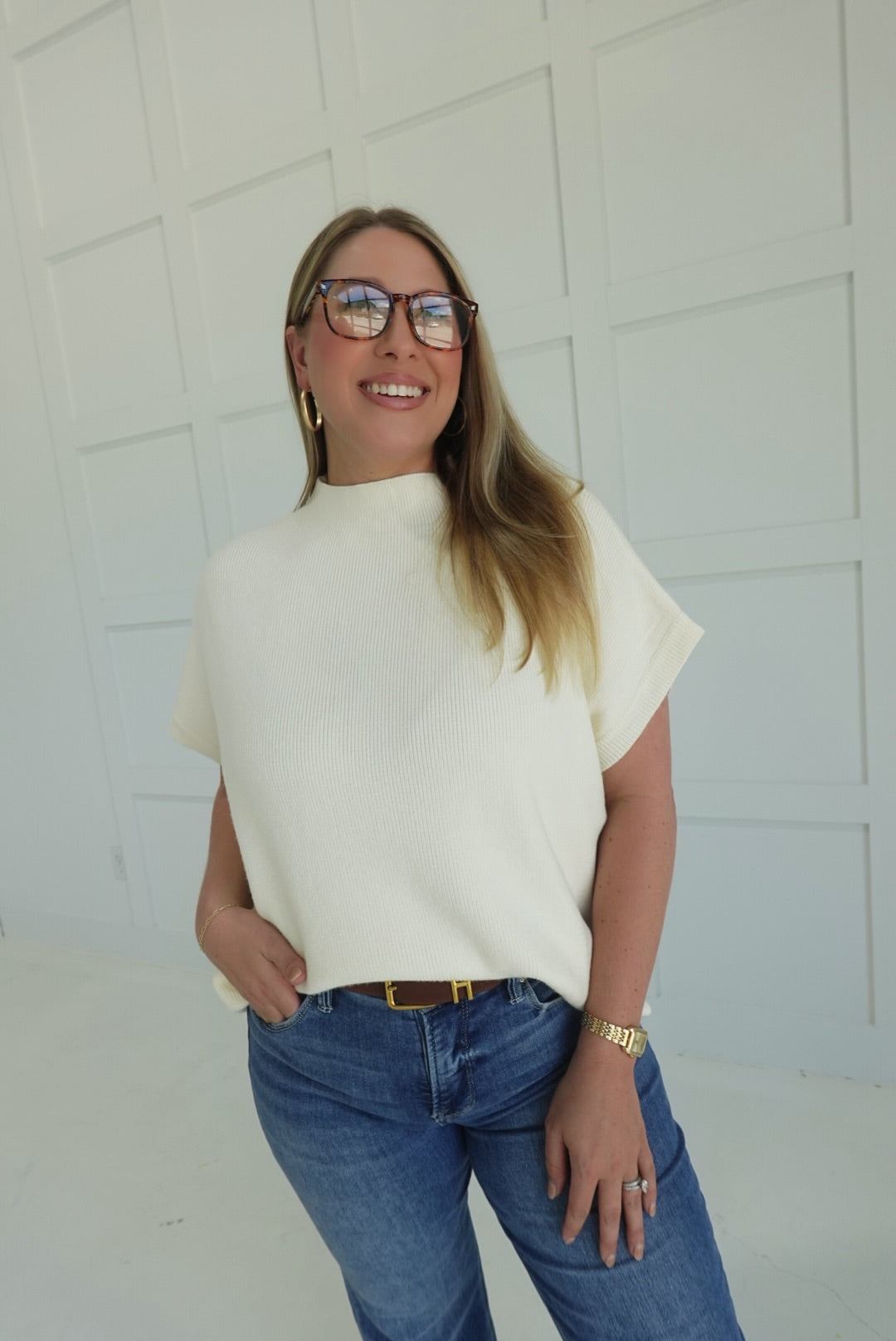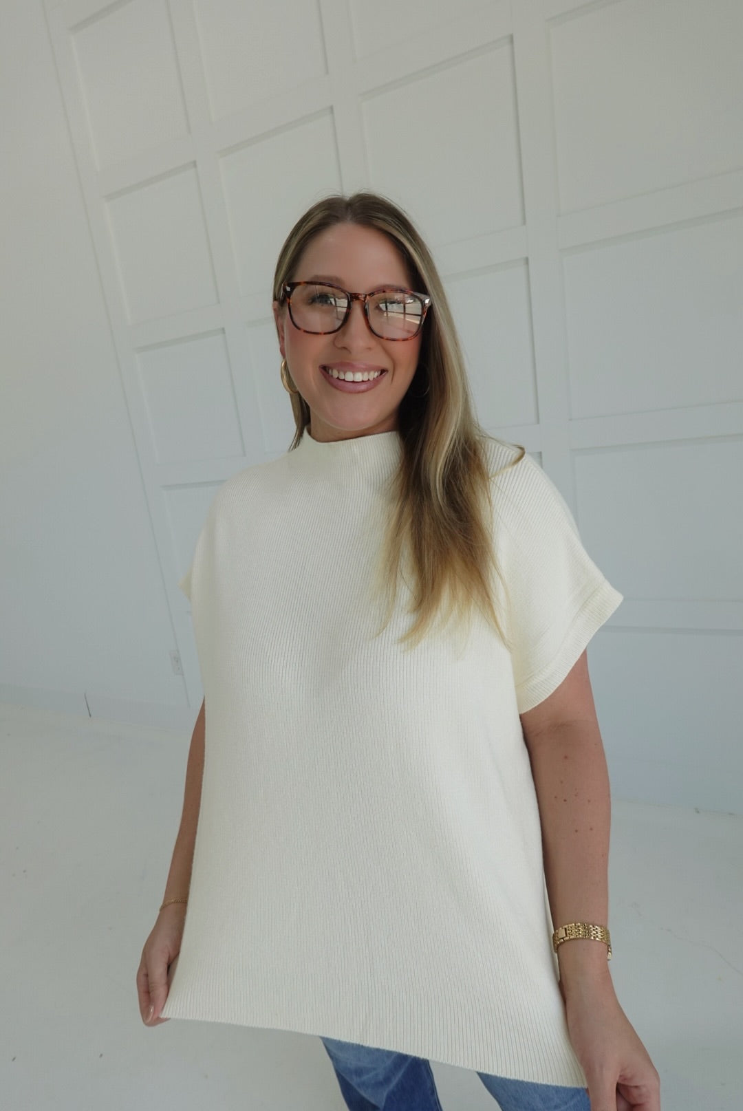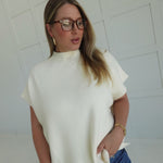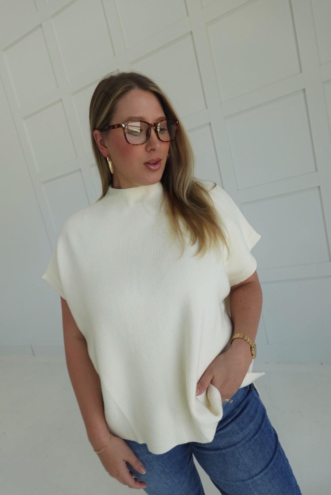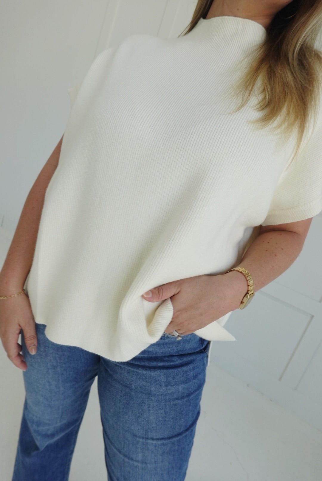 This ivory sweater features a comfortable drop shoulder design and a stylish mock neck, offering a relaxed yet polished look. Its short sleeves make it perfect for layering or wearing on milder days, combining versatility with ease of movement. Ideal for casual wear, this lightweight sweater brings understated elegance to your wardrobe.