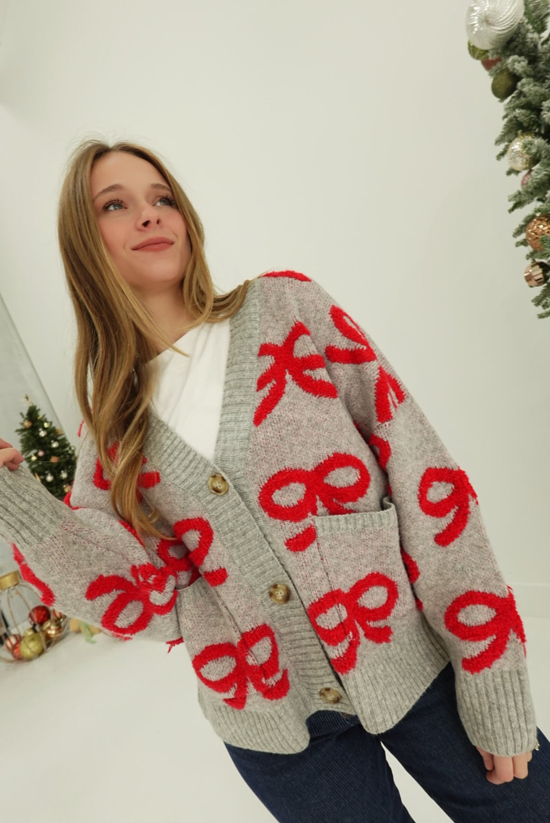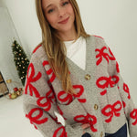 Elevate your everyday style with the Blair Bow Cardi, a charming knit cardigan that brings playful sophistication to any outfit. Featuring an all-over bow pattern, this button-down piece offers a feminine touch that works beautifully layered over dresses or paired with your favorite jeans. The soft knit fabric provides comfortable warmth without bulk, making it perfect for transitional seasons or layering year-round. Whether you're dressing up or keeping it casual, this versatile cardigan supports your personal style with effortless elegance.