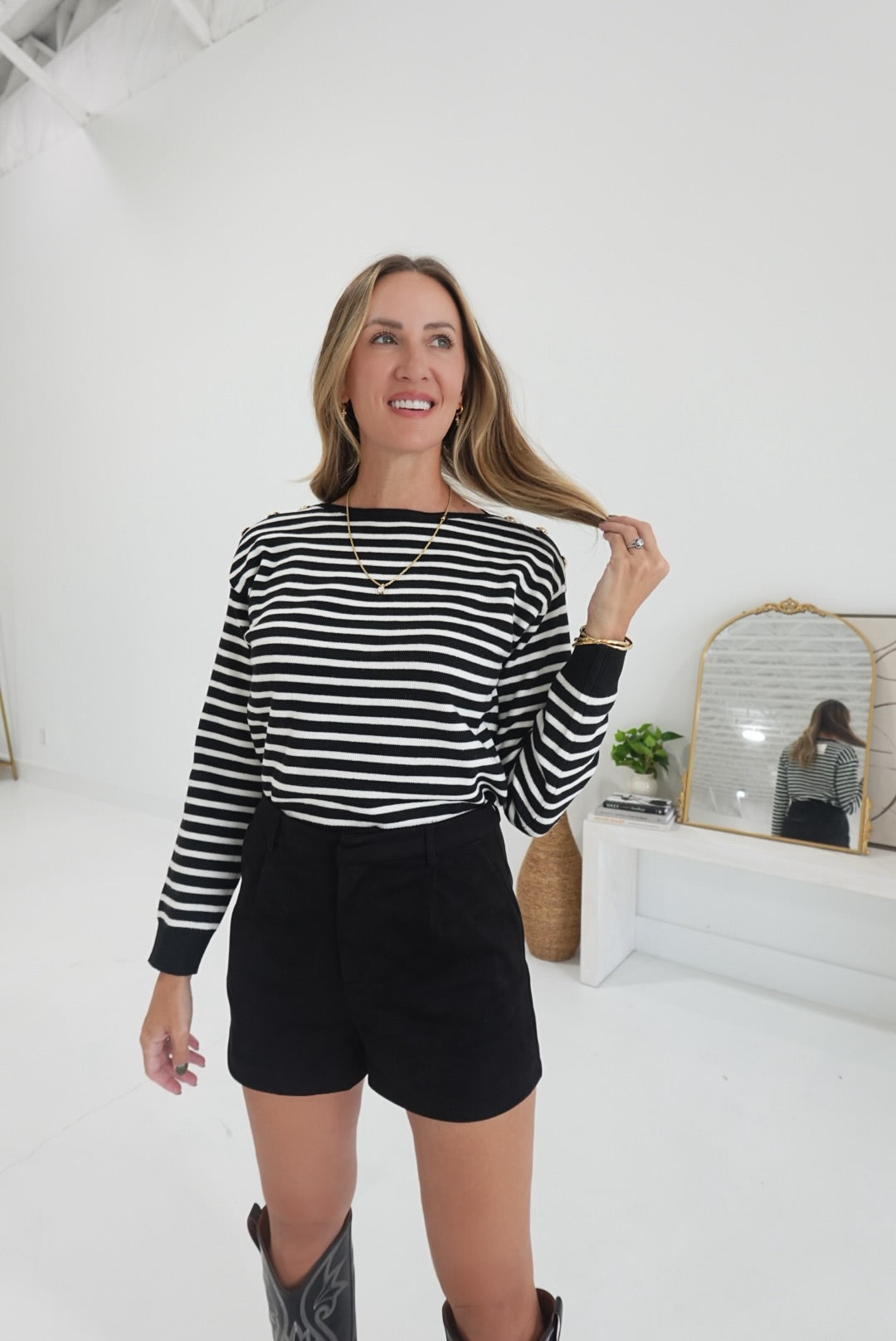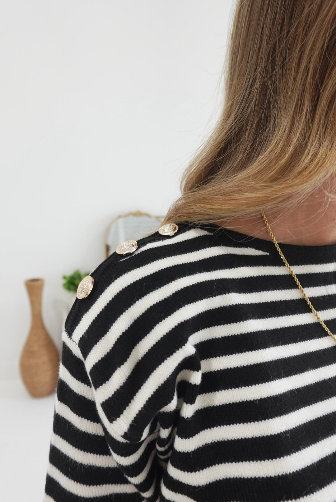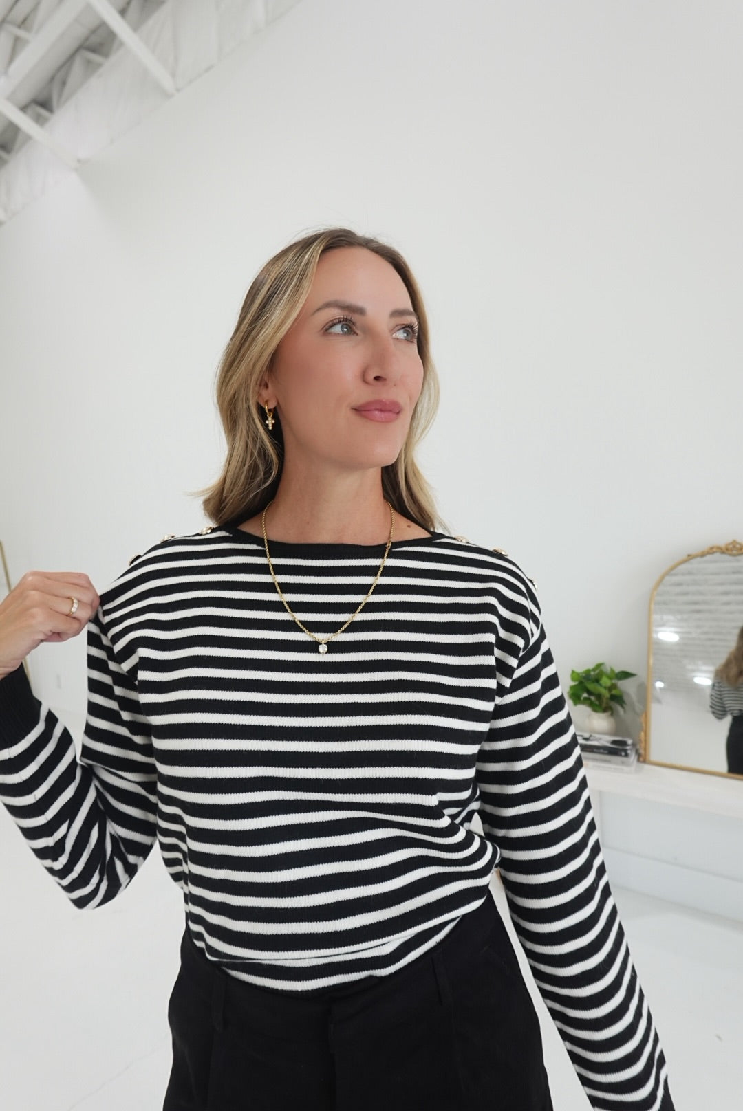 The Blake Striped Sweater in black and cream offers cozy warmth with its long sleeves and soft fabric, perfect for cooler days. Thoughtfully designed, it features buttoned shoulder details that add a touch of style and ease when layering. This sweater combines comfort and subtle sophistication, making it an ideal choice for everyday wear or casual outings.