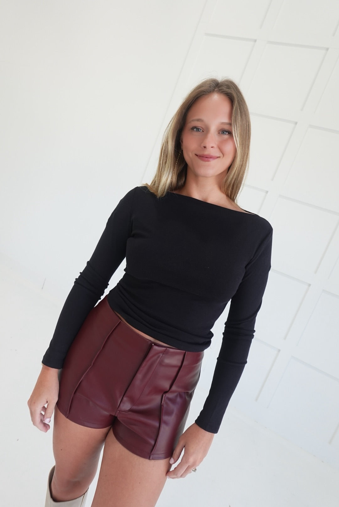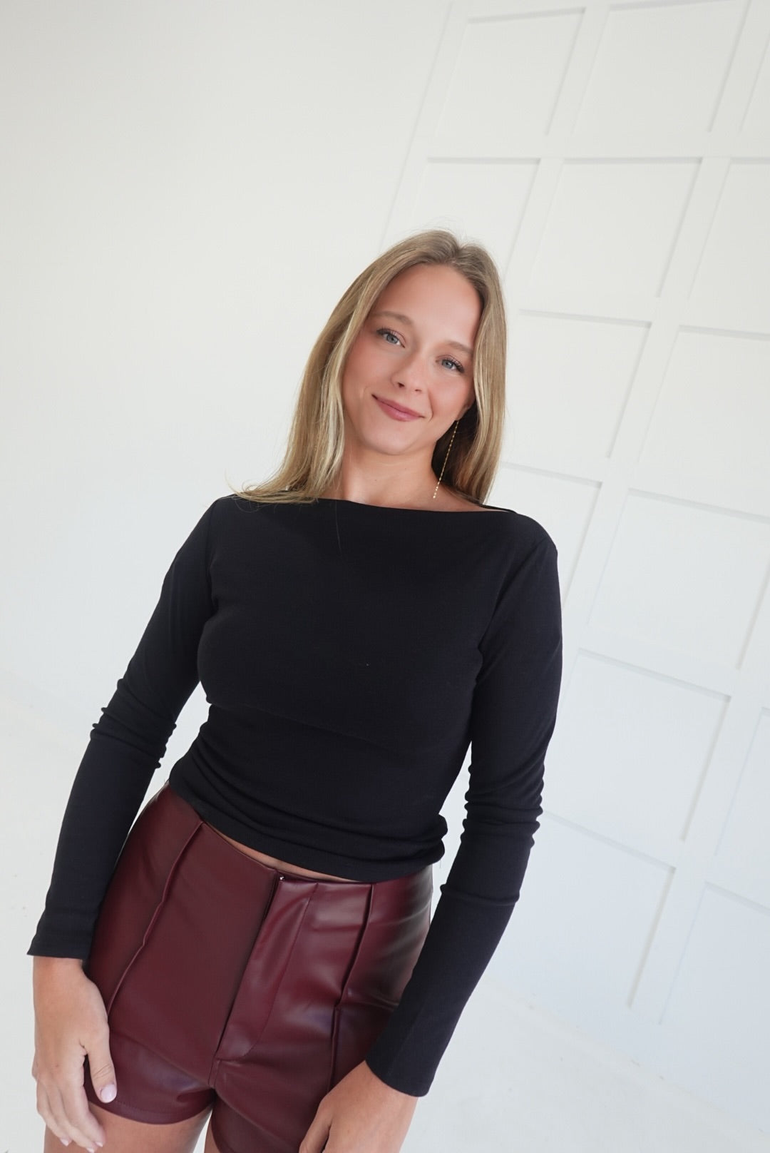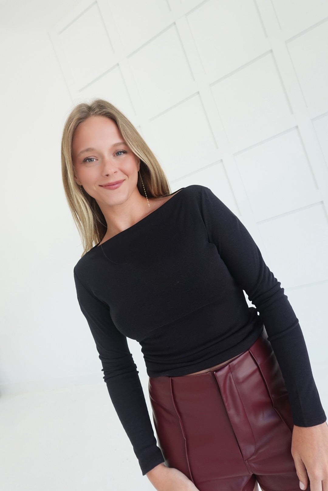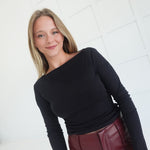 Experience effortless comfort with this Boatneck Long Sleeve Tee in classic black. Crafted from brushed rib knit fabric, it feels soft against your skin while providing gentle warmth. The wide boat neck design offers a flattering, relaxed fit that suits any occasion, whether layered or worn alone. Designed to move with you, this top combines style and coziness to support your everyday wardrobe needs.