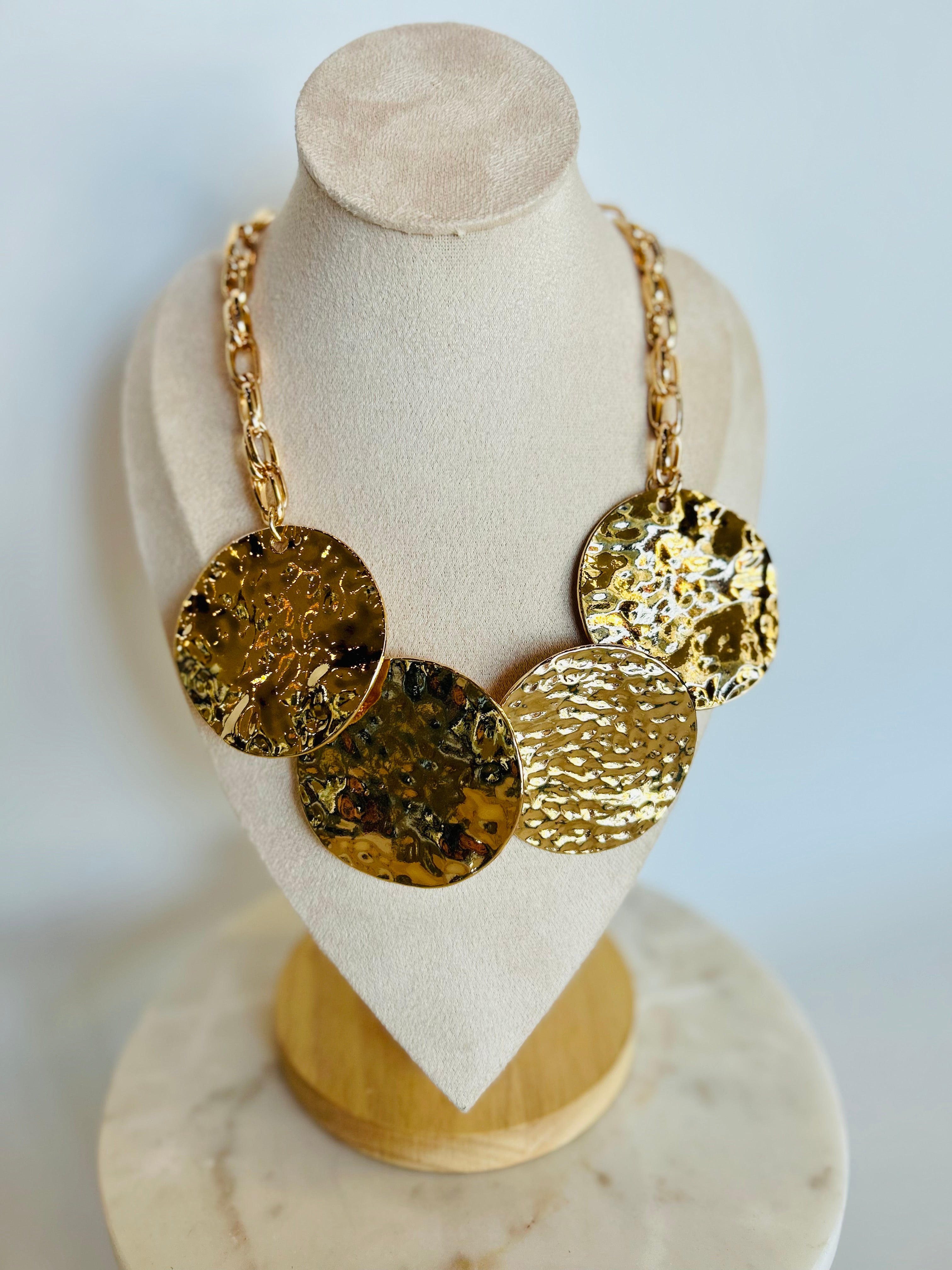 Make a statement with this striking hammered disc necklace. The textured, oversized pendant catches light beautifully, creating dynamic dimension with every movement. Bold enough to command attention yet versatile enough to elevate any look—from casual to evening wear. This fearless piece celebrates confidence and individuality, perfect for those who refuse to blend in. Wear it as your signature accessory and let your presence do the talking.