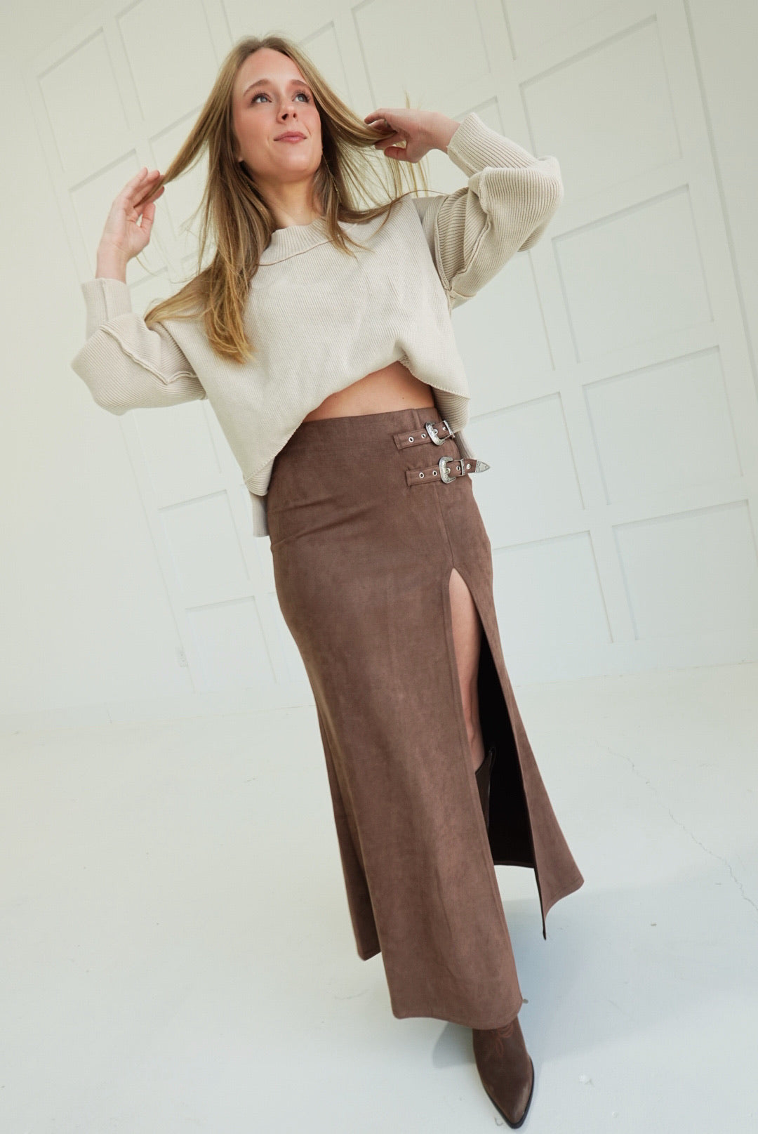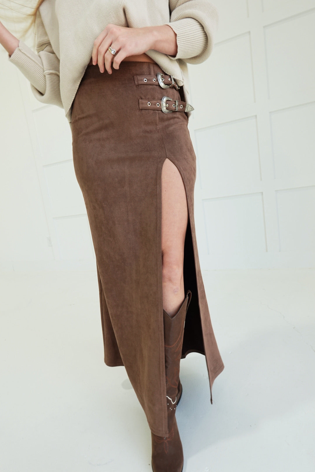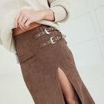 Slip into effortless edge with the Bonnie Maxi Skirt. This faux suede statement piece commands attention with a daring high slit and bold buckle detail that transforms a classic silhouette into something unforgettable. Luxuriously soft to the touch yet unapologetically bold, it's the perfect piece for those ready to take risks and turn heads. Pair it with a fitted top or let it stand alone—either way, you're making a move.