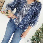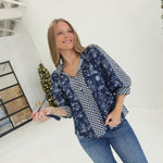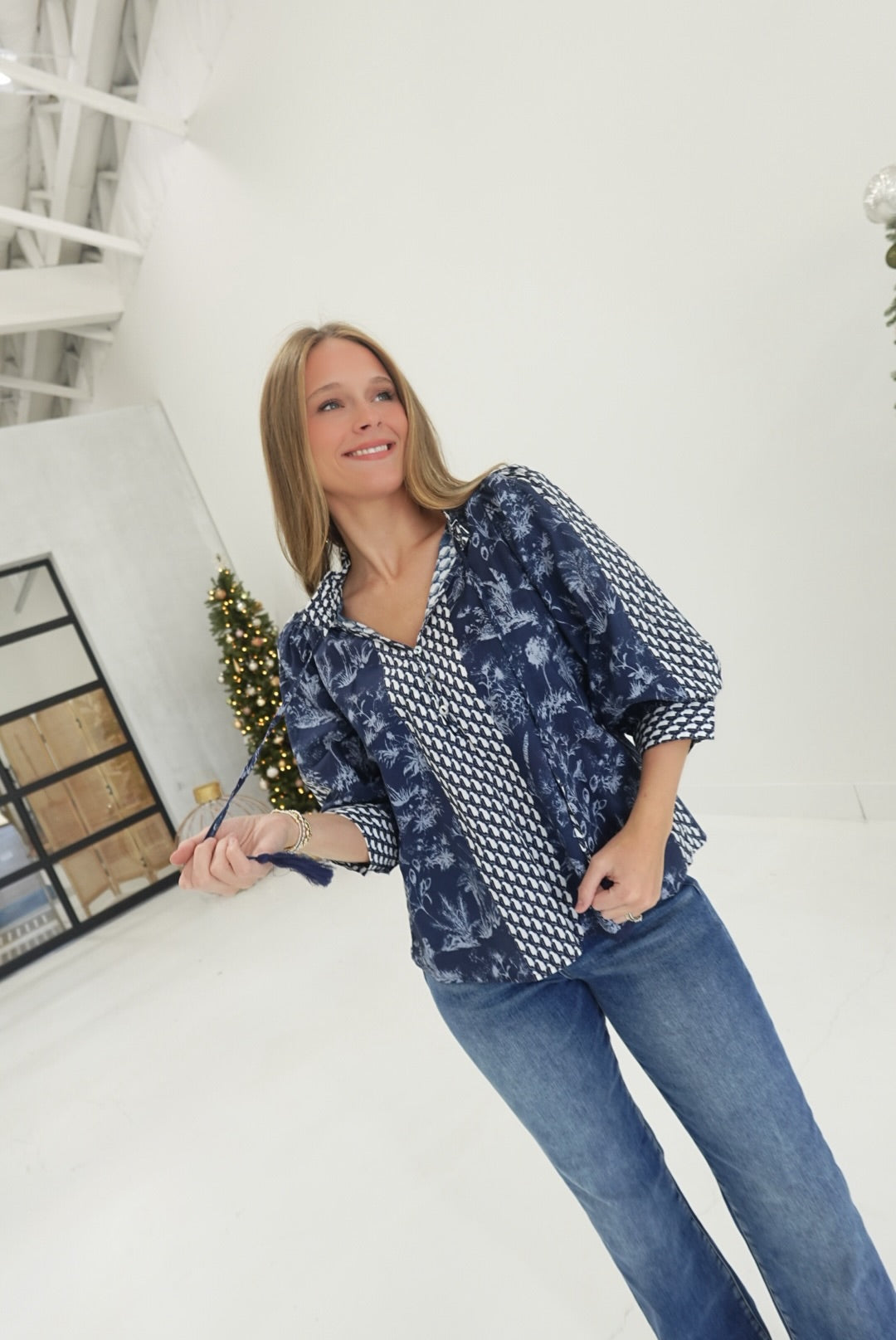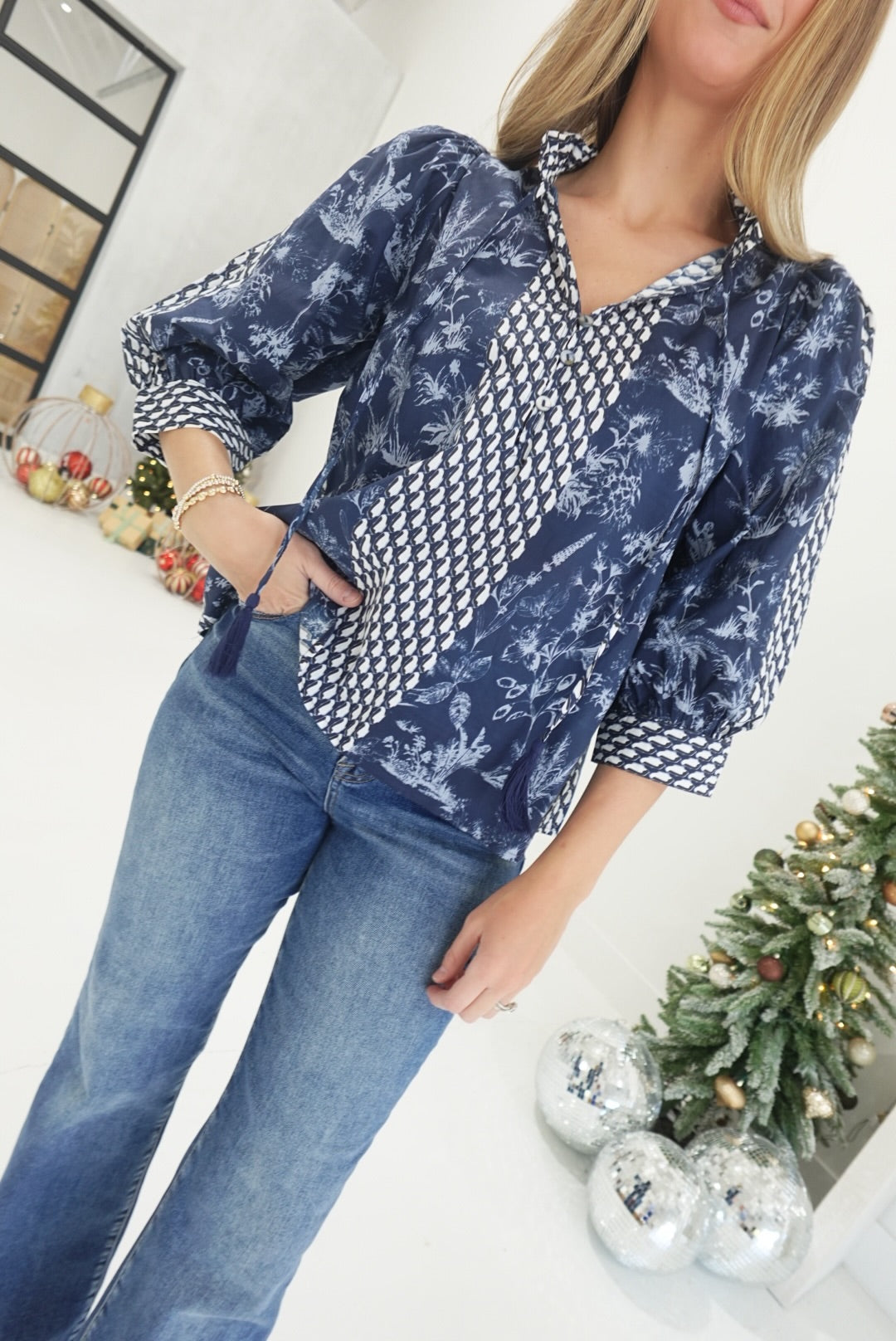 Embrace effortless elegance with this botanical print ¾ sleeve top, designed to celebrate your unique style. The striking contrast tassel tie V-neck draws attention to your neckline, while the smocked neck and back panel create beautiful texture and dimension. Practical button details at the sleeve cuffs add a polished finishing touch. Crafted from lightweight woven fabric that's non-sheer and unlined, this piece moves with you throughout your day, offering comfort without compromise. Perfect for layering or wearing solo, it's a versatile addition to any wardrobe.