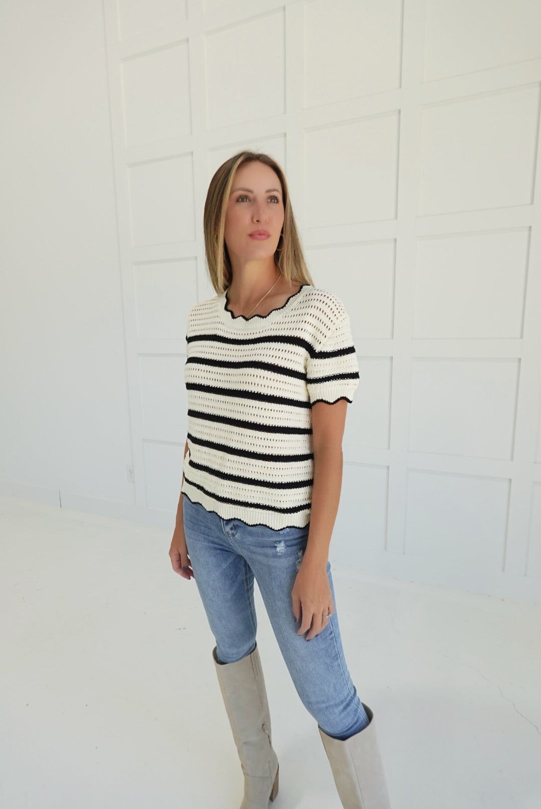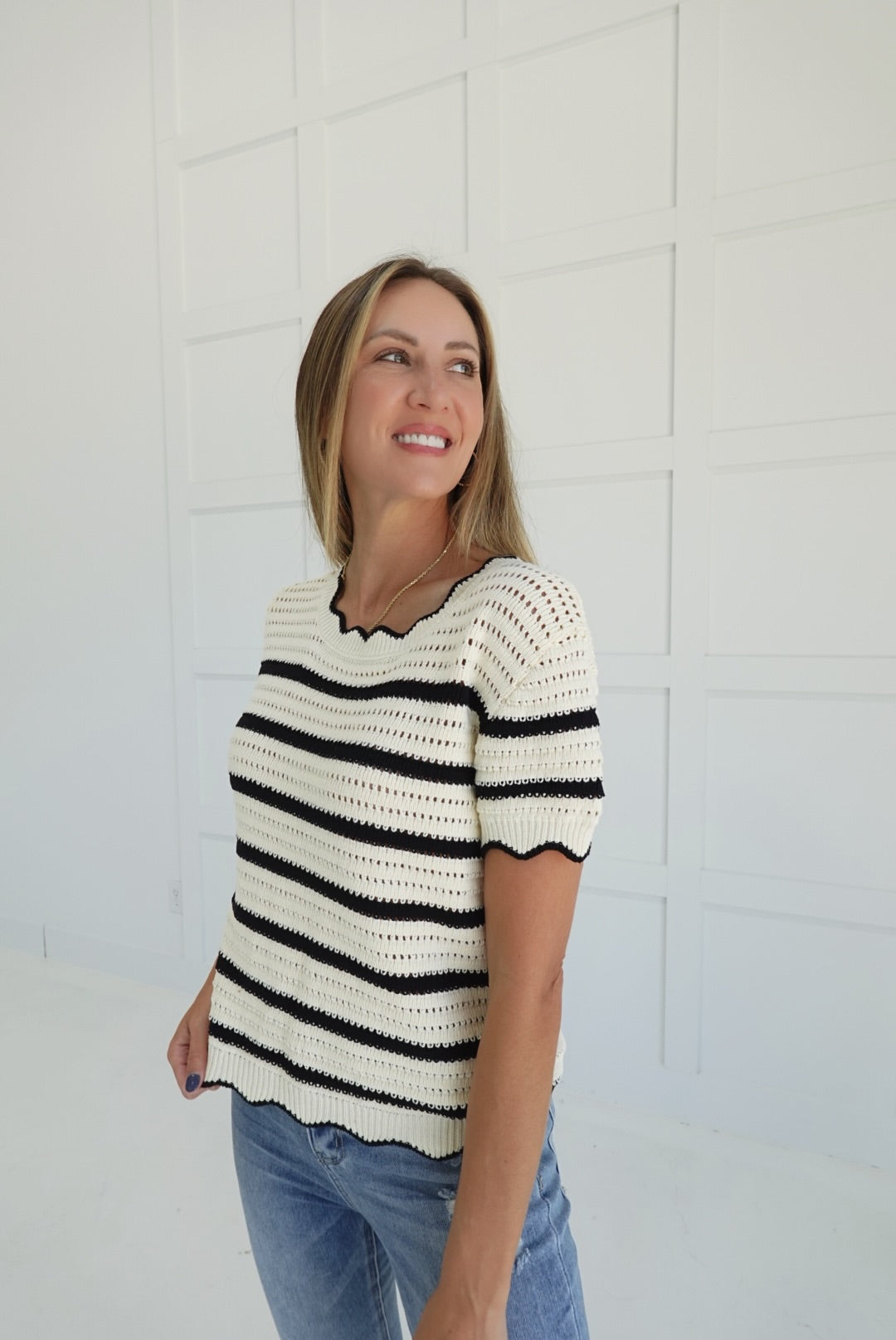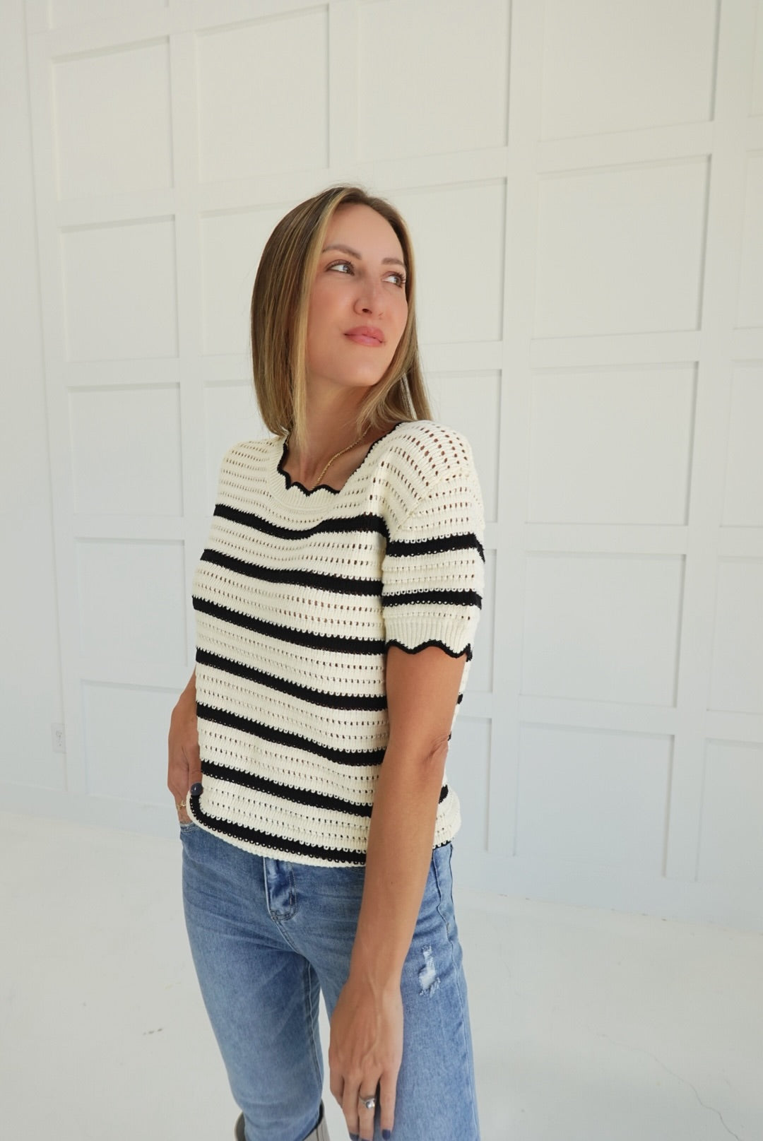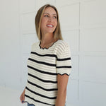 The Bottom-Line Sweater features a classic crew neck with a subtle edge detail, enhanced by stripe crochet knitting for a textured, stylish look. This cozy sweater offers both warmth and comfort, making it a dependable choice for layering on cooler days. Its thoughtful design supports effortless everyday wear while adding a touch of refined detail to your wardrobe.