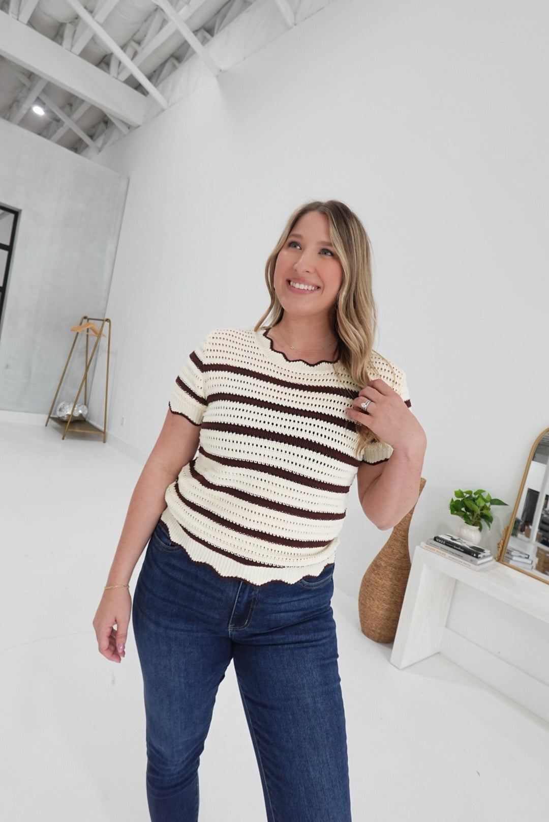 The Bottom-Line Sweater in brown features a classic crew neck with a subtle edge detail, enhanced by stripe crochet knitting for a textured, stylish look. This cozy sweater offers both warmth and comfort, making it a dependable choice for layering on cooler days. Its thoughtful design supports effortless everyday wear while adding a touch of refined detail to your wardrobe.
