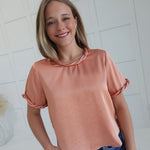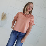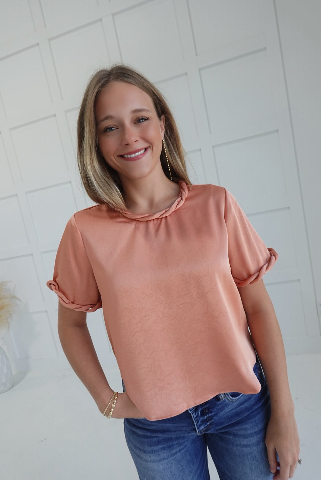 The Braswell Twist Detail Top features a flattering twist trim design at the round neckline, enhancing your style effortlessly. Its short sleeves offer comfort and breathability, making it perfect for everyday wear or layering. This versatile top combines simplicity with a unique touch to keep you looking polished and confident all day.