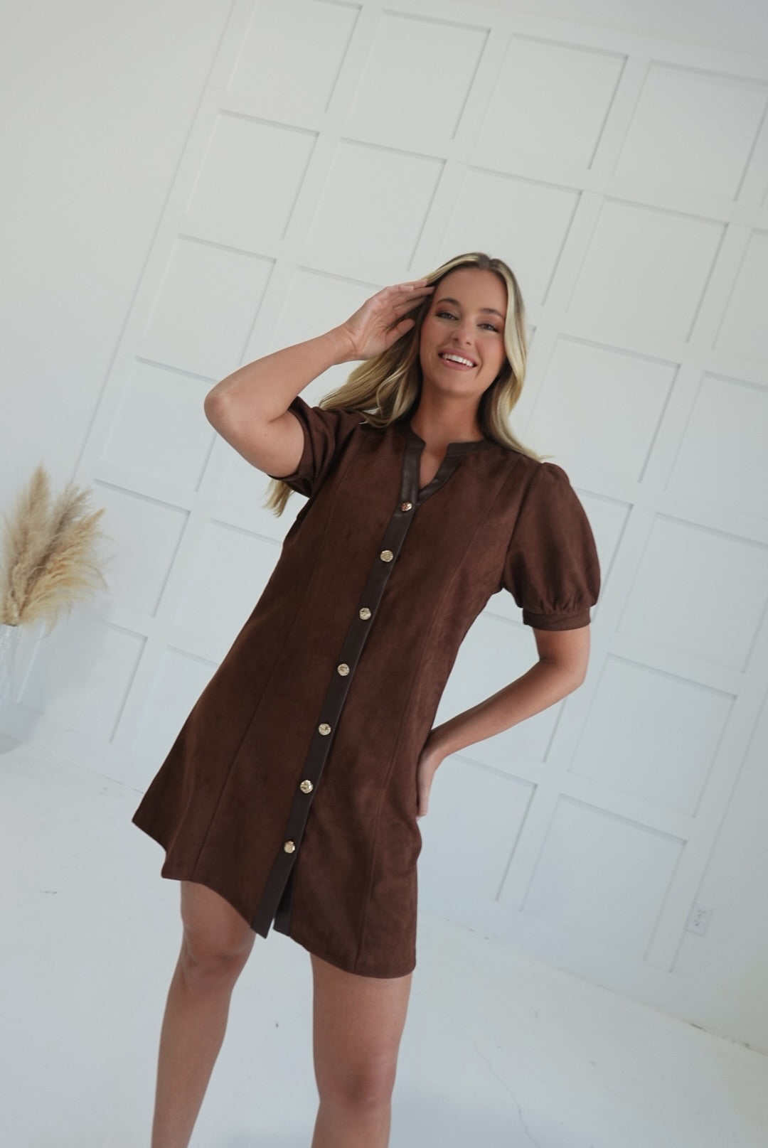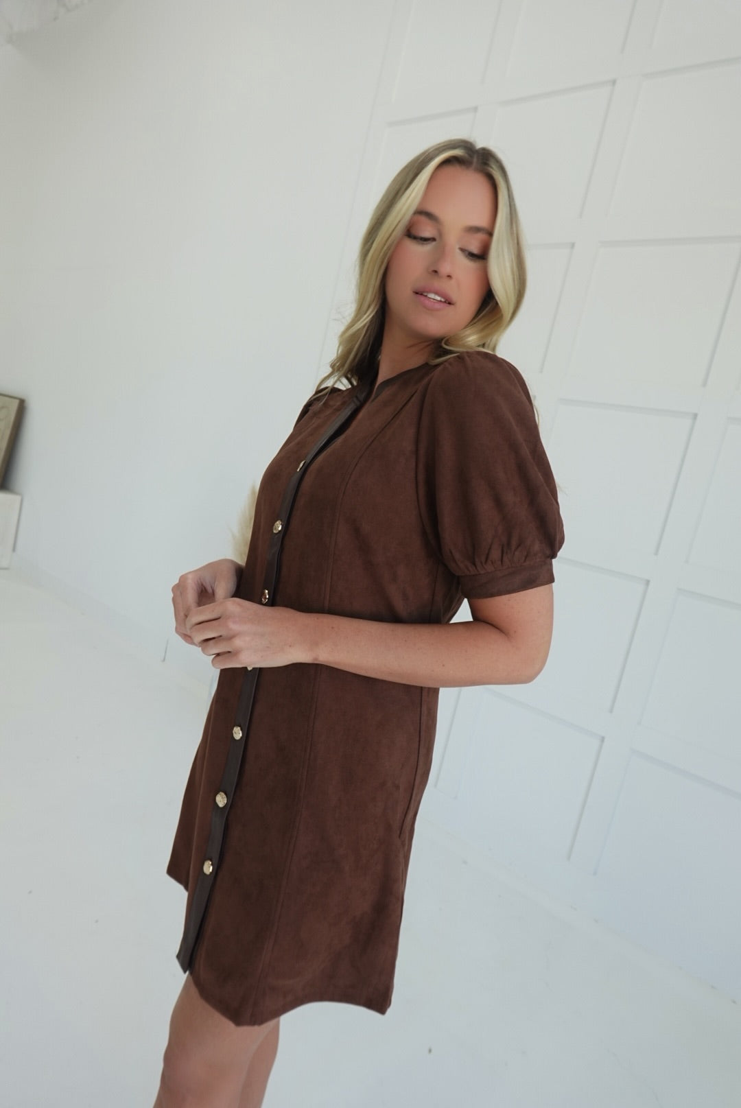 This Bravos Suede Mini Dress combines elegant puff sleeves and a flattering V-neck with a button-up front, enhancing both style and comfort. Crafted from soft suede, it offers a luxurious feel that moves with you, perfect for dressing up or casual occasions. The mini length adds a playful touch while maintaining a versatile silhouette you’ll love.