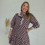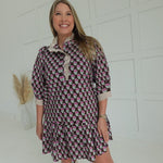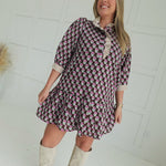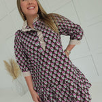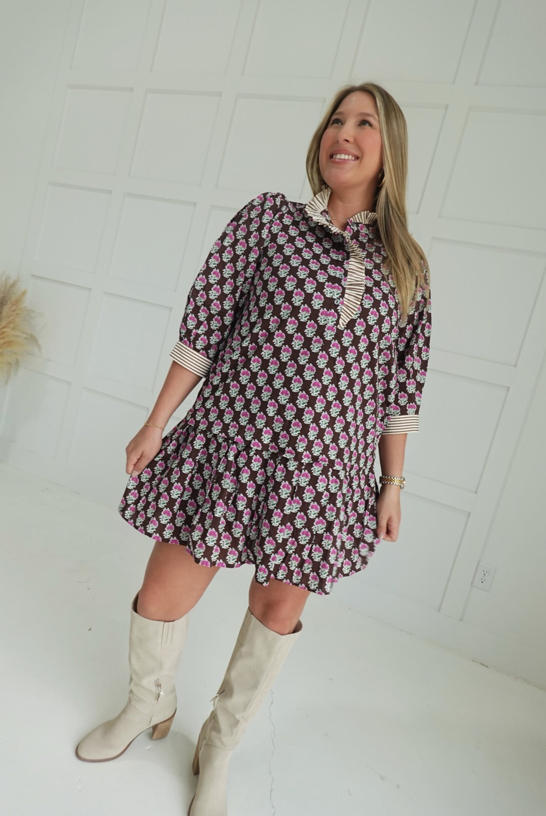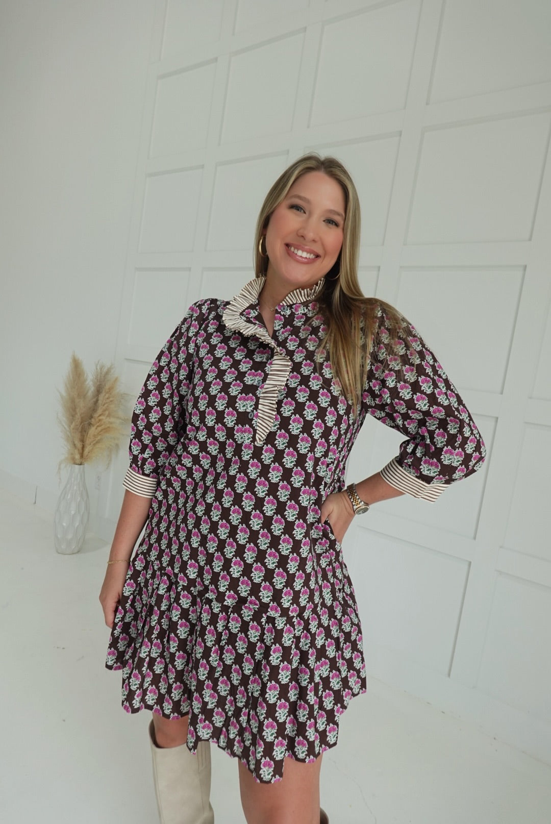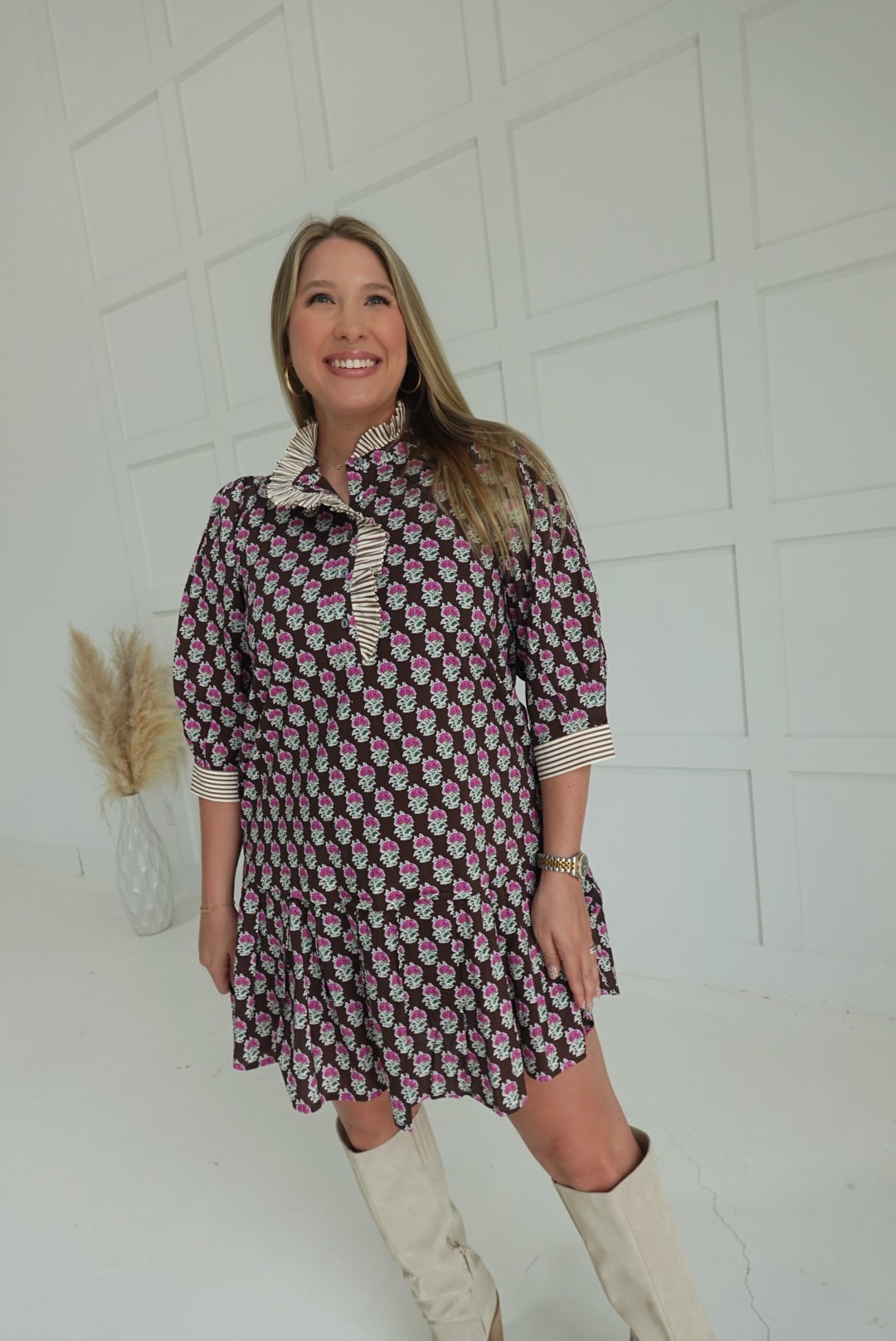 This floral printed mini dress features charming 3/4 sleeves and a delicate ruffle neckline that adds a touch of elegance. The half button-down front offers easy wear, while the ruffle bottom tier creates a playful, feminine silhouette. Perfect for casual outings or special occasions, it blends comfort with style seamlessly.