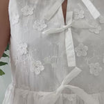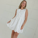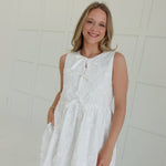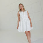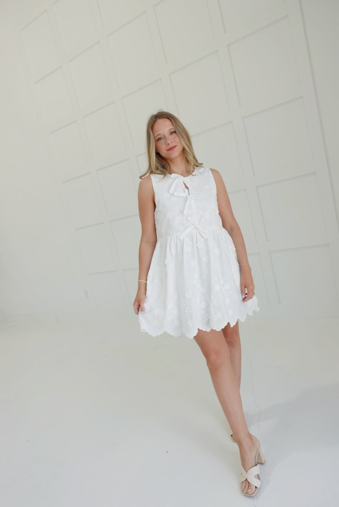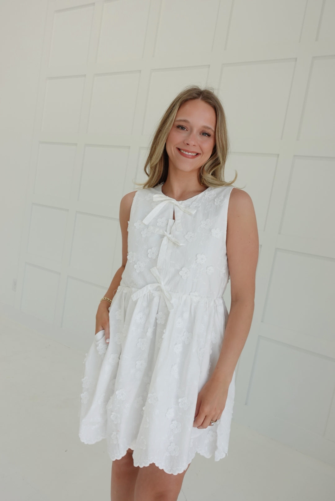 Get ready to turn heads with our playful Bushel + Peck Mini Dress! This solid off white dress features a sleeveless design with delicate floral appliqué and a charming scallop hem. The front bow tie closure adds a touch of whimsy, while the side pockets make it both stylish and functional. Perfect for any occasion, this lightweight and non-sheer dress is lined for your comfort. Say goodbye to boring outfits and hello to this quirky, fun dress!