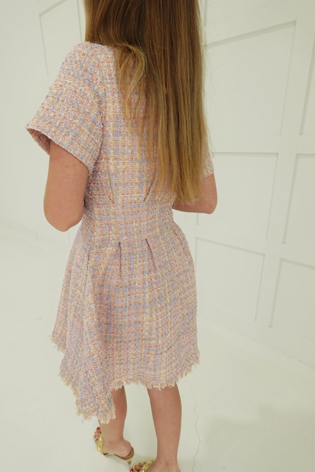 The Carolee Tweed Dress commands attention with its bold silhouette and refined tailoring. Crafted from textured tweed, this mini dress features a dramatically cinched waist that accentuates your curves and creates an hourglass effect. The structured fabric holds its shape beautifully, while the cropped length makes a fearless statement. Perfect for those ready to turn heads—pair it with heels and confidence for an unforgettable entrance.