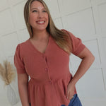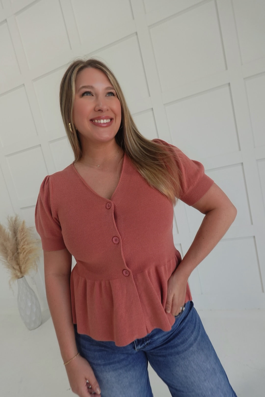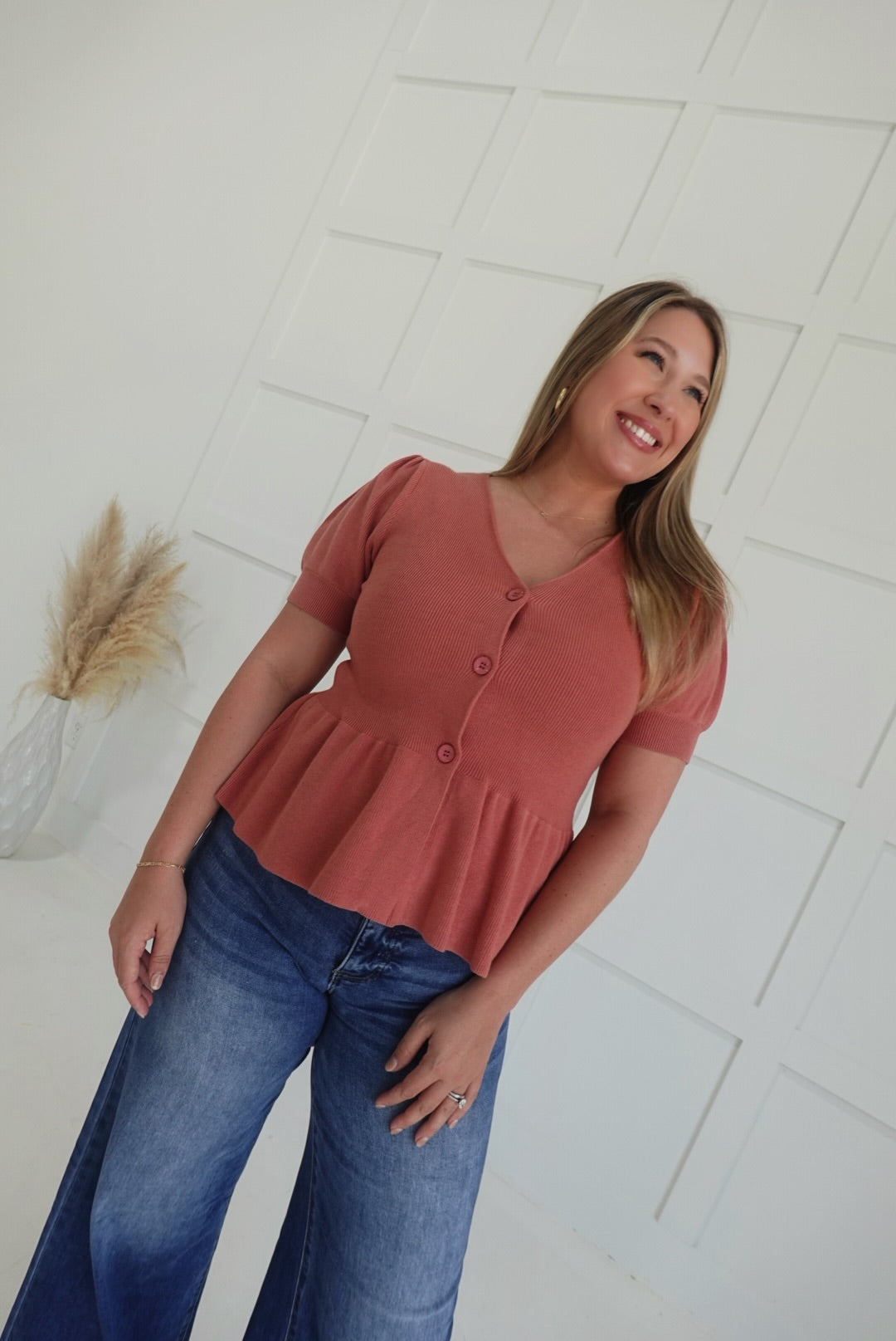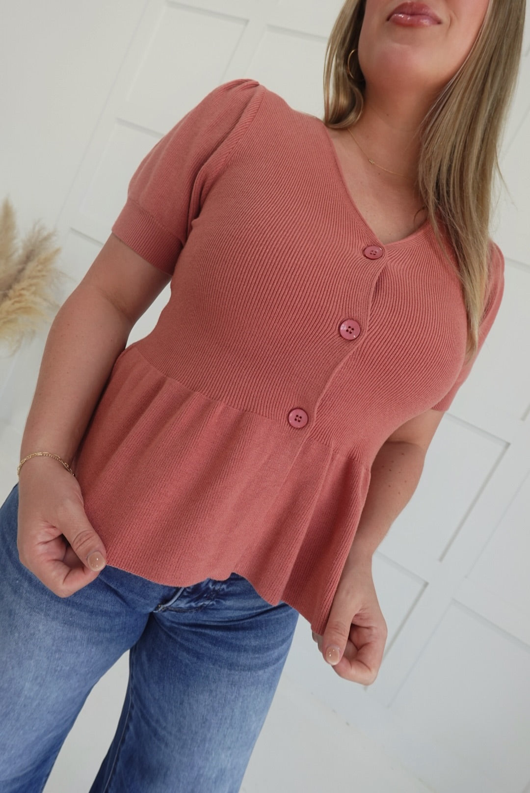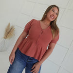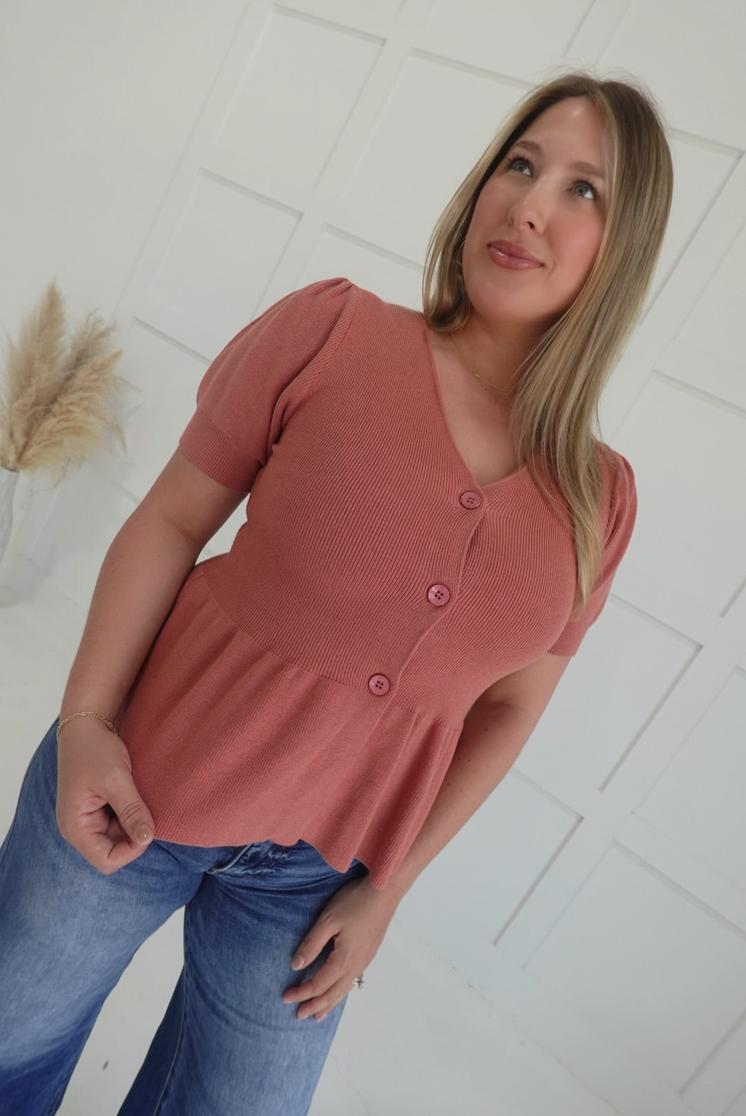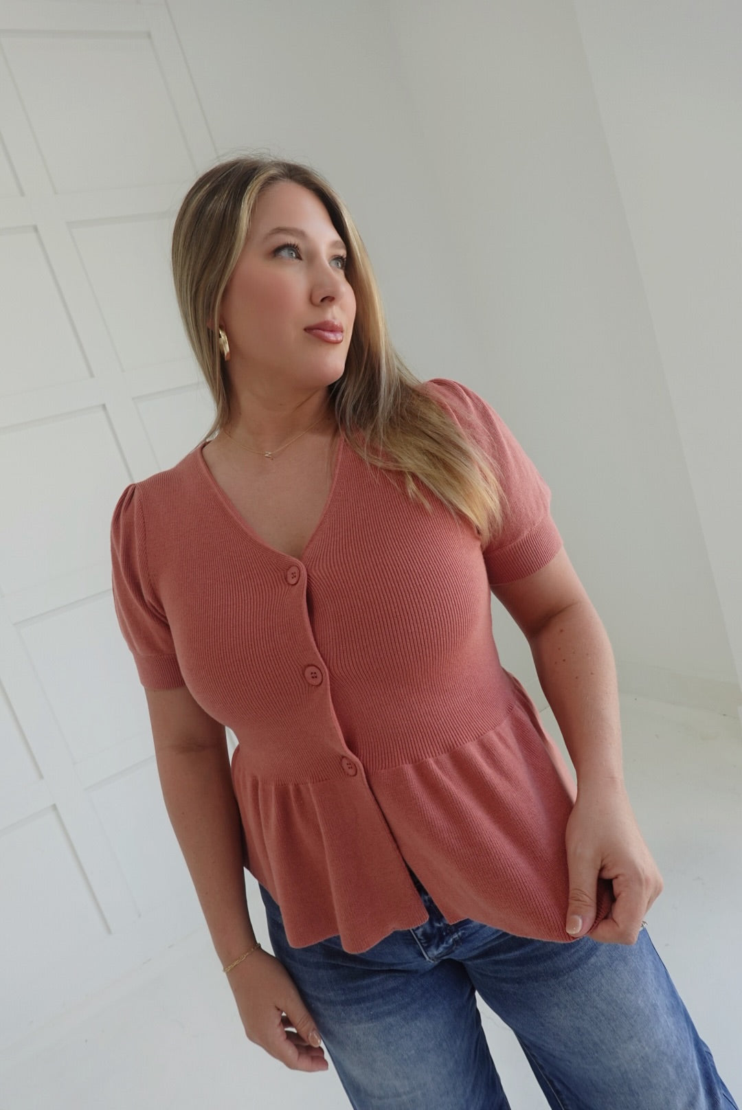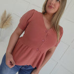 The Carolinas Peplum Top in Rose features a flattering ribbed texture and a button-up front for easy styling. Its peplum silhouette enhances your natural shape while offering a comfortable, supportive fit. Perfect for everyday wear, this top combines effortless style with gentle structure to keep you feeling confident all day long.