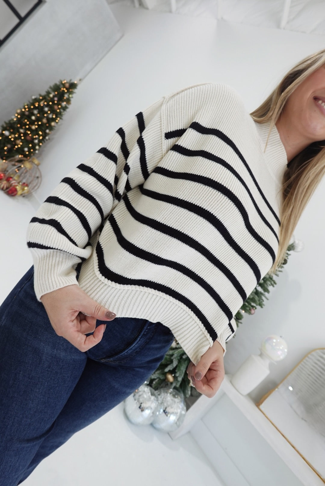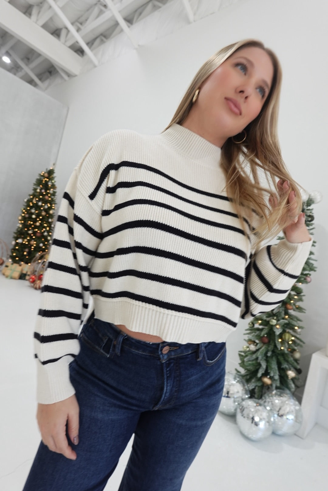 - Striped Sweater With Mock Neckline + Drop Shoulders