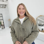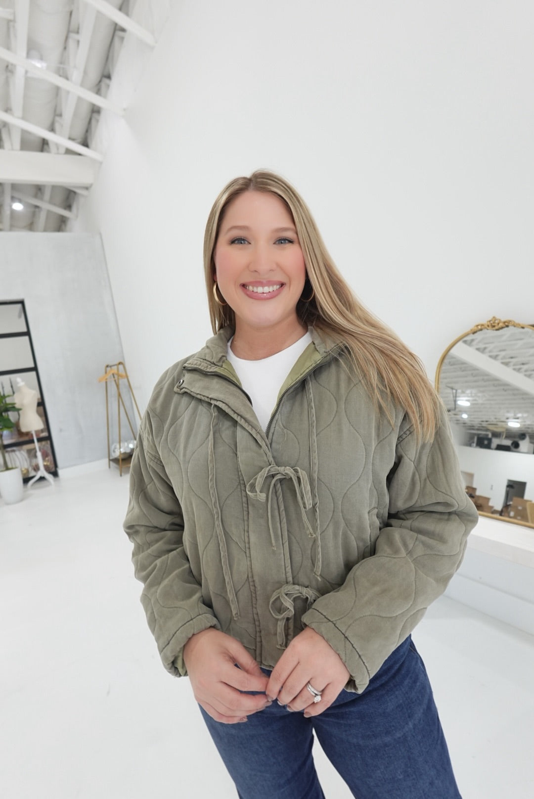 Stay cozy and confident in the Carsyn Quilted Jacket in Olive. Featuring a washed quilted design and a front tie closure, it offers both style and a comfortable, adjustable fit. Perfect for layering on chilly days, this jacket provides warmth without bulk, making it an easy go-to for your everyday wardrobe.