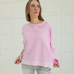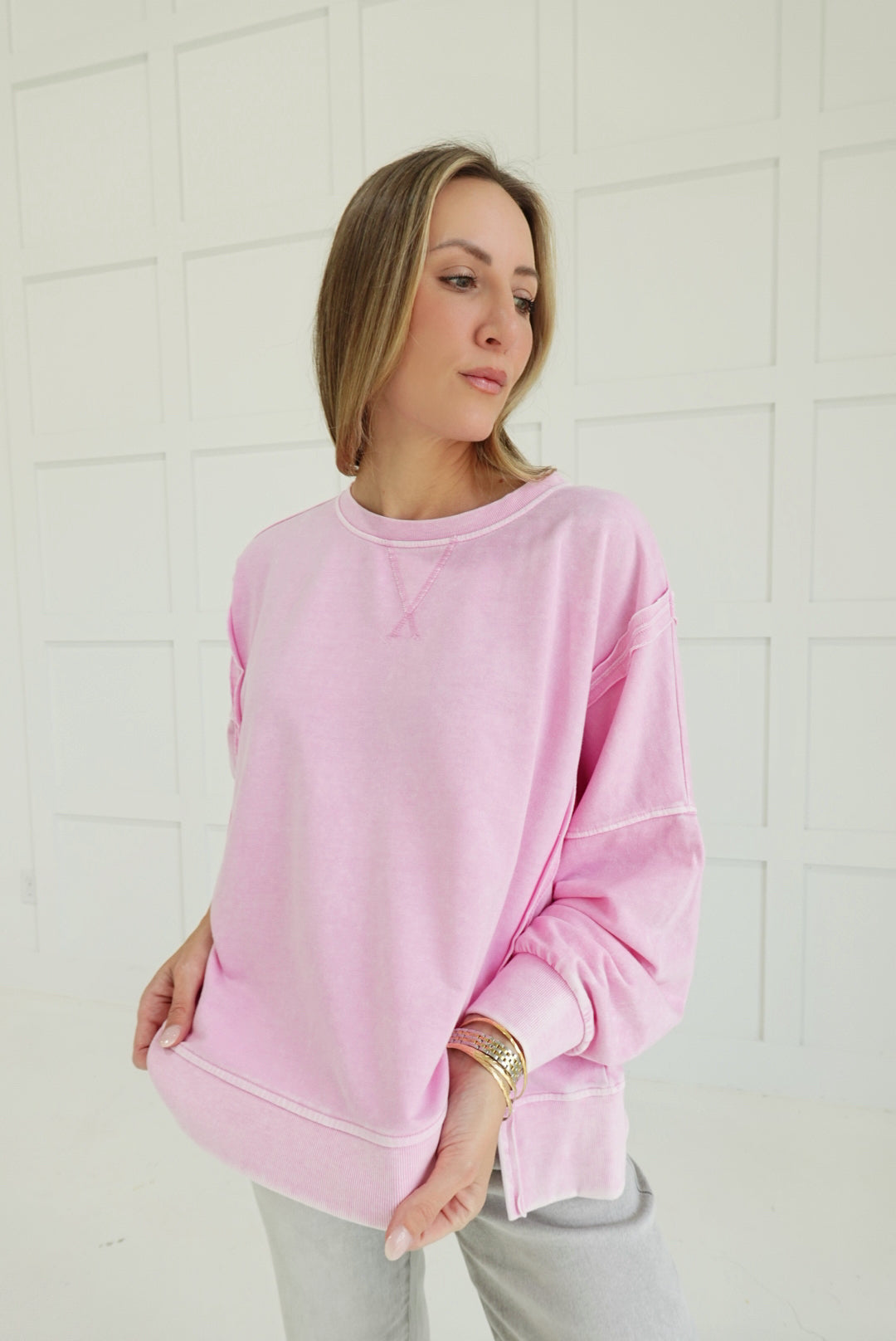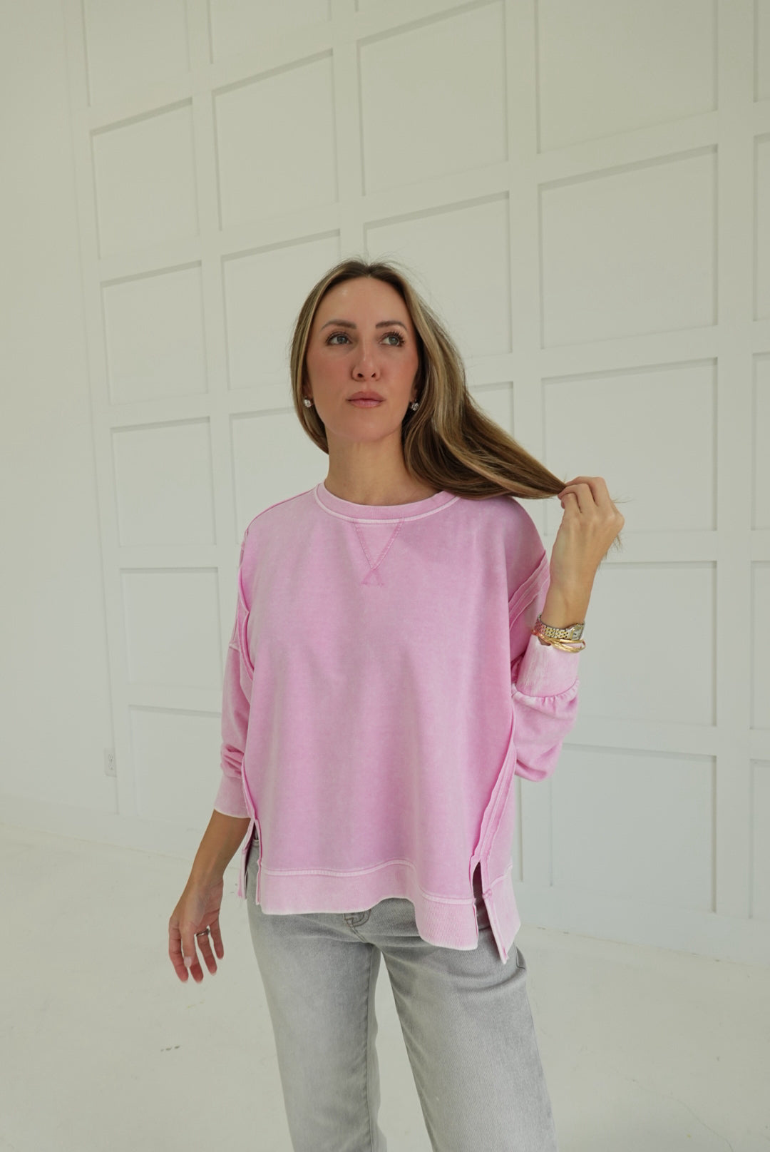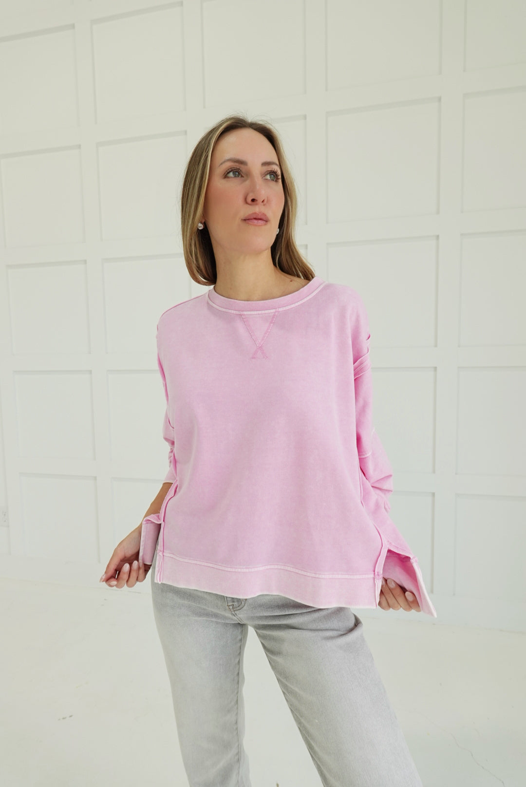 Embrace understated edge with this pastel pullover that refuses to play it safe. Raw exposed seams run throughout, creating deliberate texture and visual intrigue that separates this piece from ordinary basics. The split hem adds movement and attitude—a subtle rebellion against conventional design. Crafted for those who appreciate bold minimalism, this light pink pullover proves that daring style doesn't require loud colors or aggressive patterns. Layer it, tuck it, or wear it loose. Either way, you're making a statement.