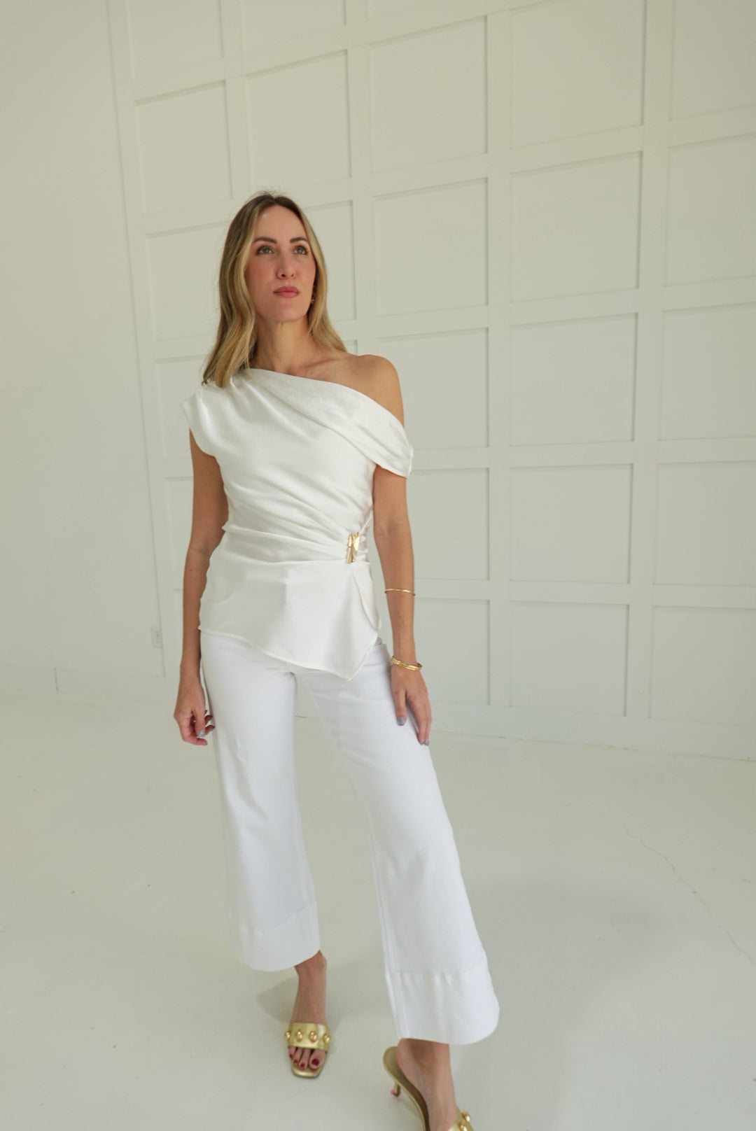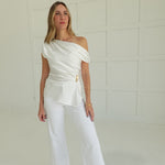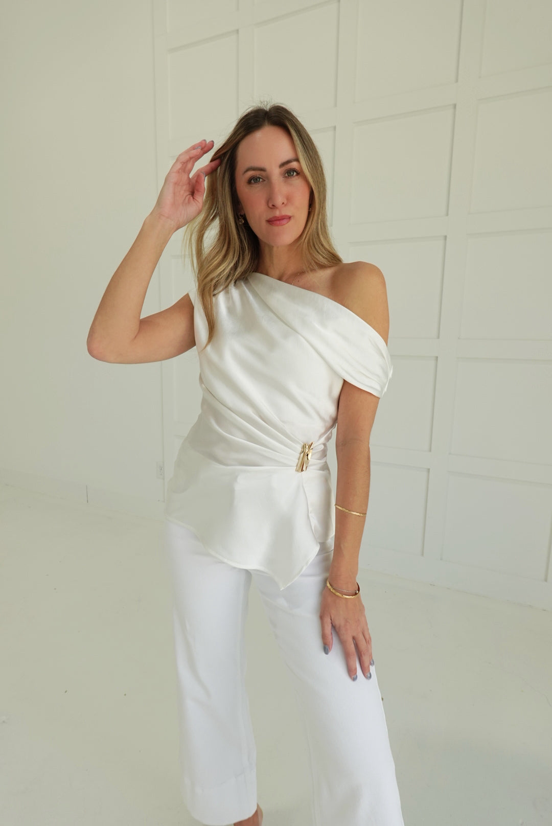 Dare to stand out in this striking asymmetrical satin blouse that commands attention from every angle. The draped shoulder creates an effortlessly bold silhouette, while delicate embellishment at the gathered waist adds unexpected sophistication. Luxurious satin fabric catches the light with every movement, making this piece perfect for those ready to make a statement. Whether styled for evening elegance or dressed down for confident everyday wear, the Celeste Satin Top delivers the kind of edge that turns heads.